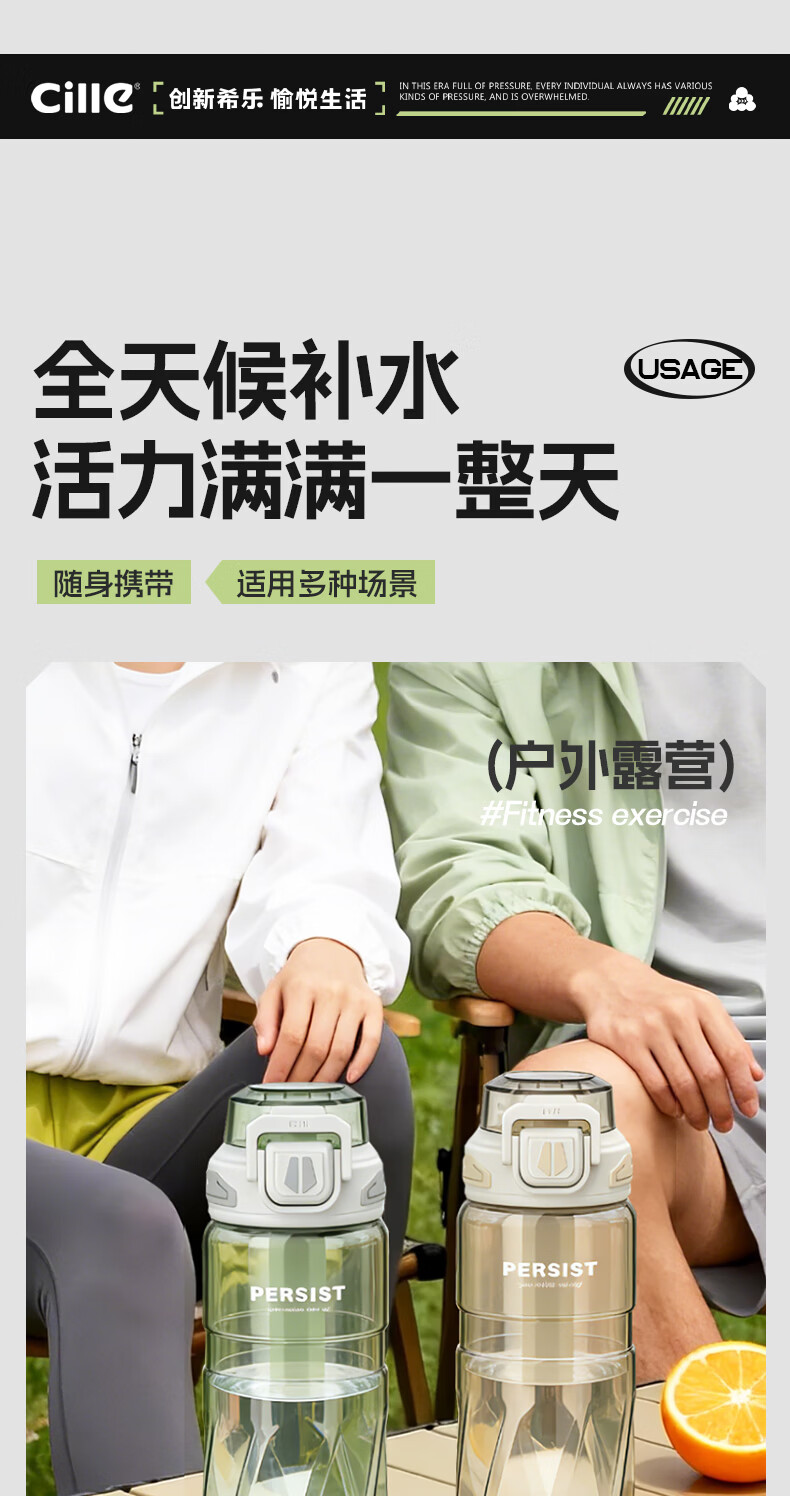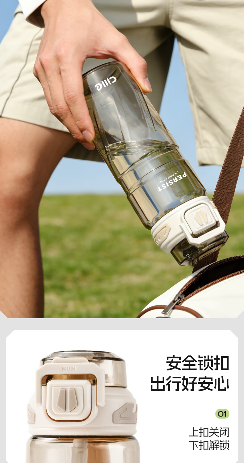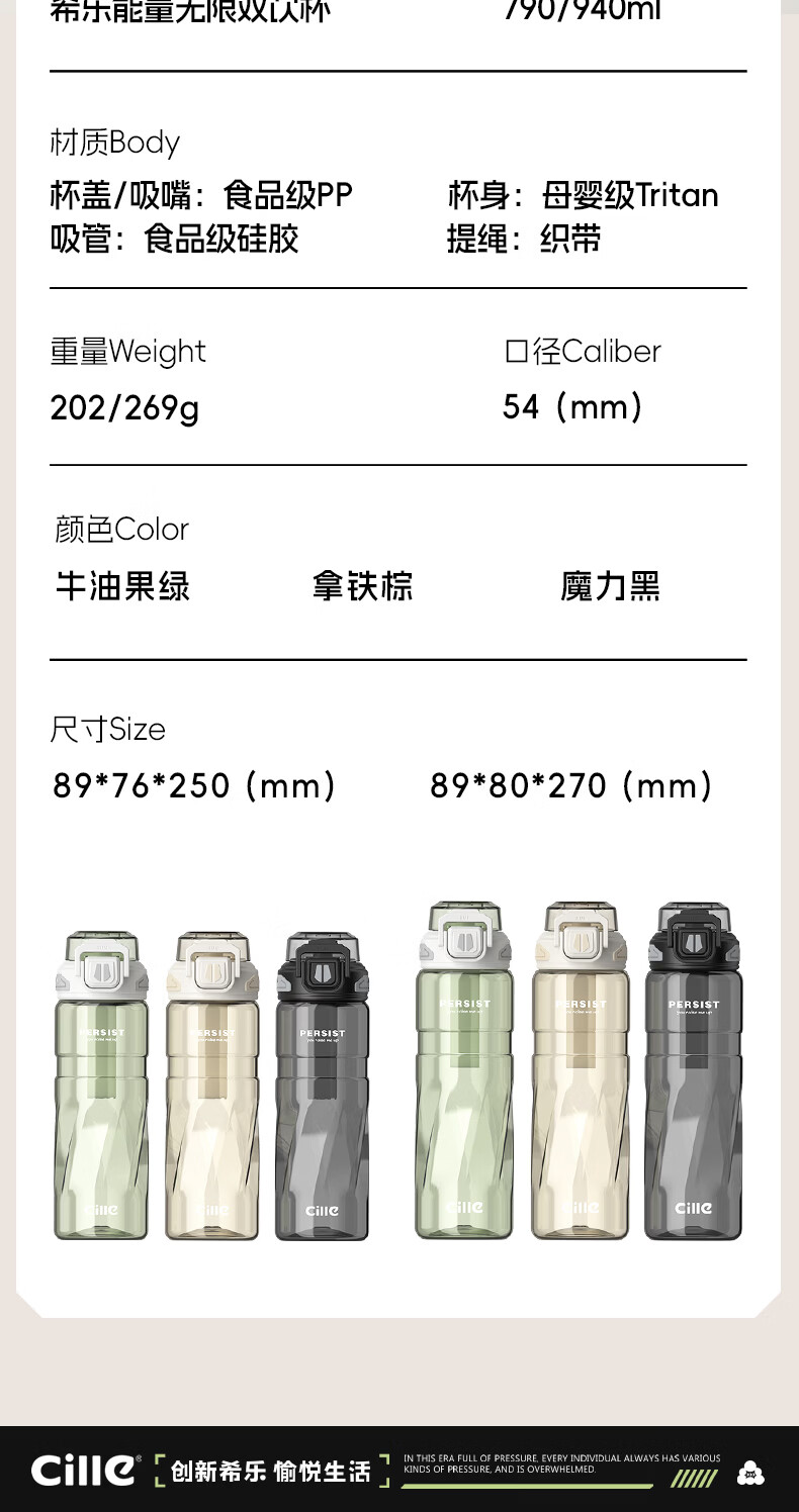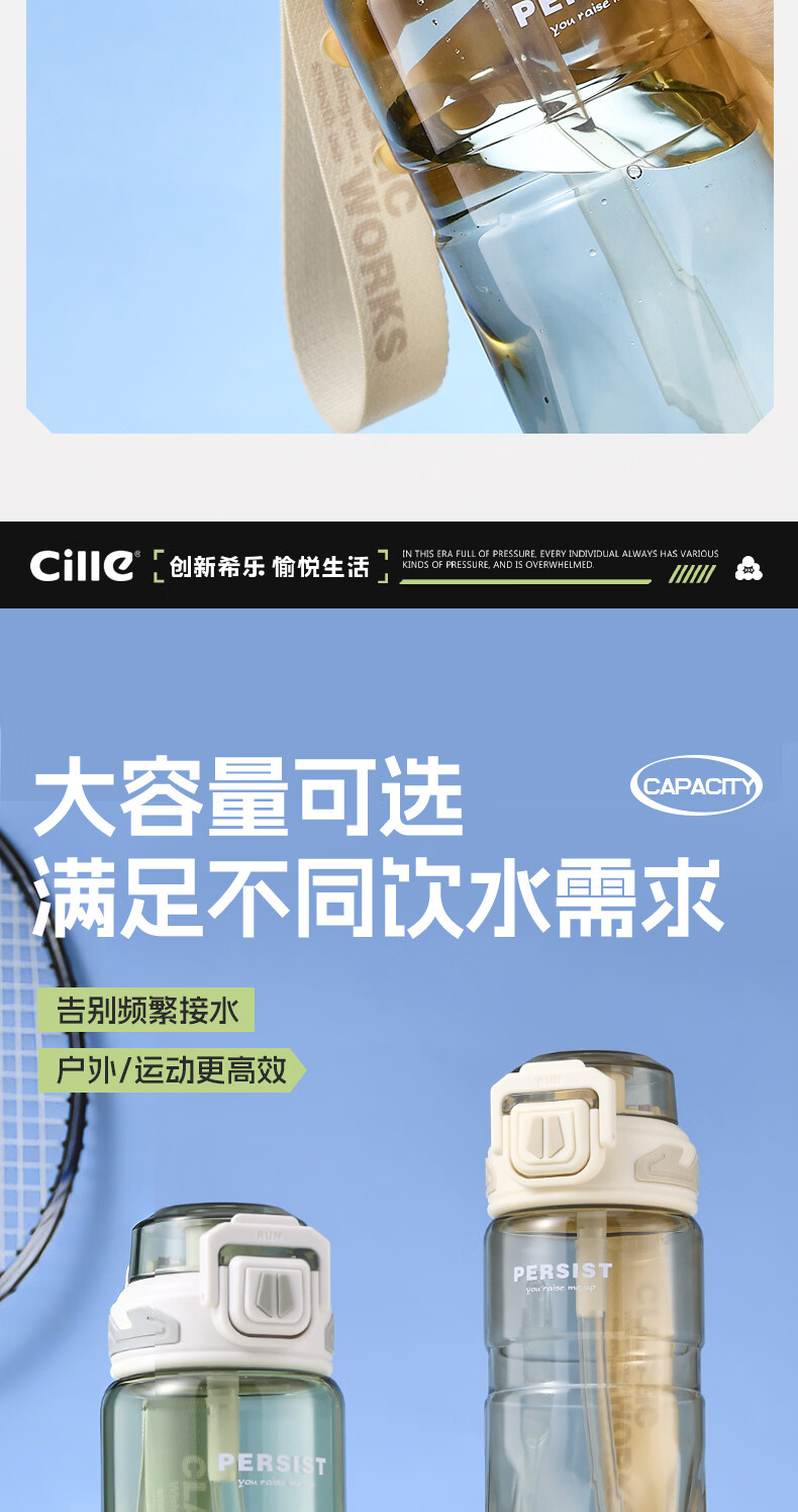希乐(cille)运动水杯男女学生户外健身大容量Tritan耐高温加厚双饮便携杯子