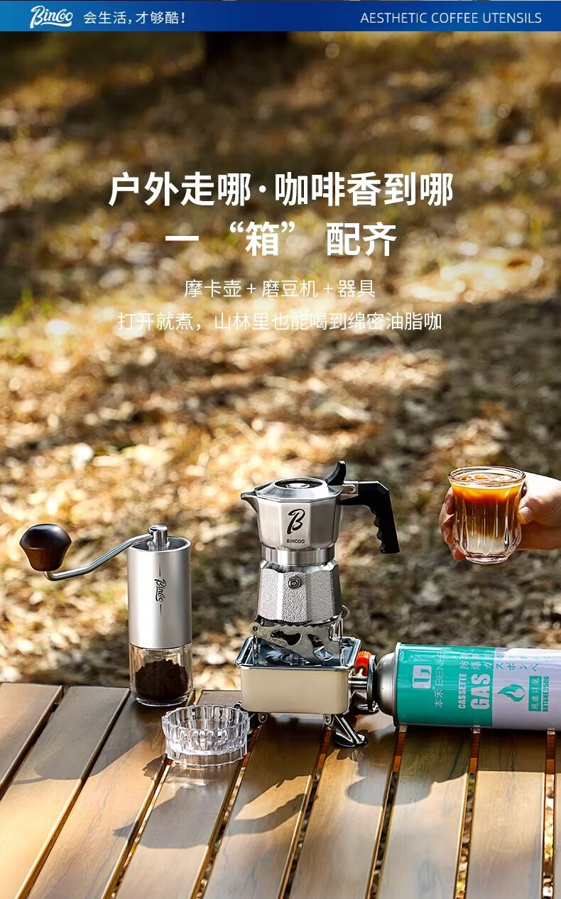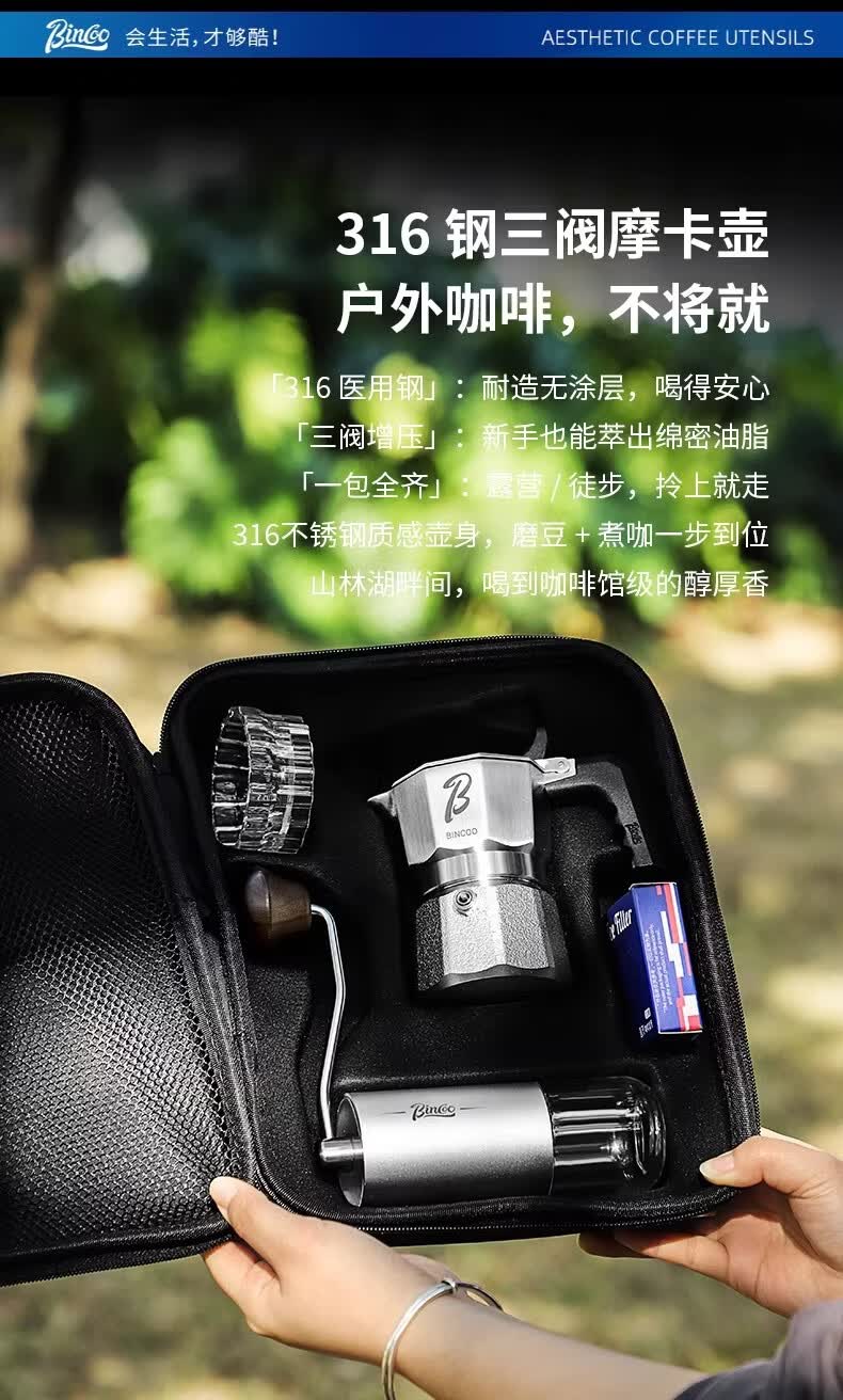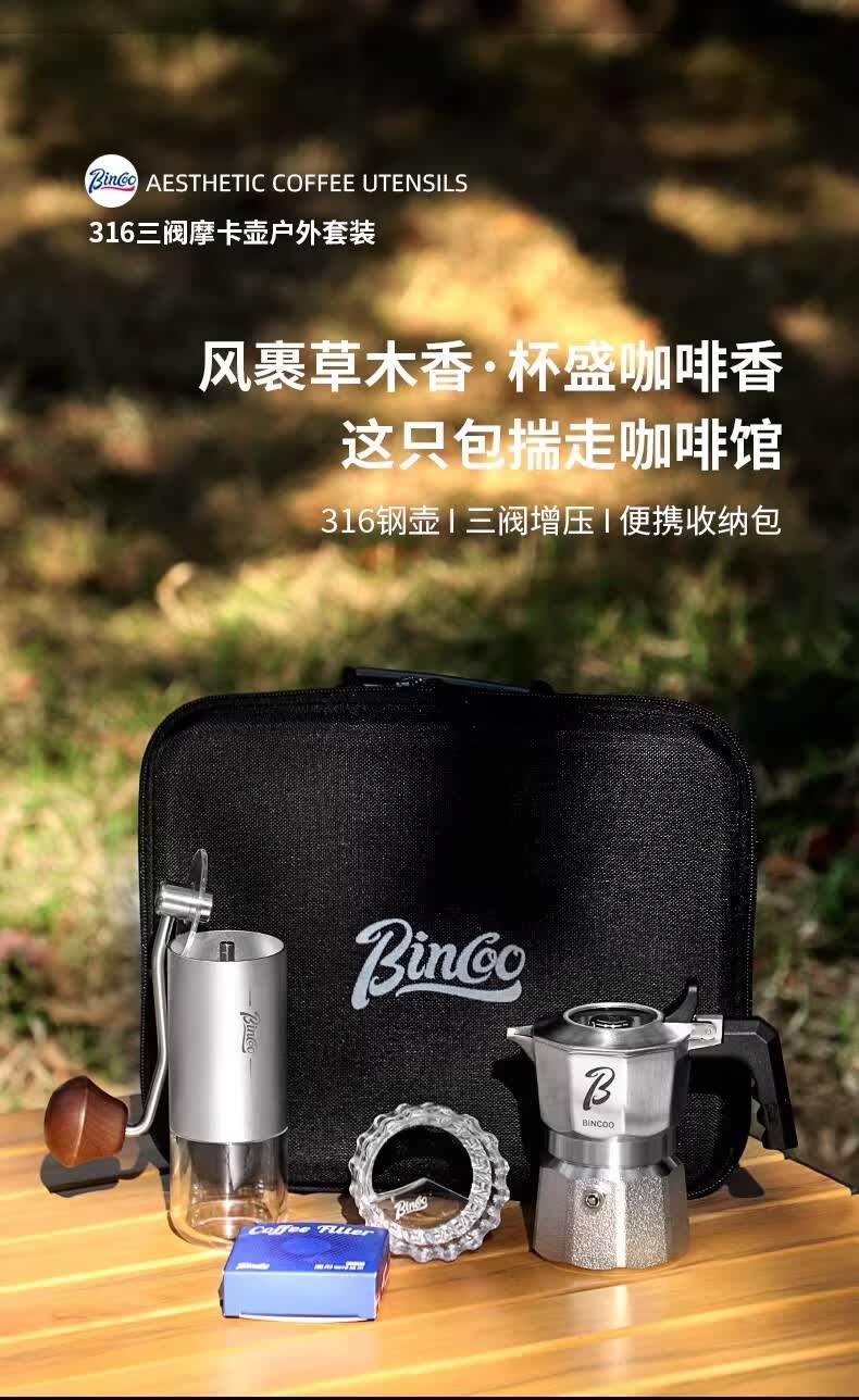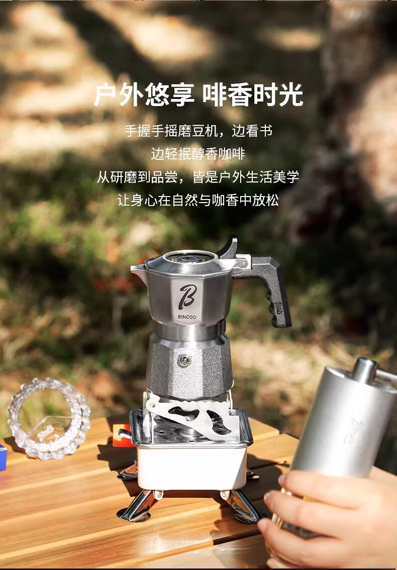 Bincoo三阀316不锈钢摩卡壶套装野营露营户外煮咖啡装备带收纳包便携 一人份【幻神手磨7件套】 三阀