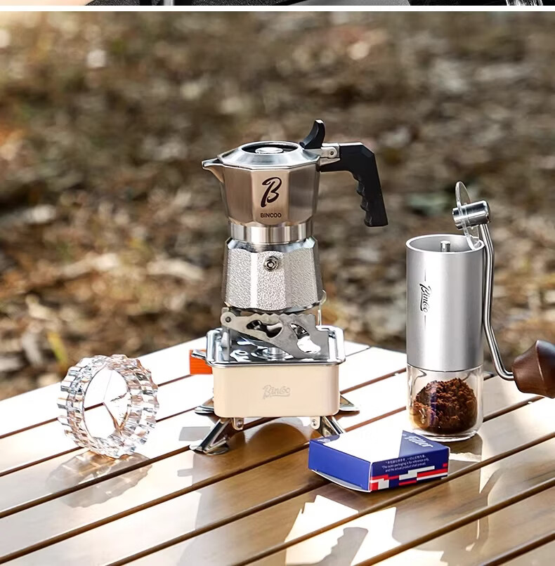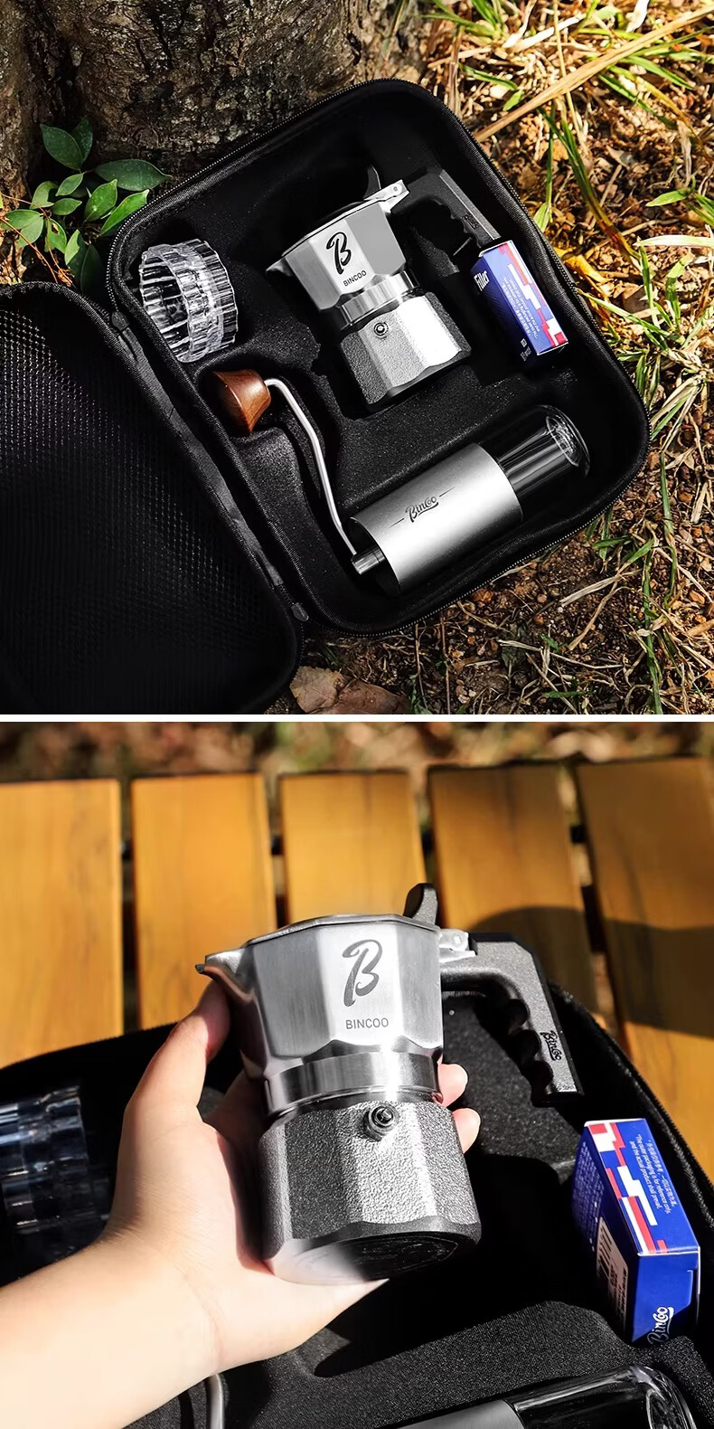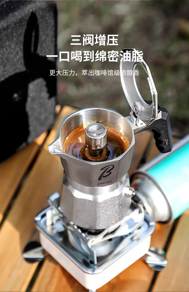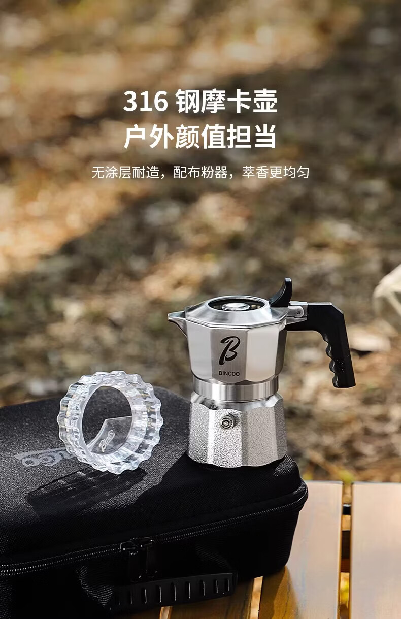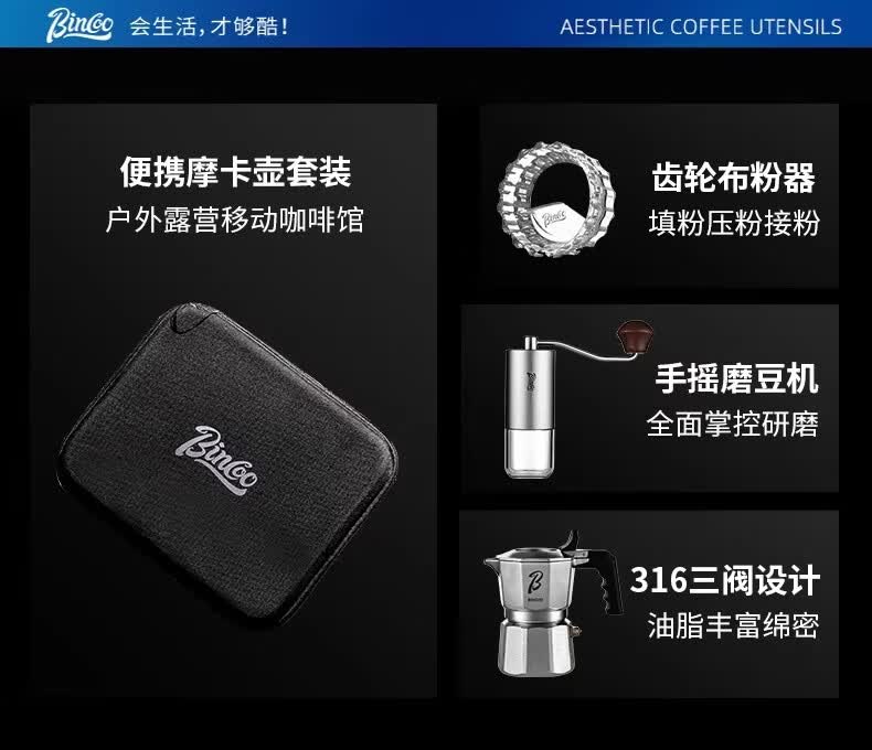 Bincoo三阀316不锈钢摩卡壶套装野营露营户外煮咖啡装备带收纳包便携 一人份【幻神手磨7件套】 三阀