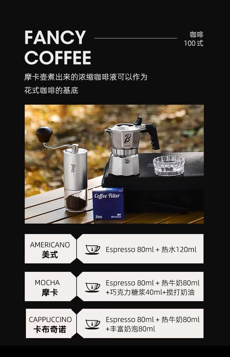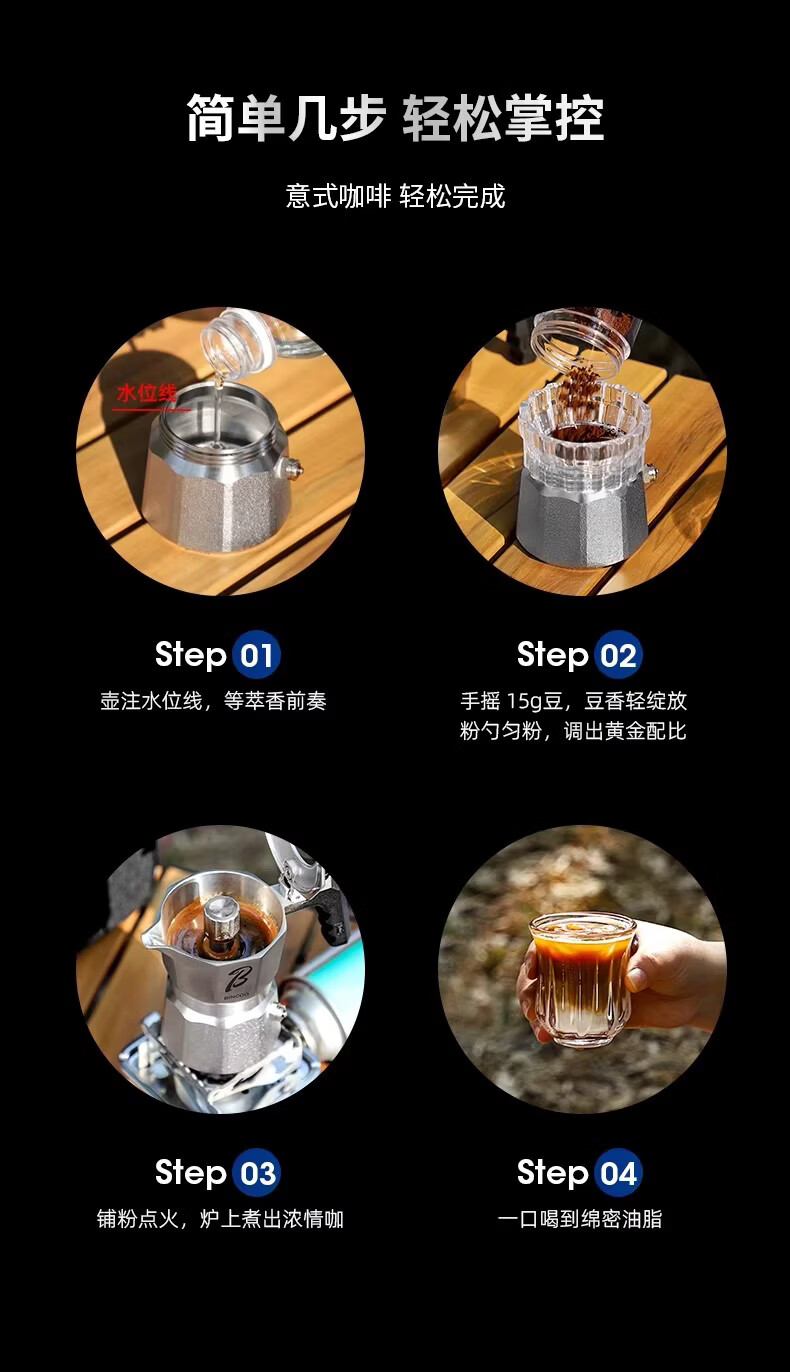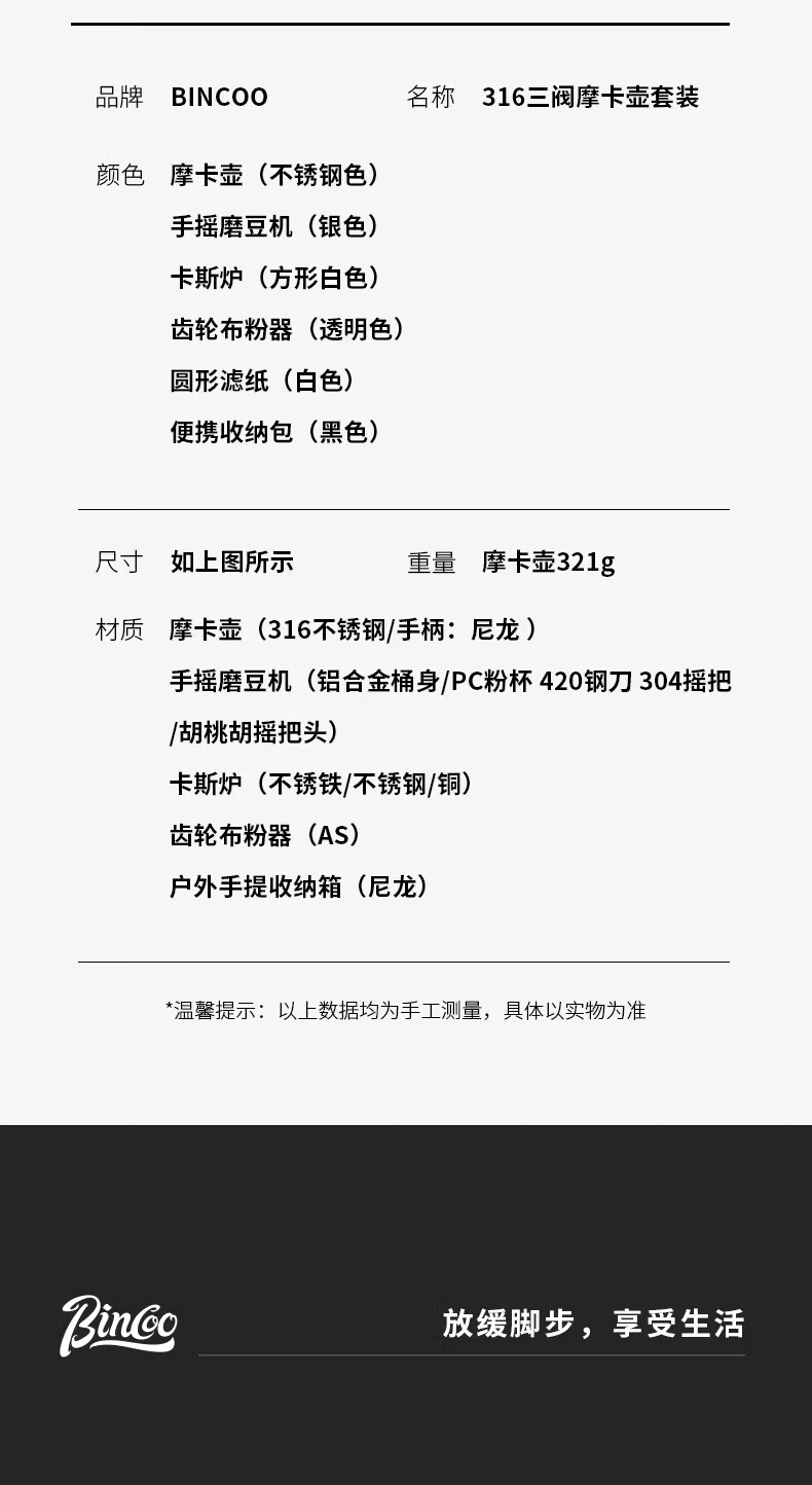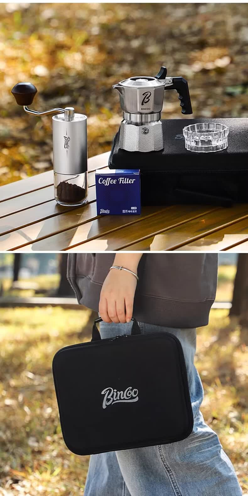 Bincoo三阀316不锈钢摩卡壶套装野营露营户外煮咖啡装备带收纳包便携 一人份【幻神手磨7件套】 三阀