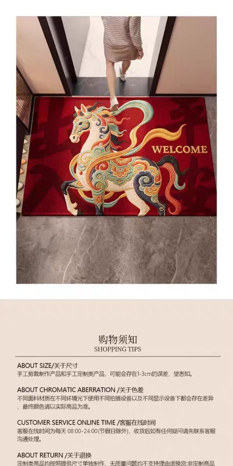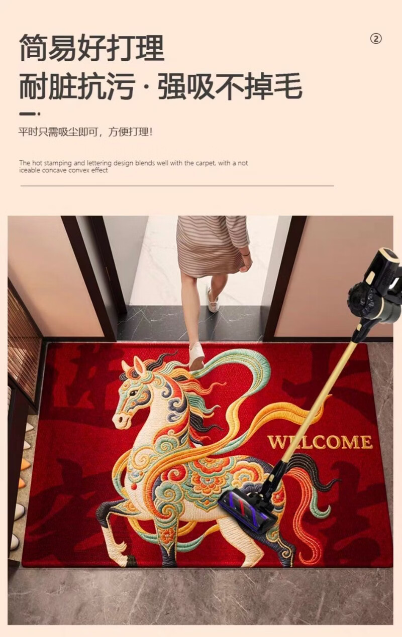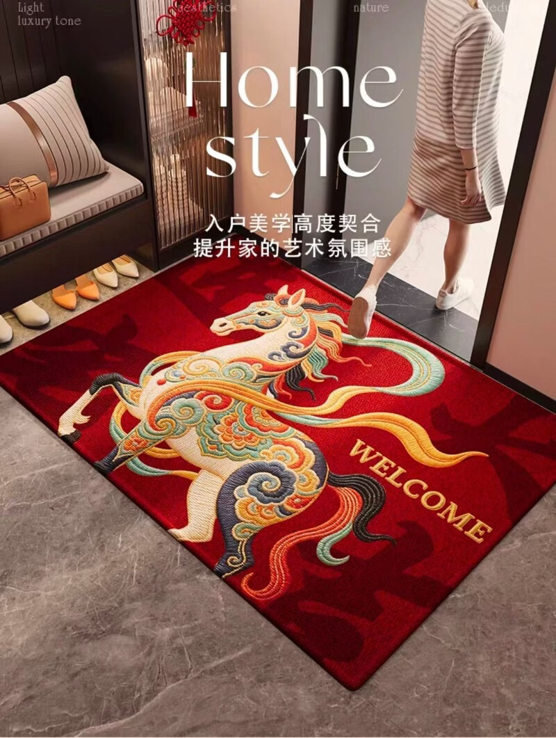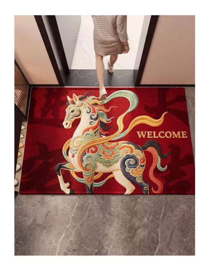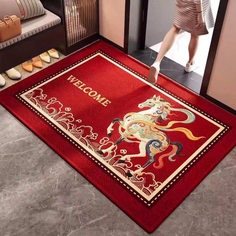 高品质红色2026新款入户门地垫进门玄关脚垫马年喜庆防滑地垫客厅 红锦跃马-欢迎 50*80cm