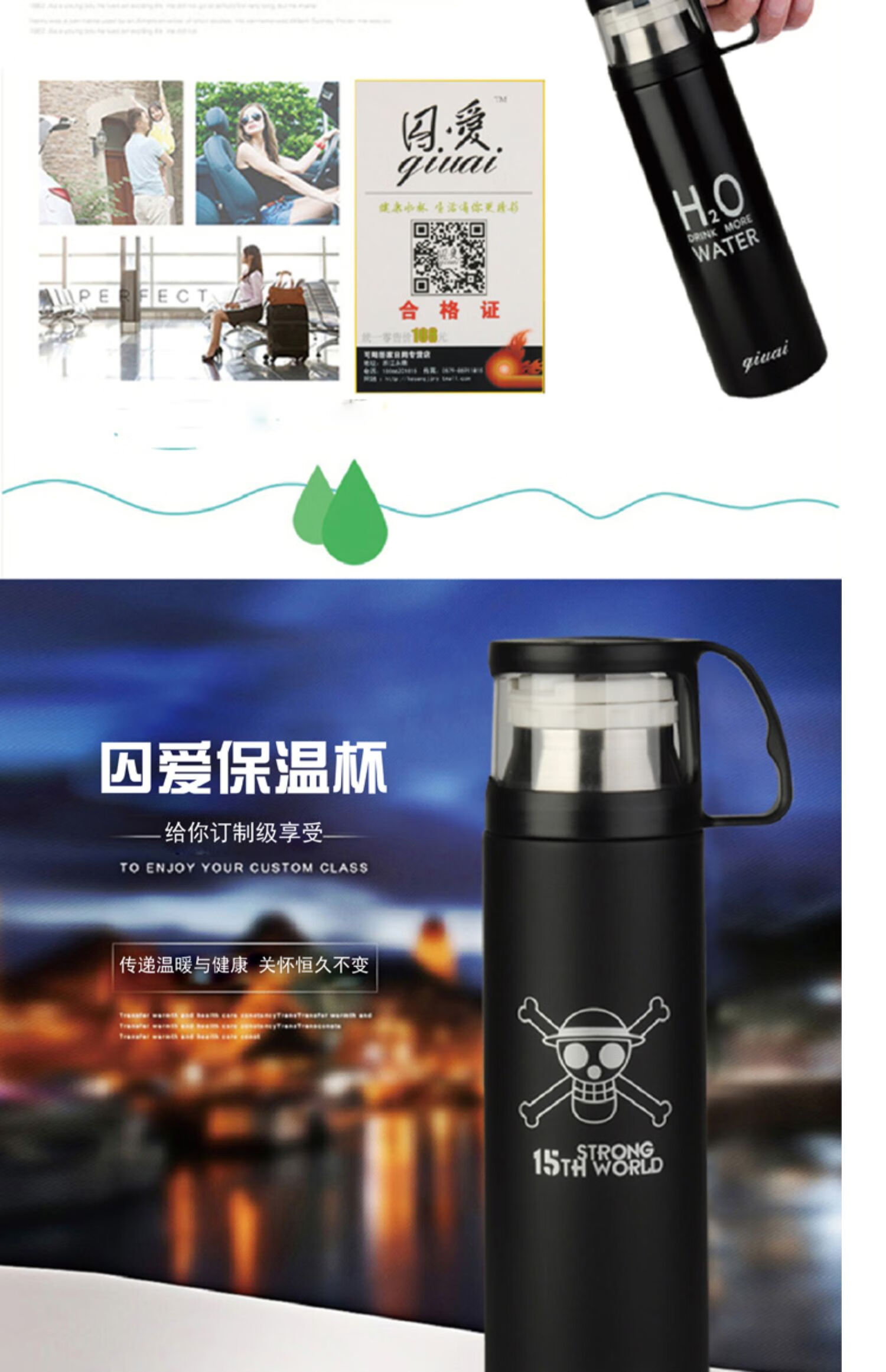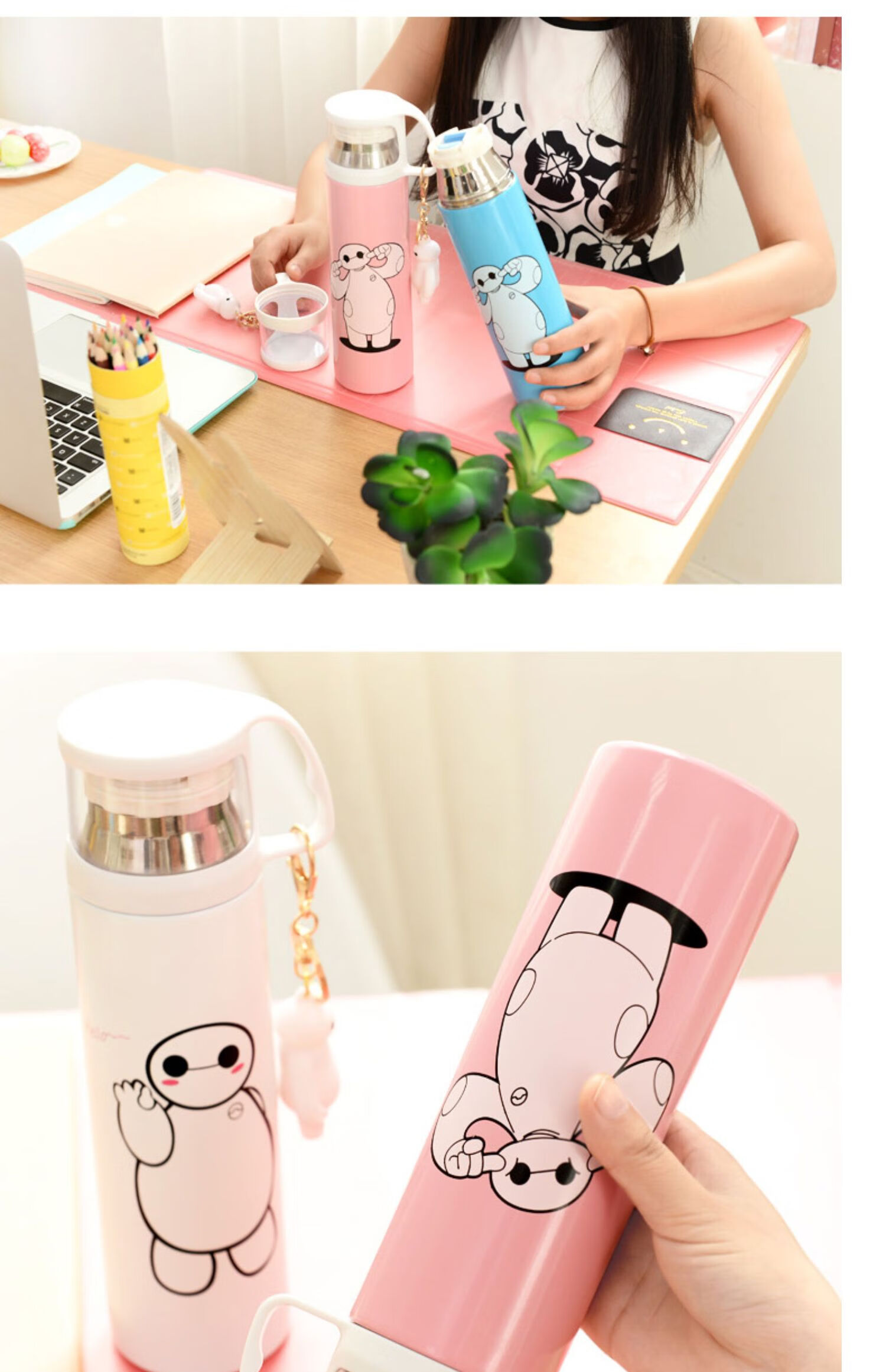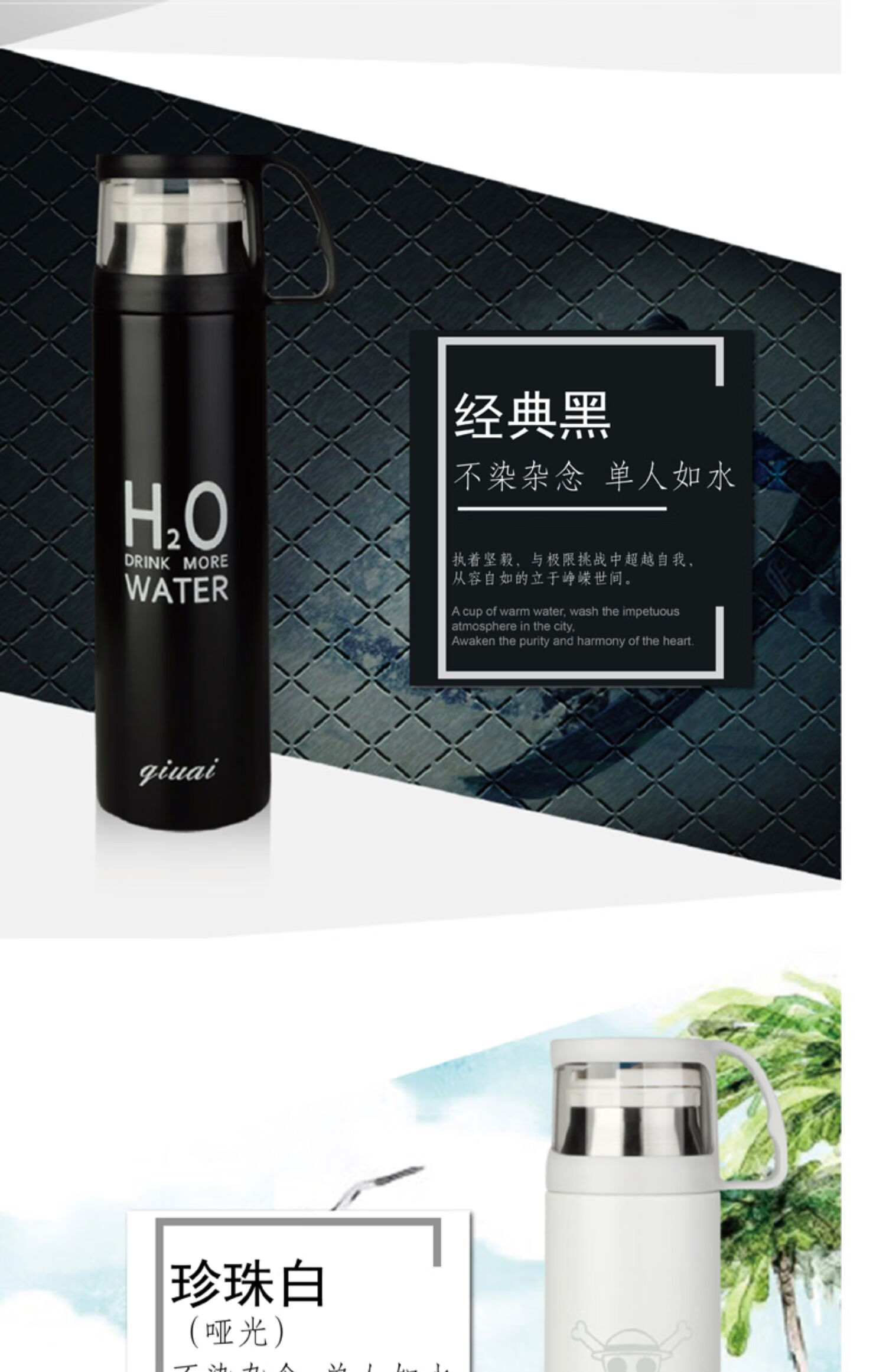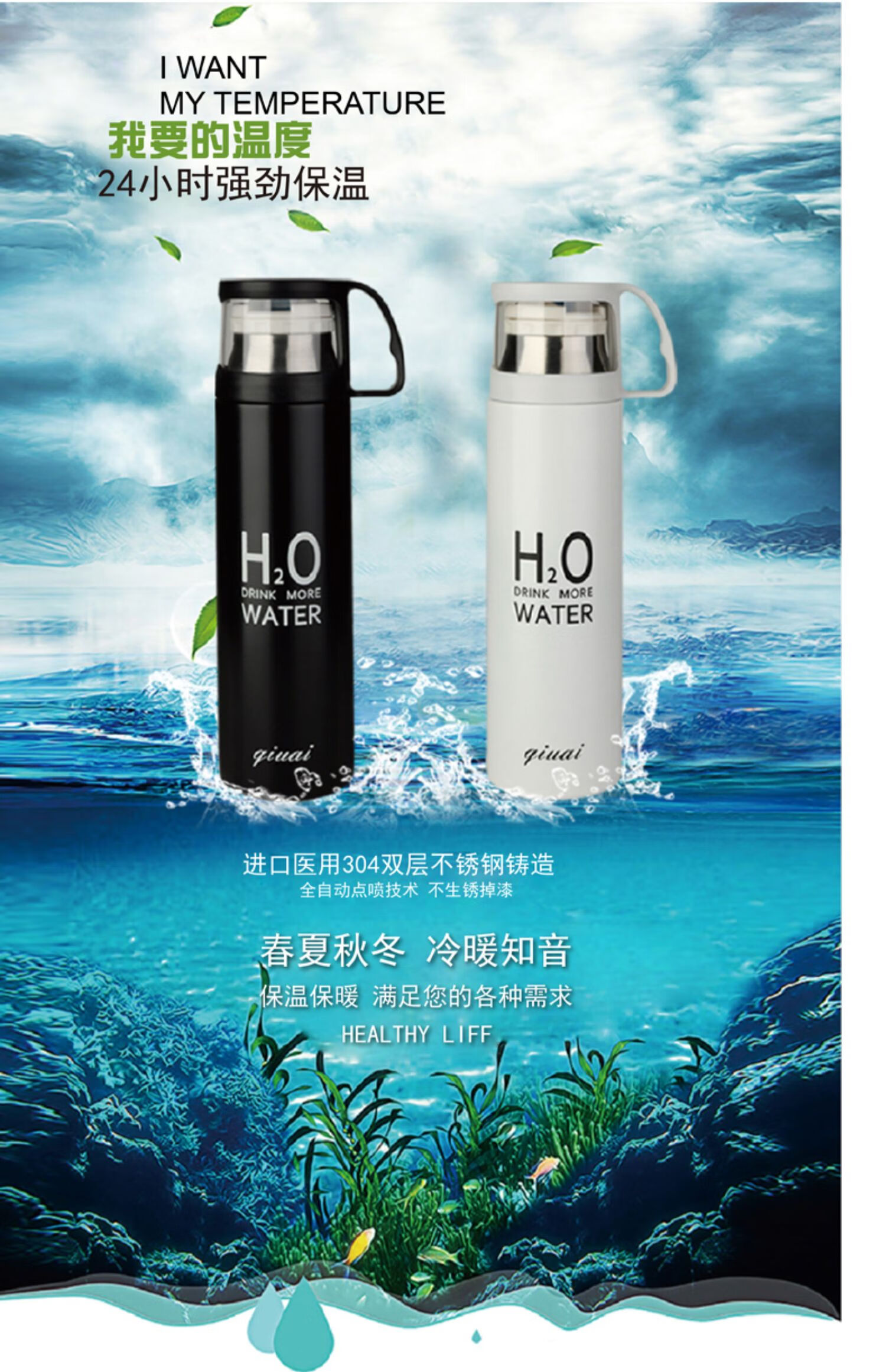 保温杯女带盖可喝水 学可爱带杯子男带杯盖大容量个性简约有盖 350ml蓝小白+杯刷(无挂件)