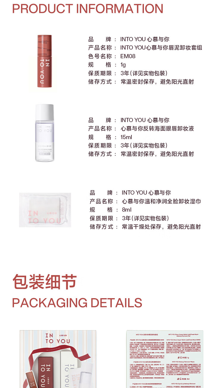 屈臣氏INTO YOU心慕与你唇泥卸妆套组 EM08 1g+卸妆湿巾8ml+眼唇卸妆液15ml