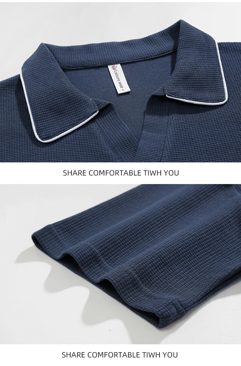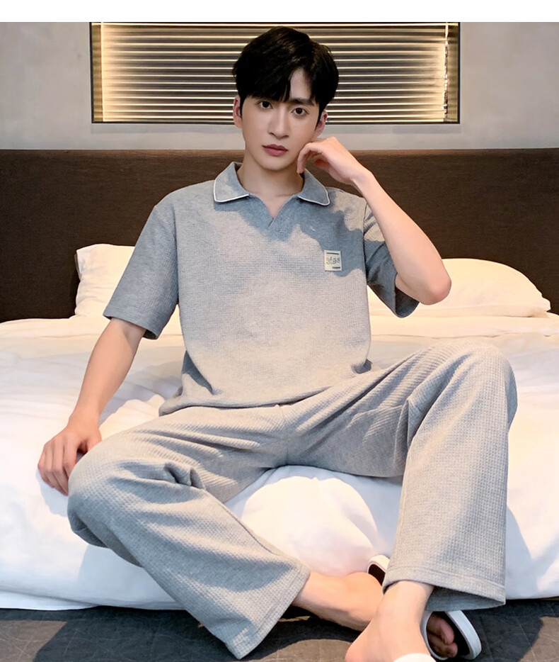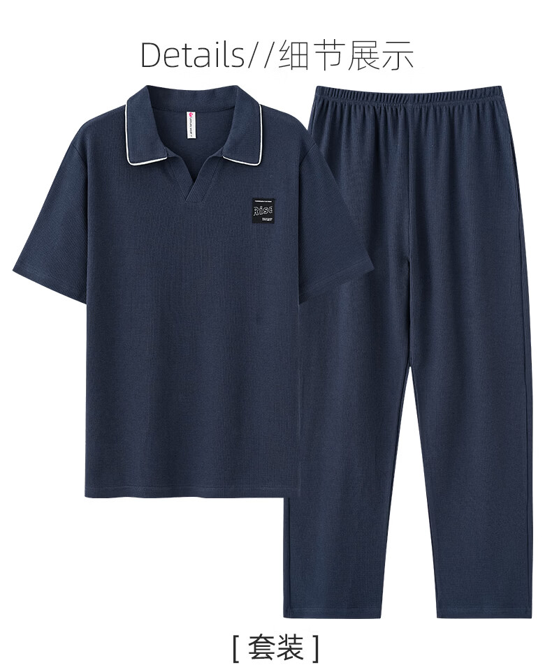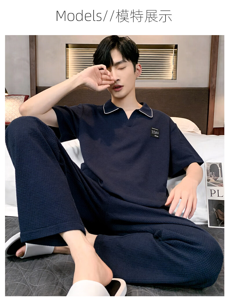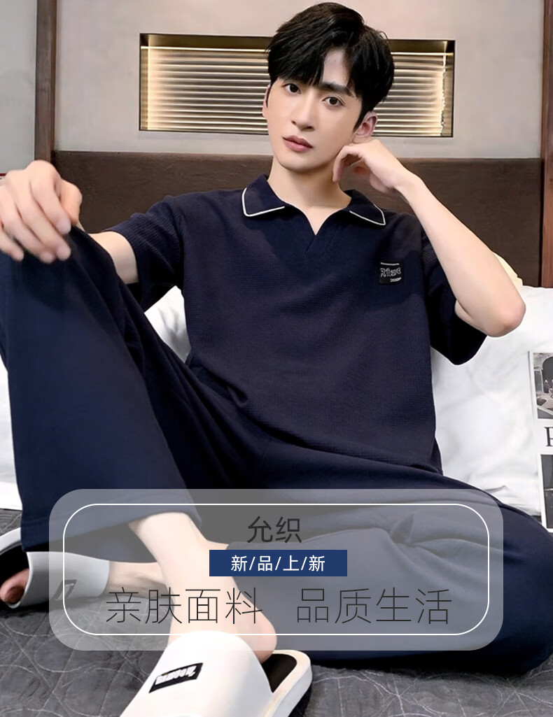 允织华夫格纯棉睡衣男士夏季短袖长裤宽松大码夏天薄款男款家居服套装 2404-深蓝 L (170) :建议110-140斤穿着