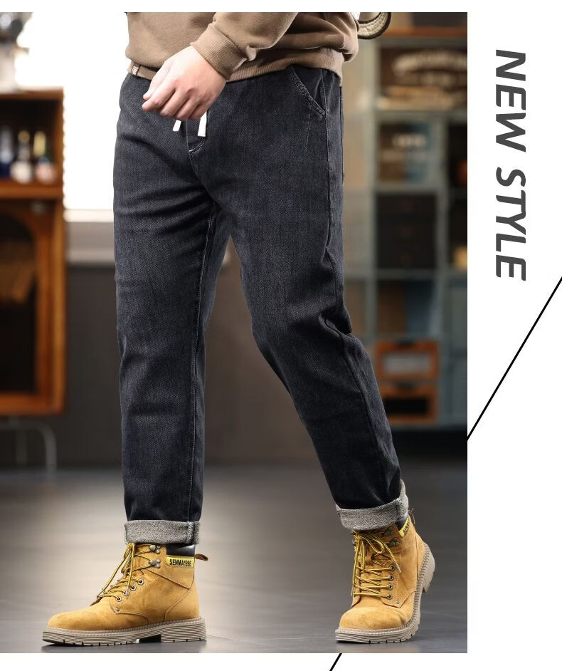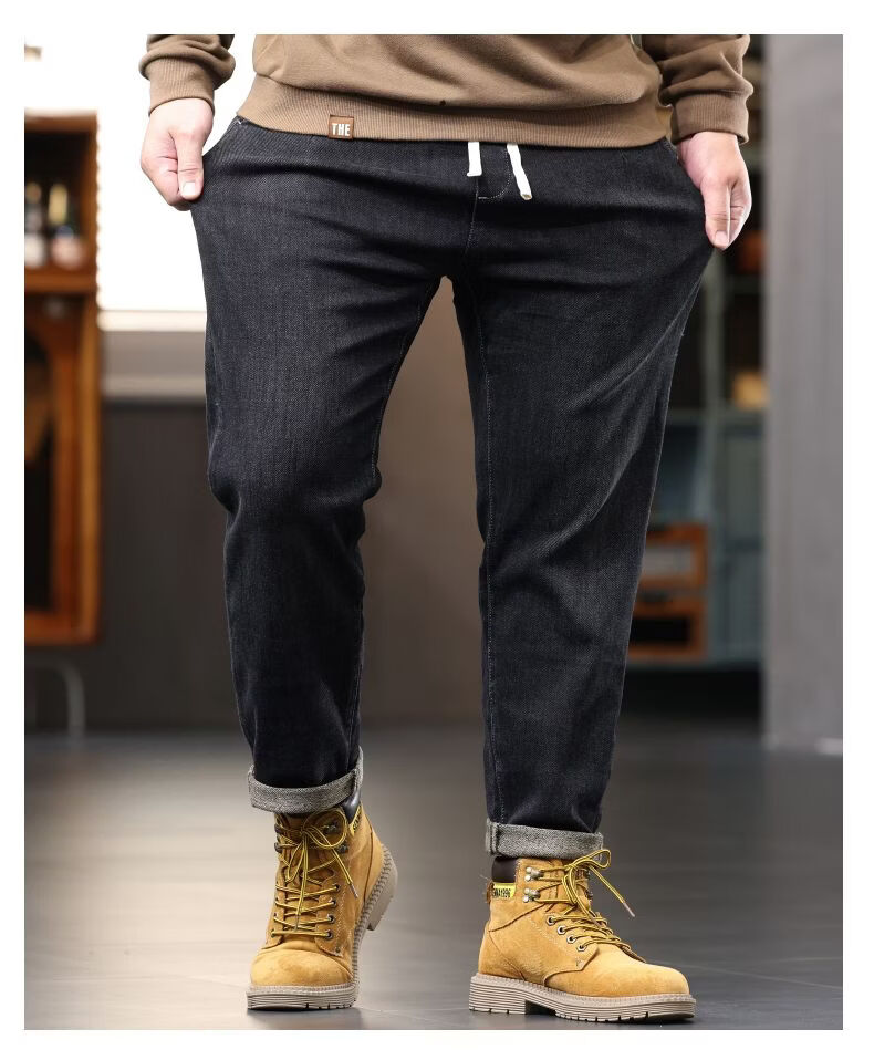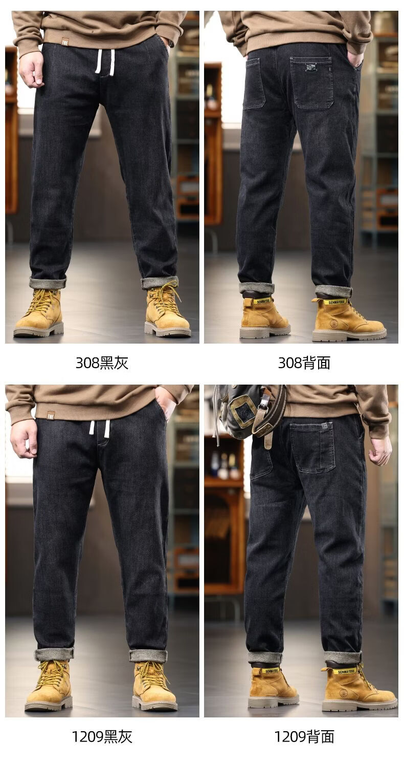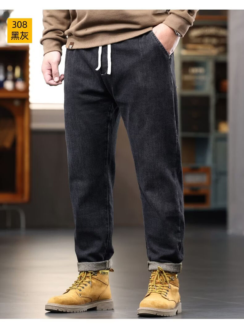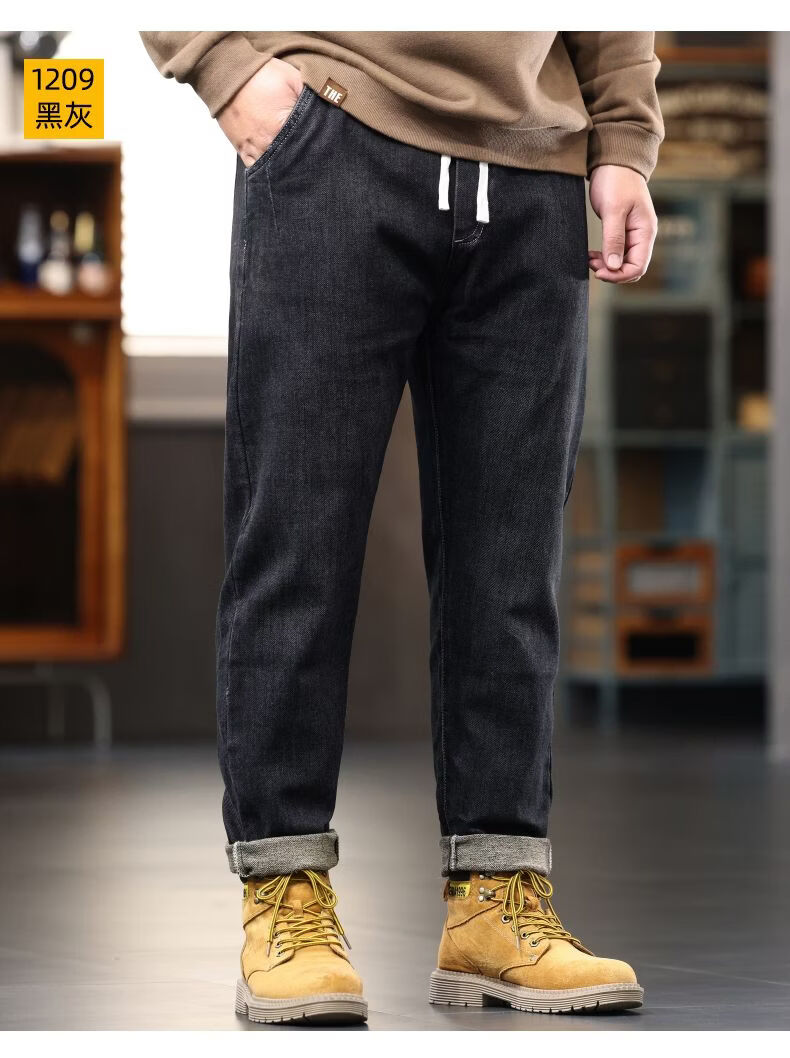 啄木鸟大码胖子松紧腰牛仔裤男秋冬加厚宽松直筒休闲百搭潮流潮牌男裤子 黑灰 1209 M