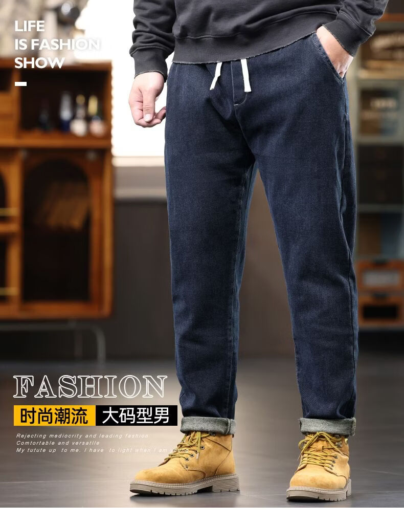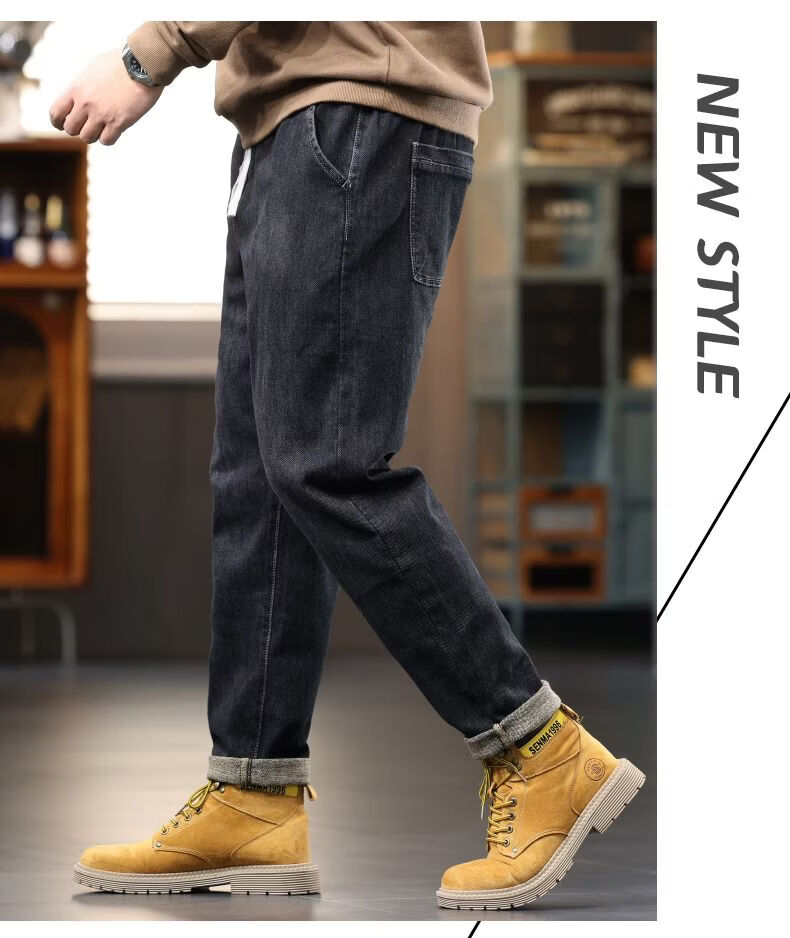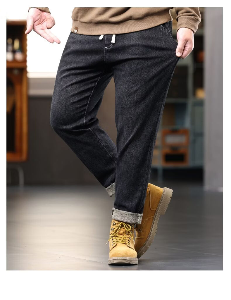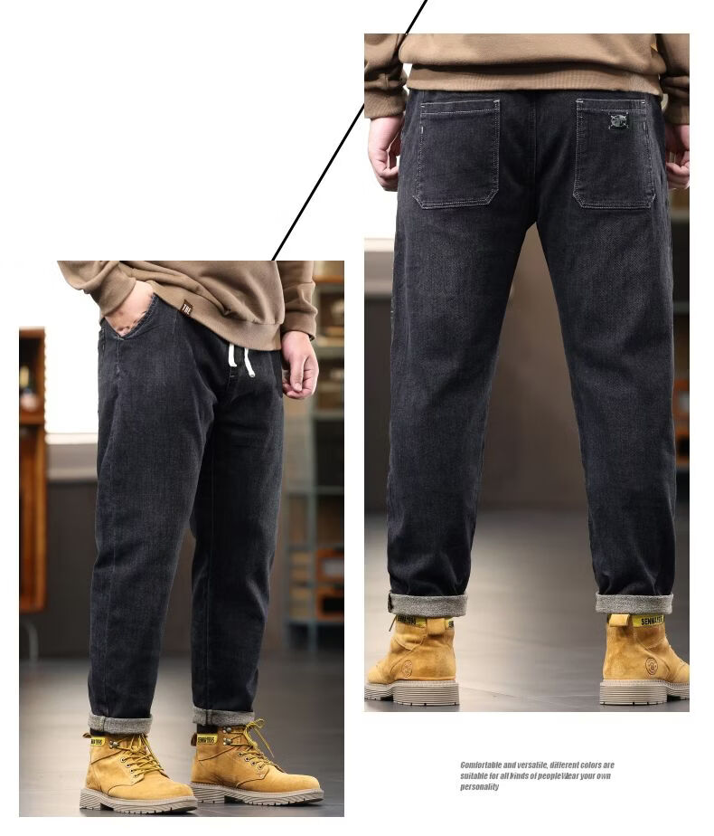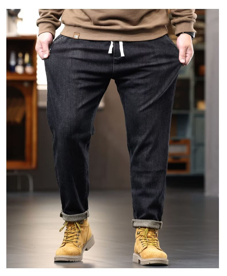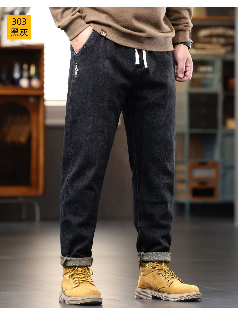啄木鸟大码胖子松紧腰牛仔裤男秋冬加厚宽松直筒休闲百搭潮流潮牌男裤子 黑灰 1209 M