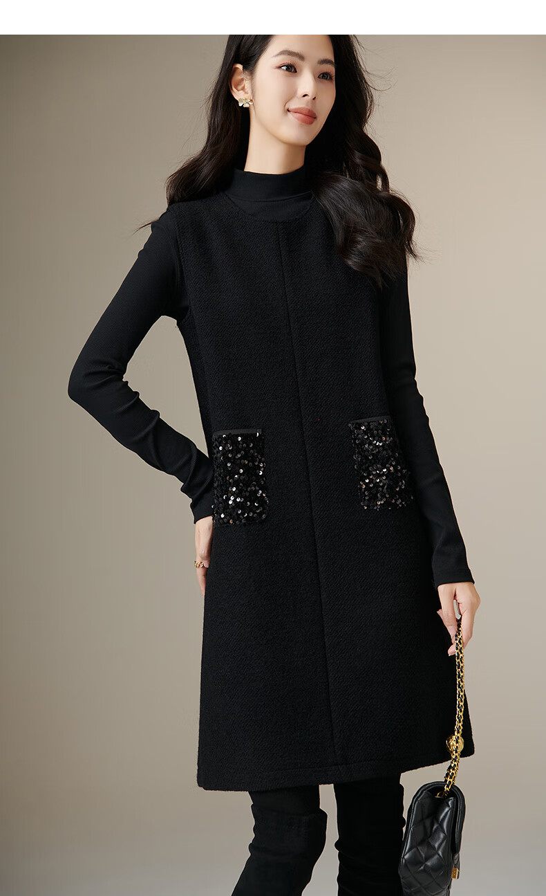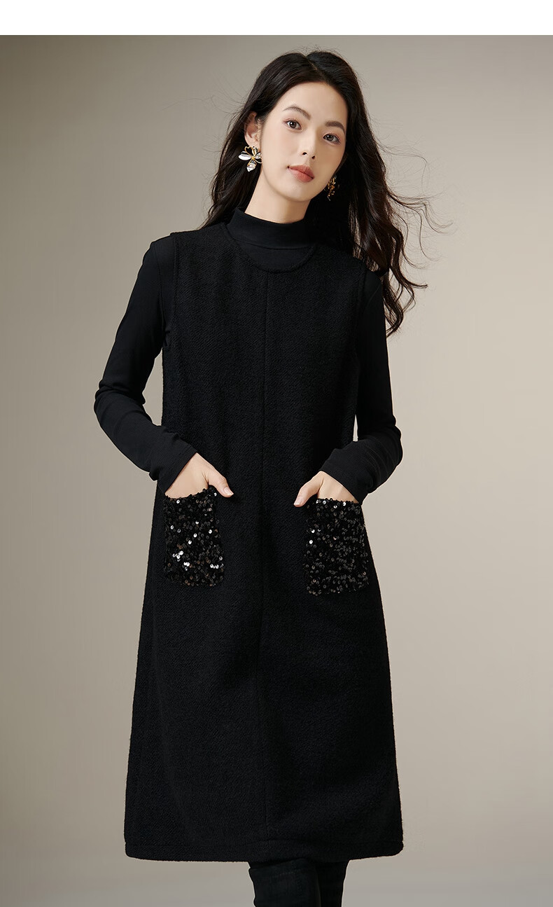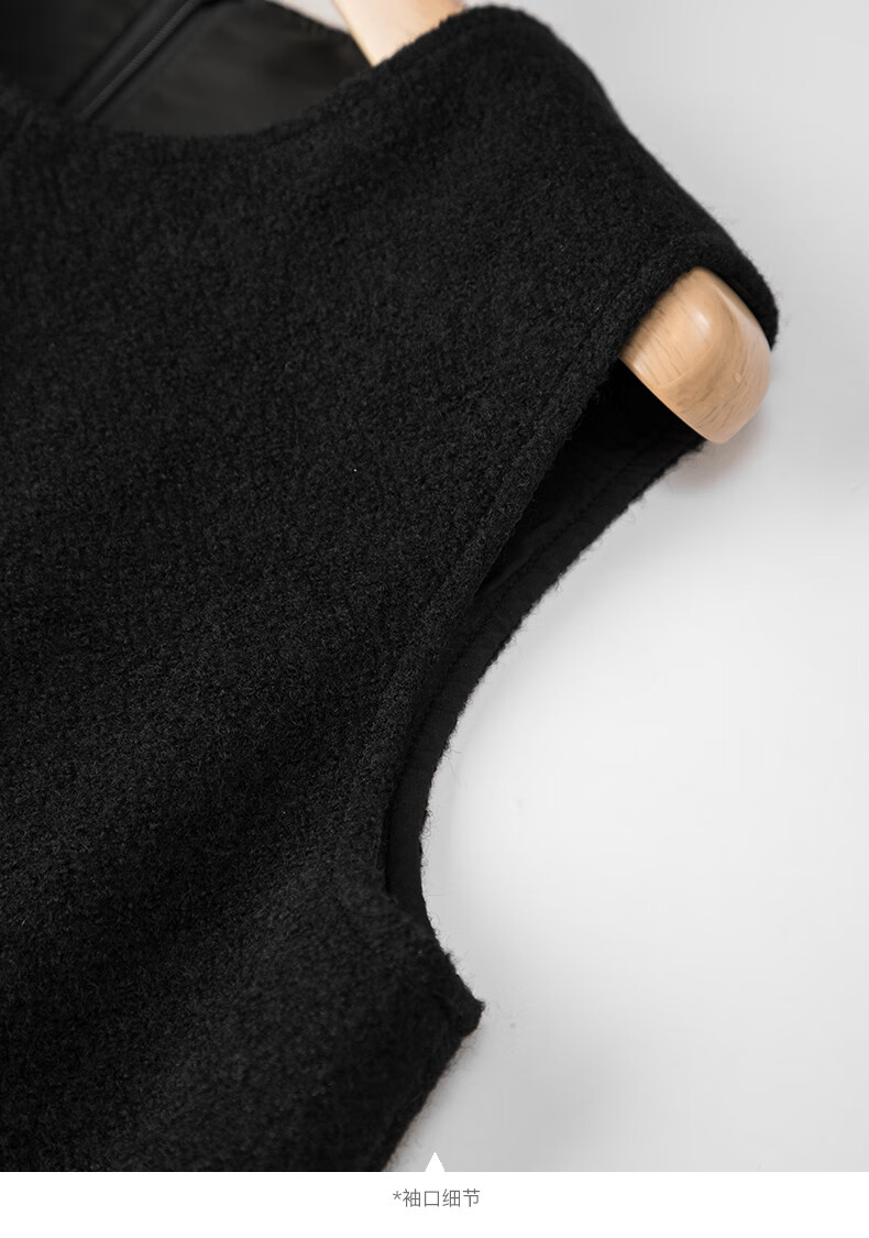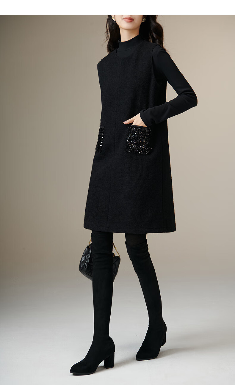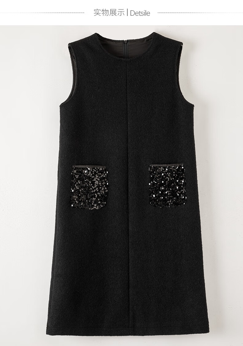 晚白【新品】冬款绵羊毛圆领无袖亮闪闪裙子优雅百搭小个子穿搭连衣裙 黑色 S