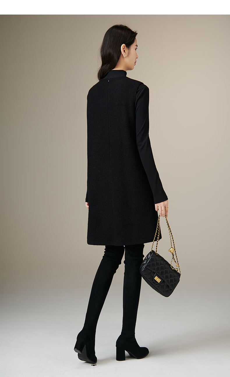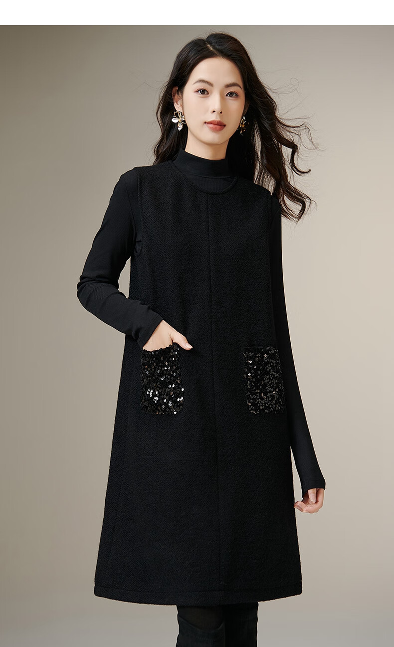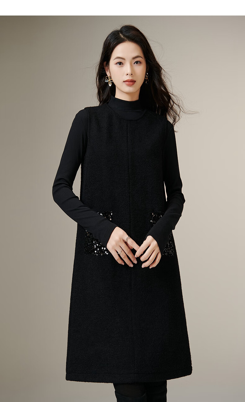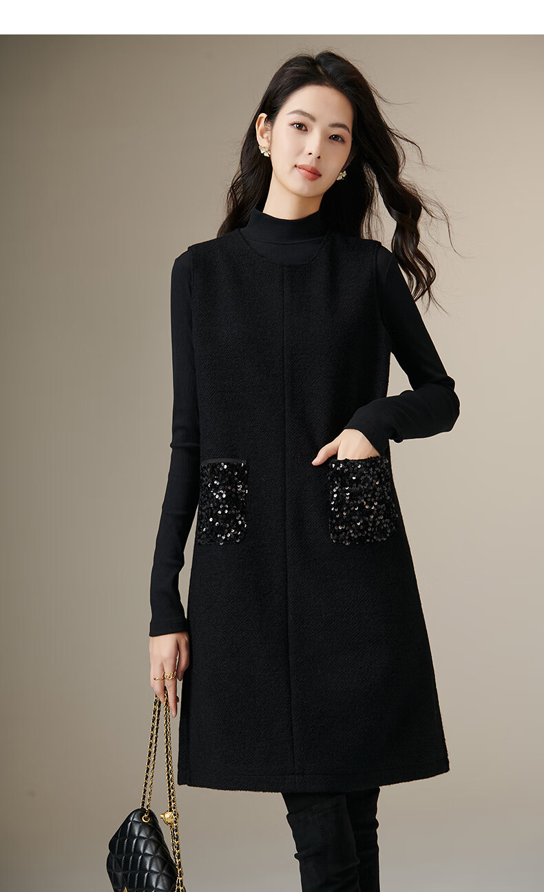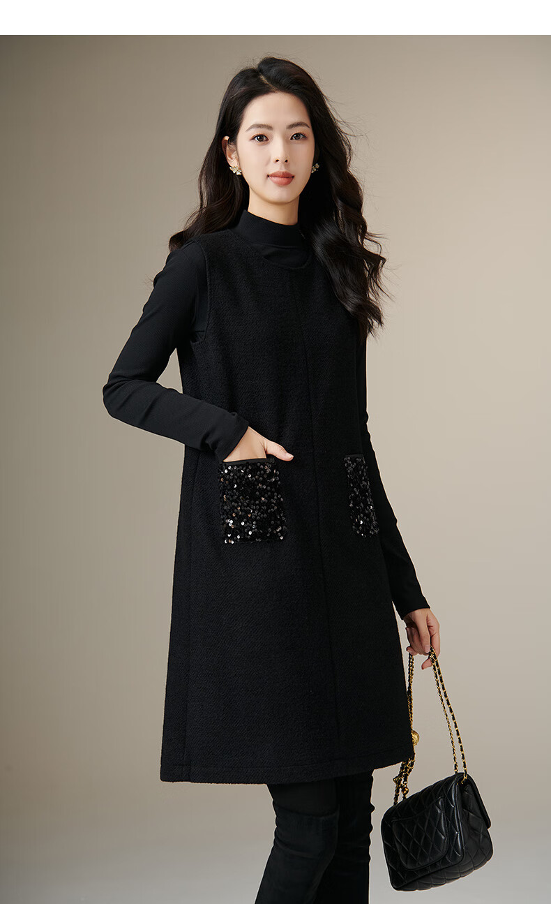 晚白【新品】冬款绵羊毛圆领无袖亮闪闪裙子优雅百搭小个子穿搭连衣裙 黑色 S