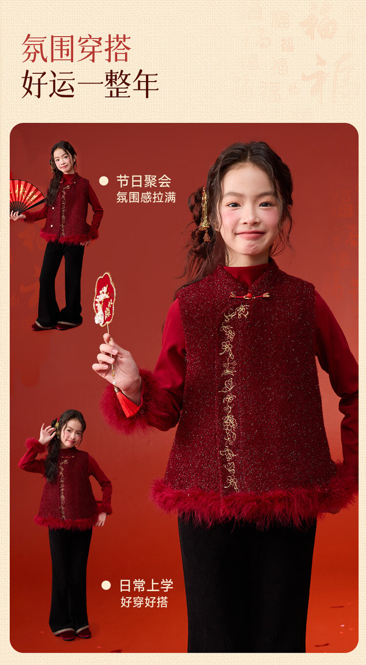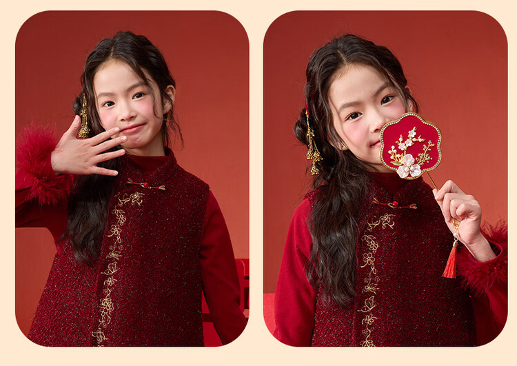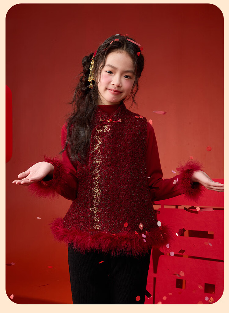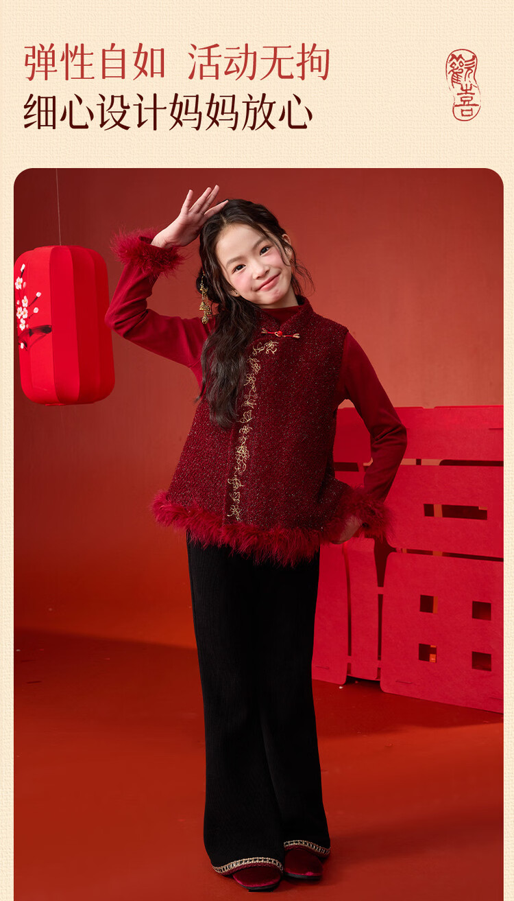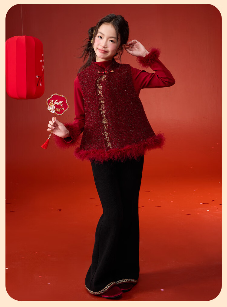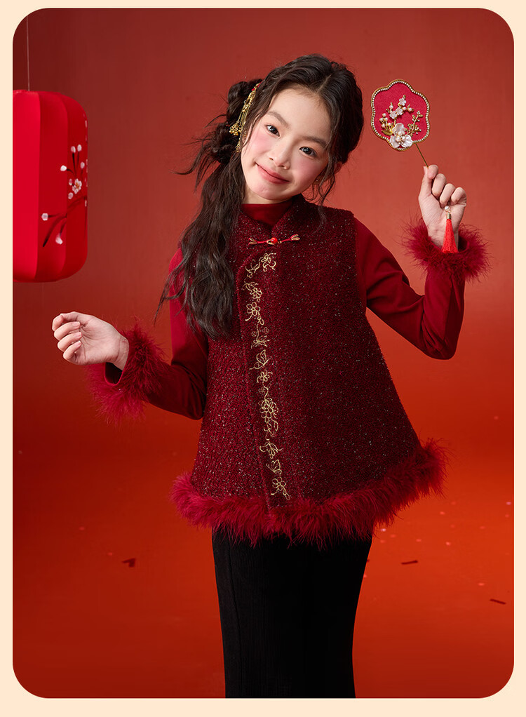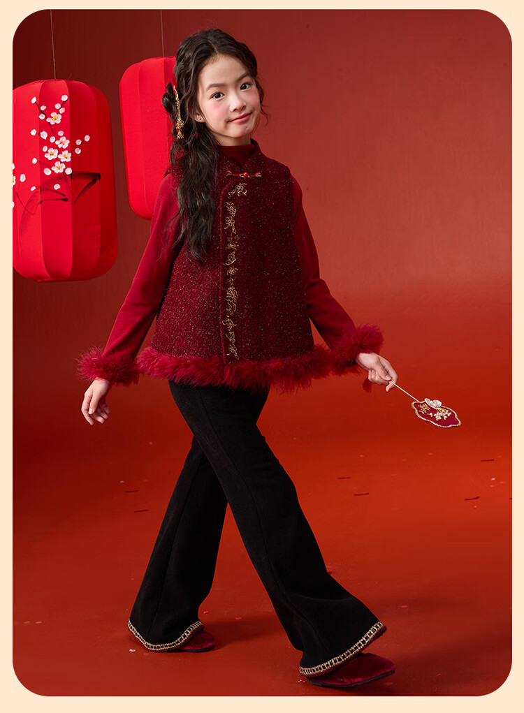 栀了成长记童装女童红色国风套装2025冬季儿童新年夹棉马甲两件套 红色 套装 100 cm