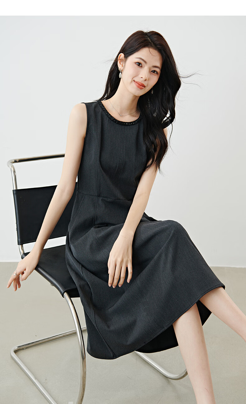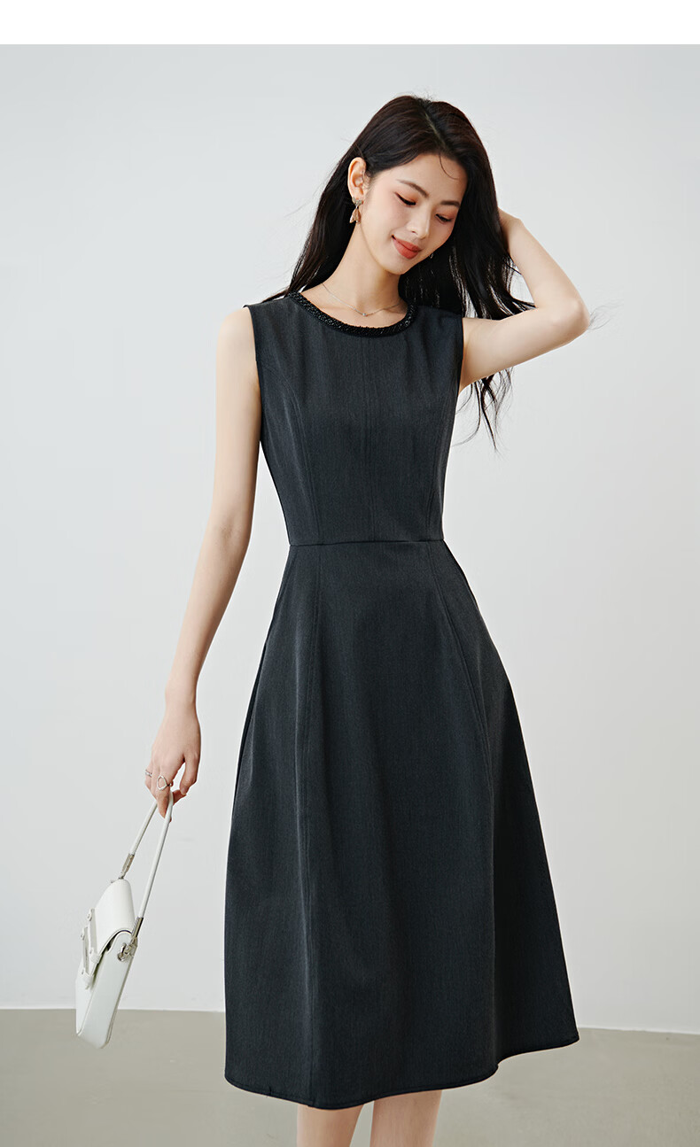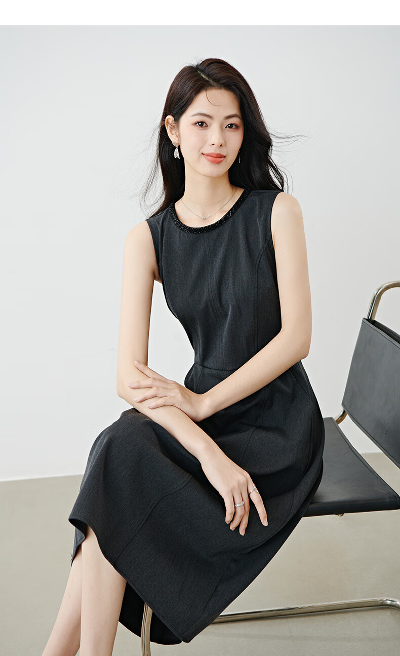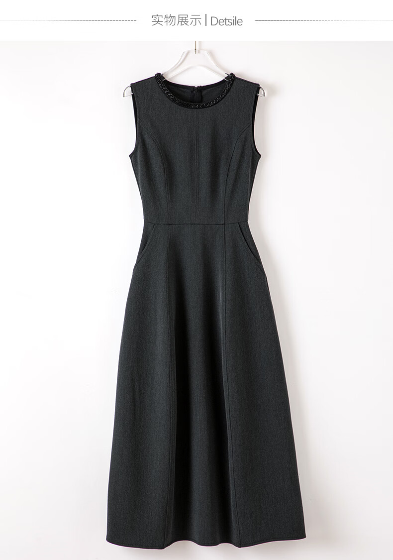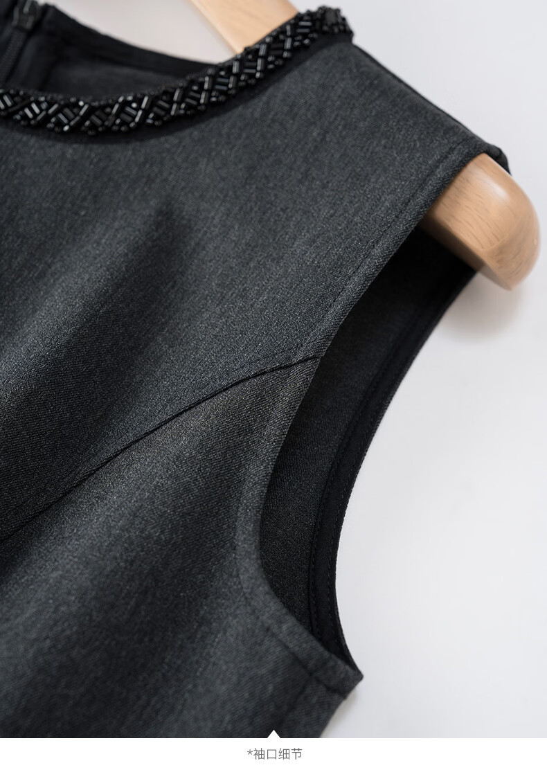 晚白【新品】2026春款正式场合钉珠圆领裙子显瘦垂感通勤无袖连衣裙 深灰色 M