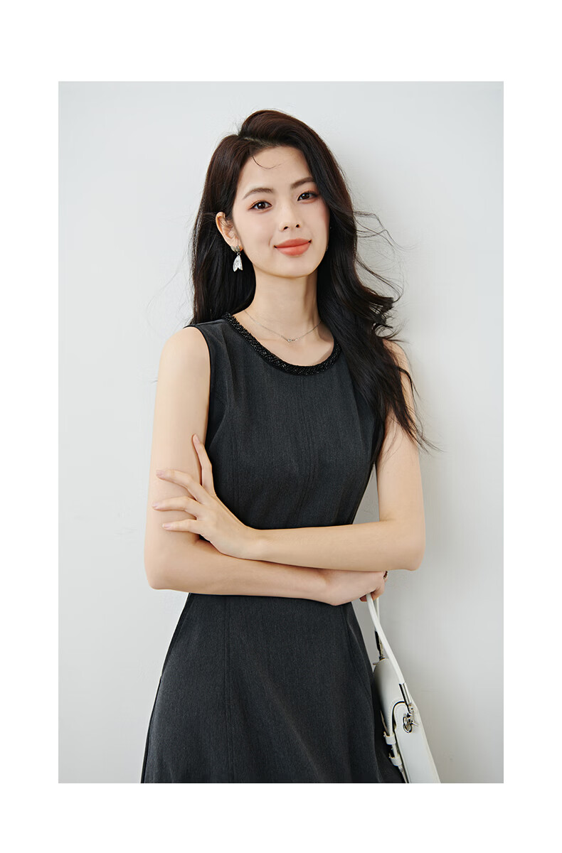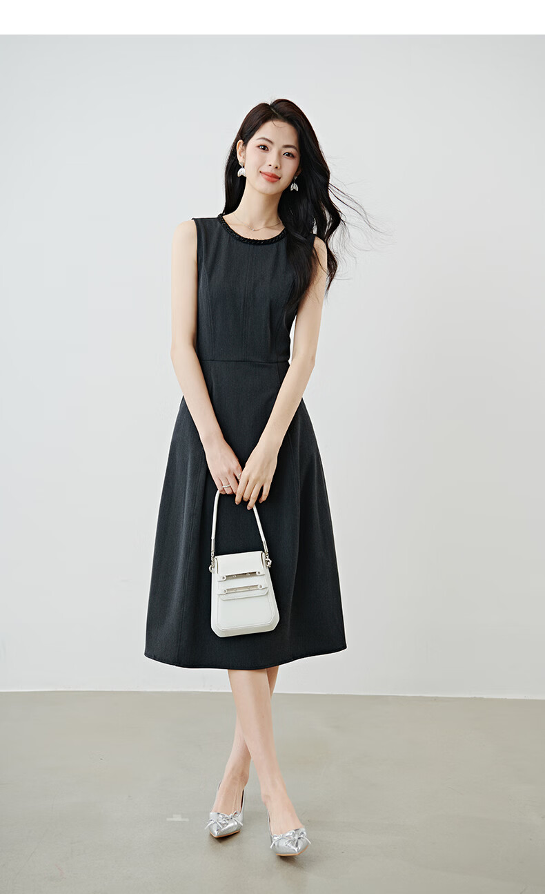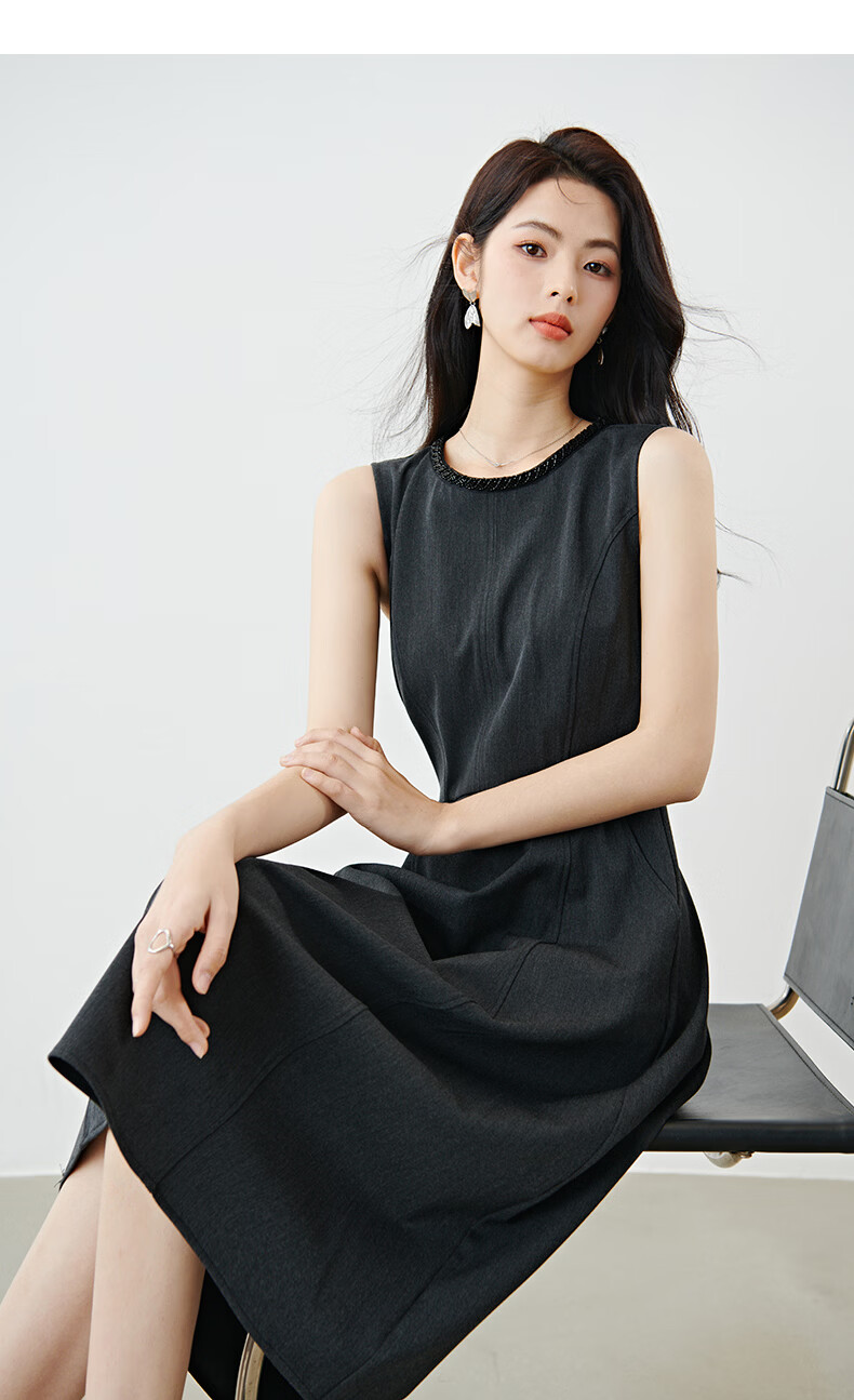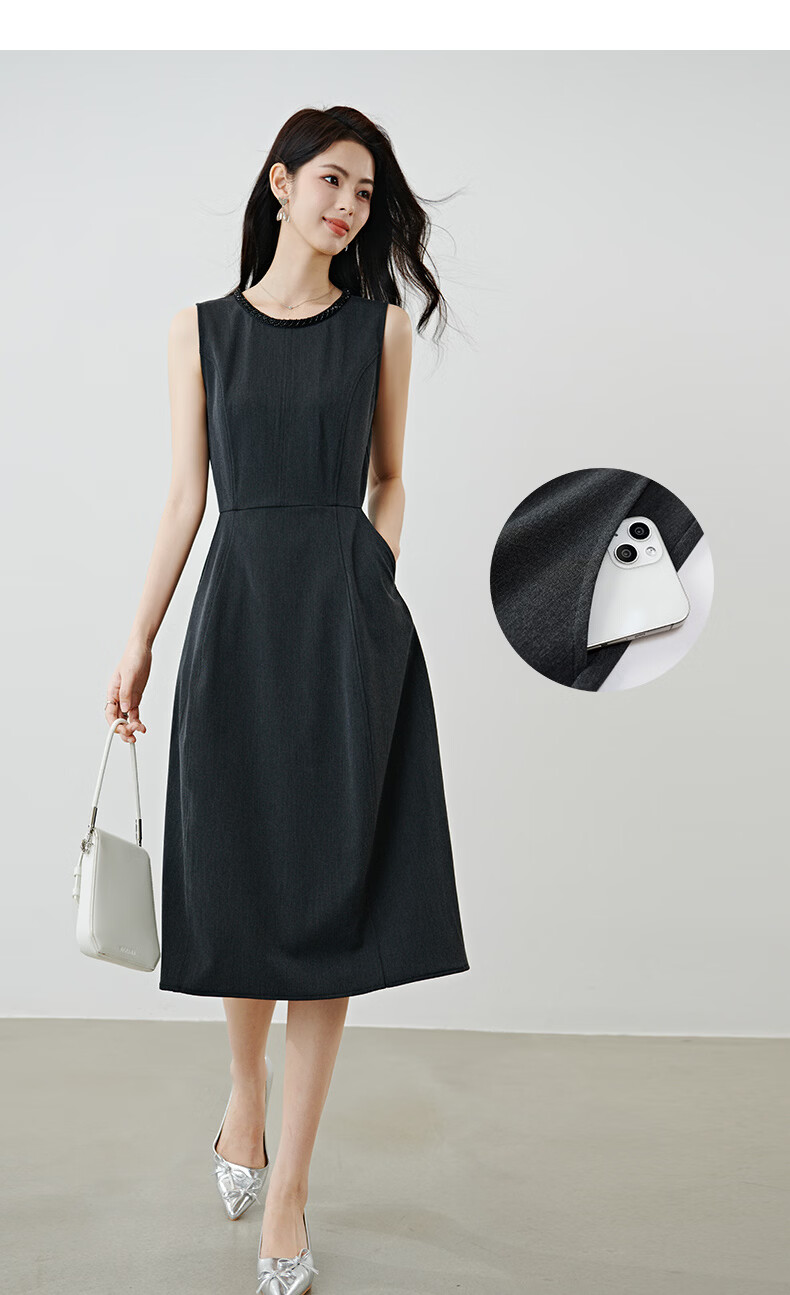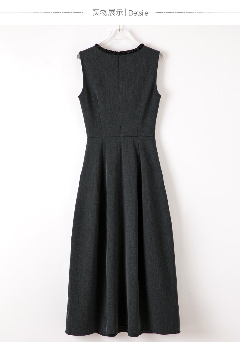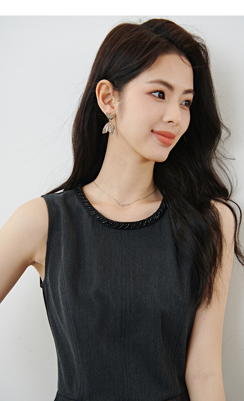 晚白【新品】2026春款正式场合钉珠圆领裙子显瘦垂感通勤无袖连衣裙 深灰色 M