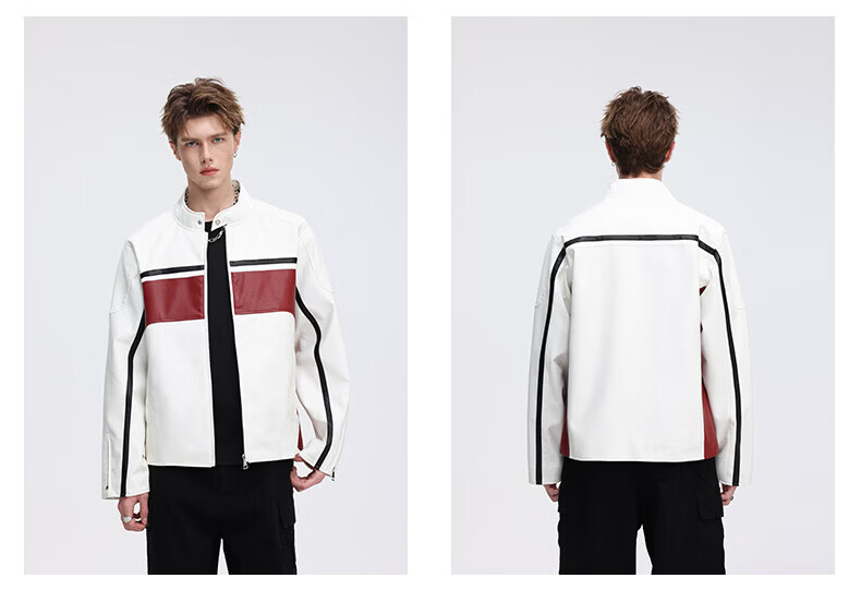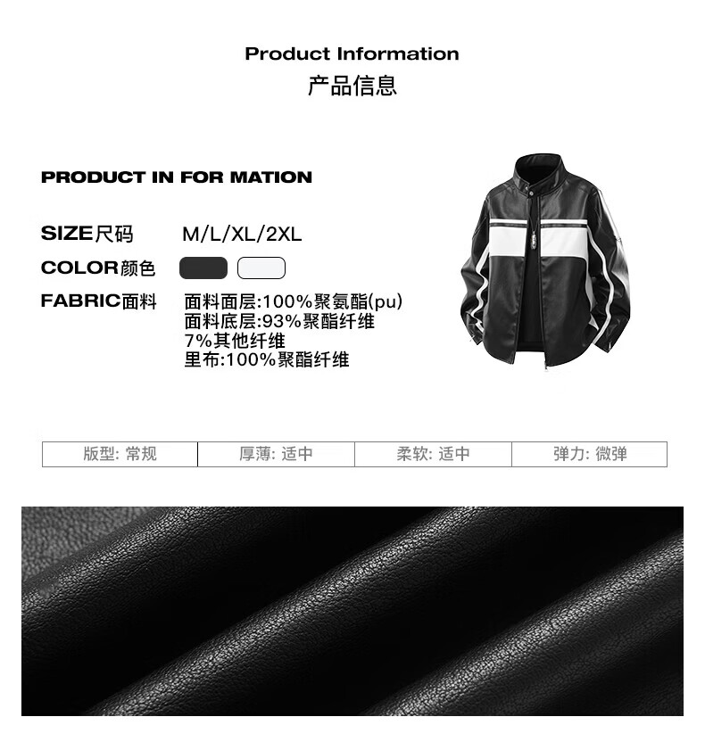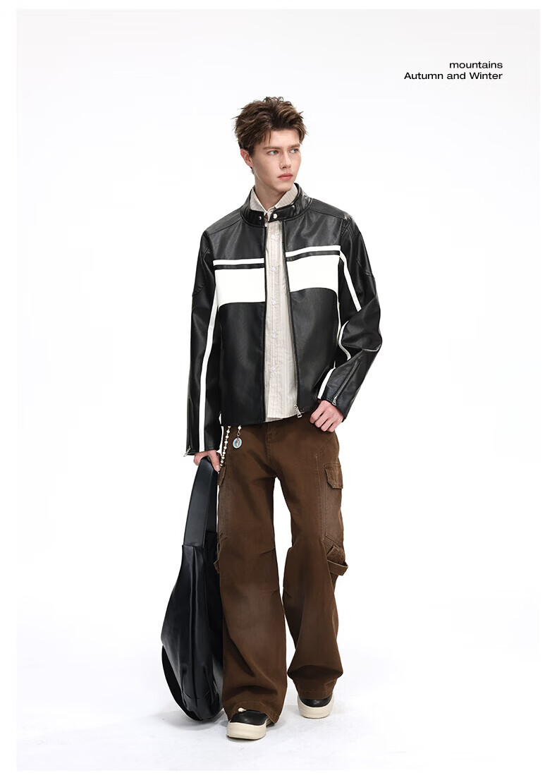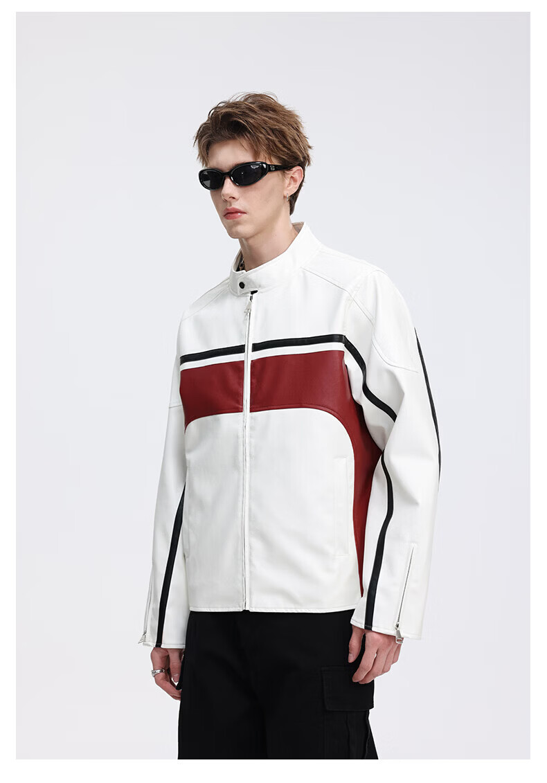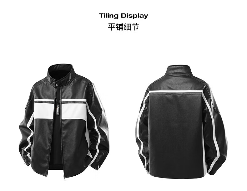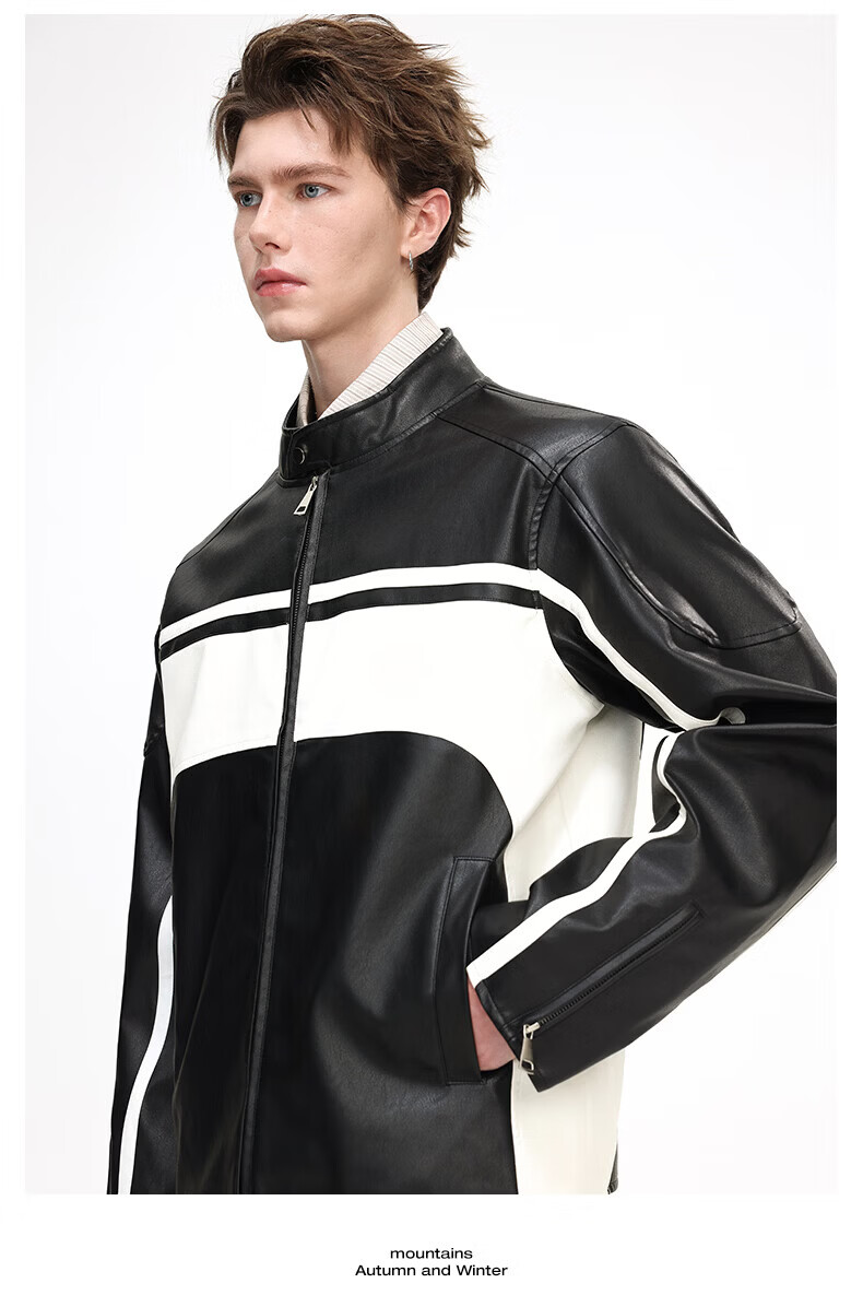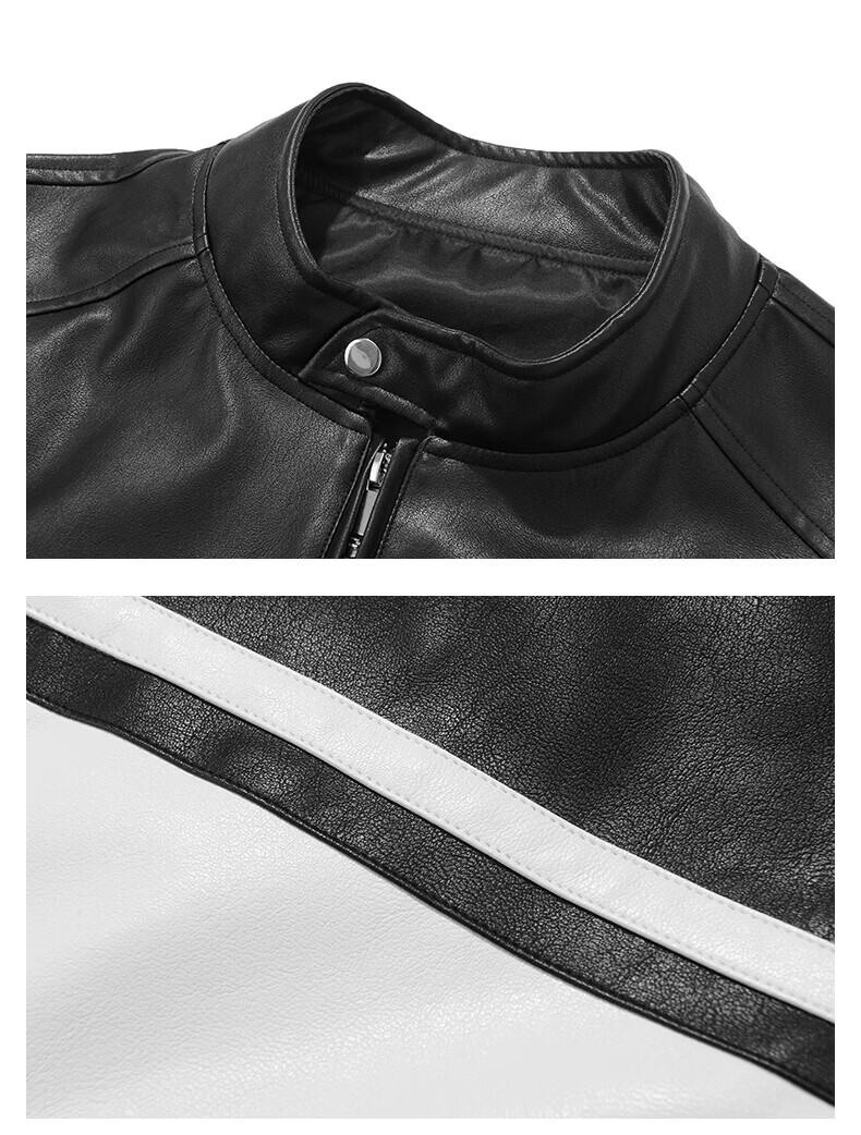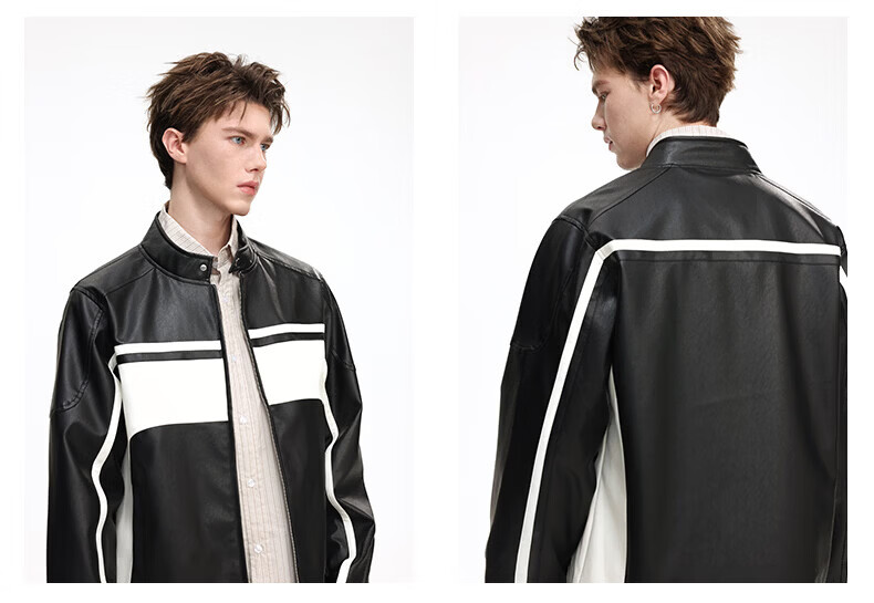 真维斯(Jeanswest)皮衣外套美式复古机车风黑白撞色立领宽松皮夹克男 黑色 2XL