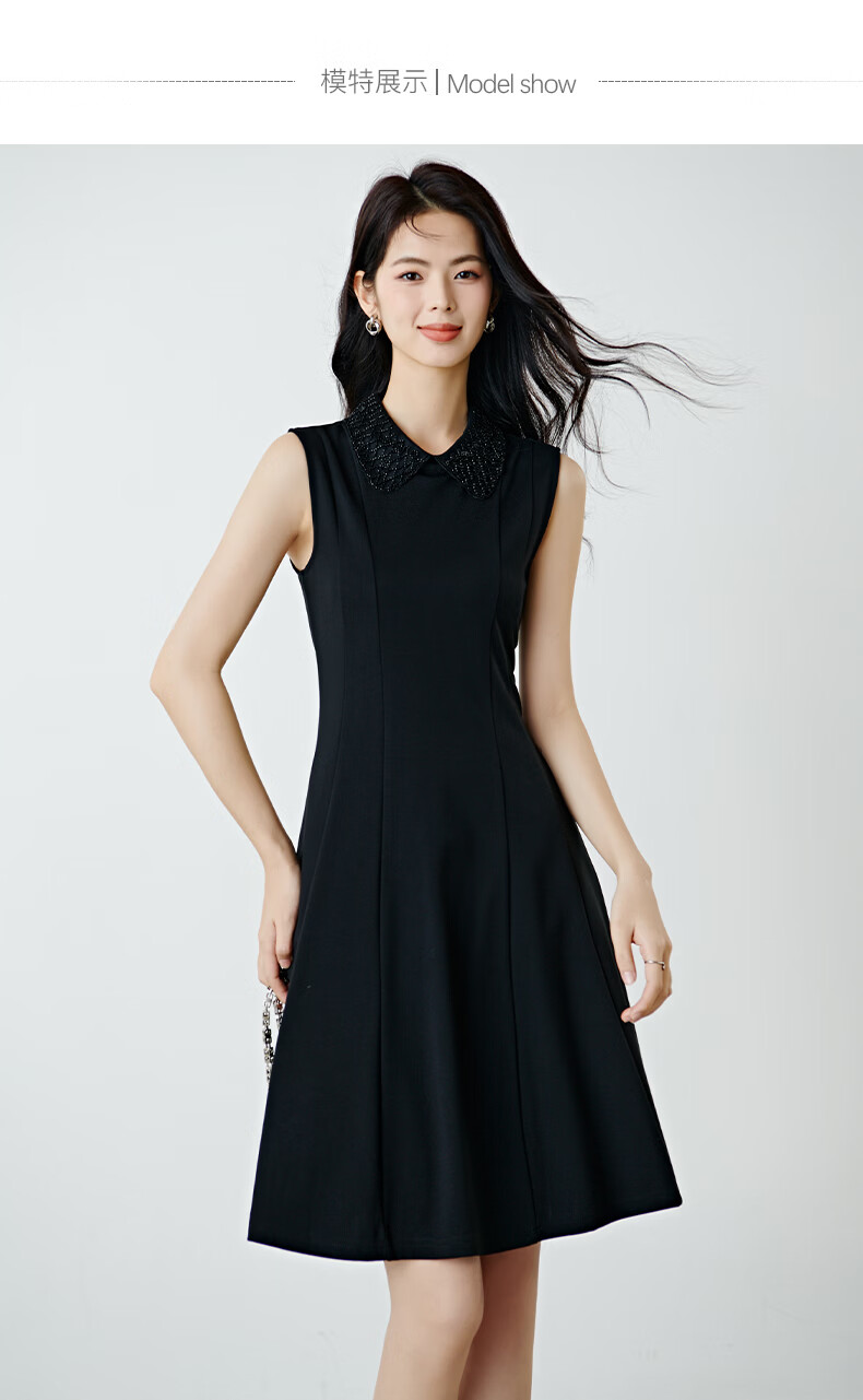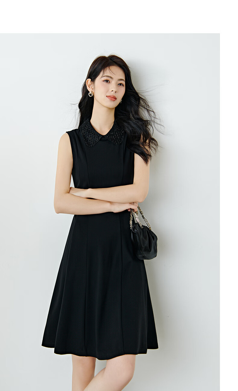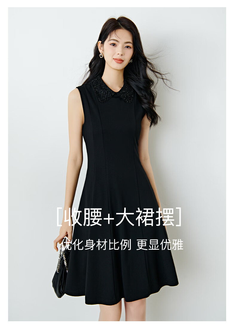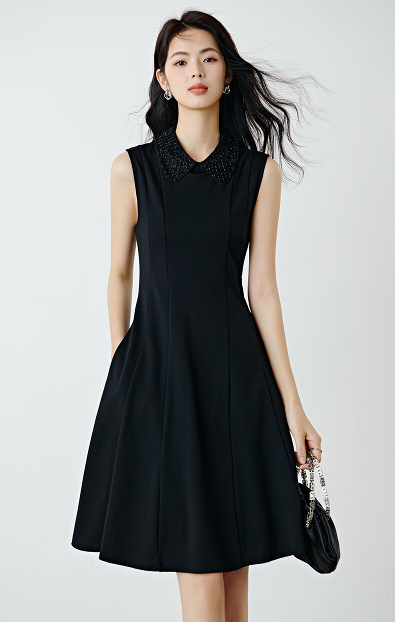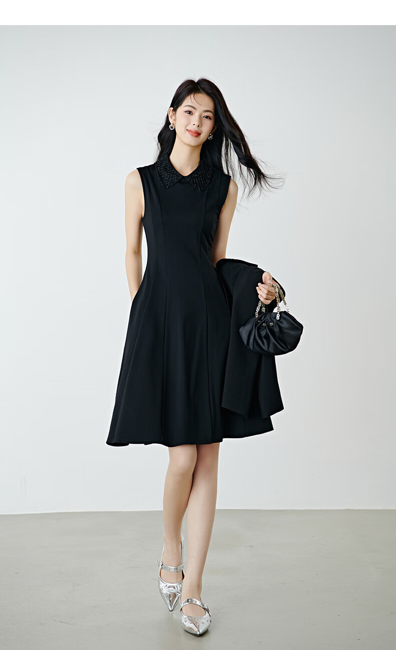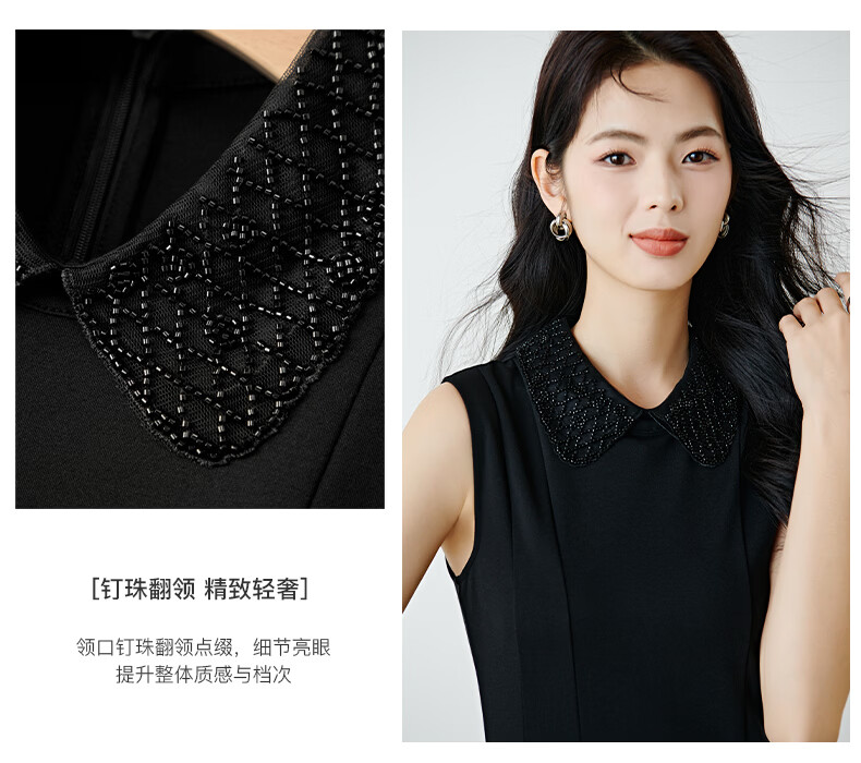 晚白【新品】2026年春款时尚翻领钉珠裙子修身显瘦气质无袖连衣裙 黑色 M