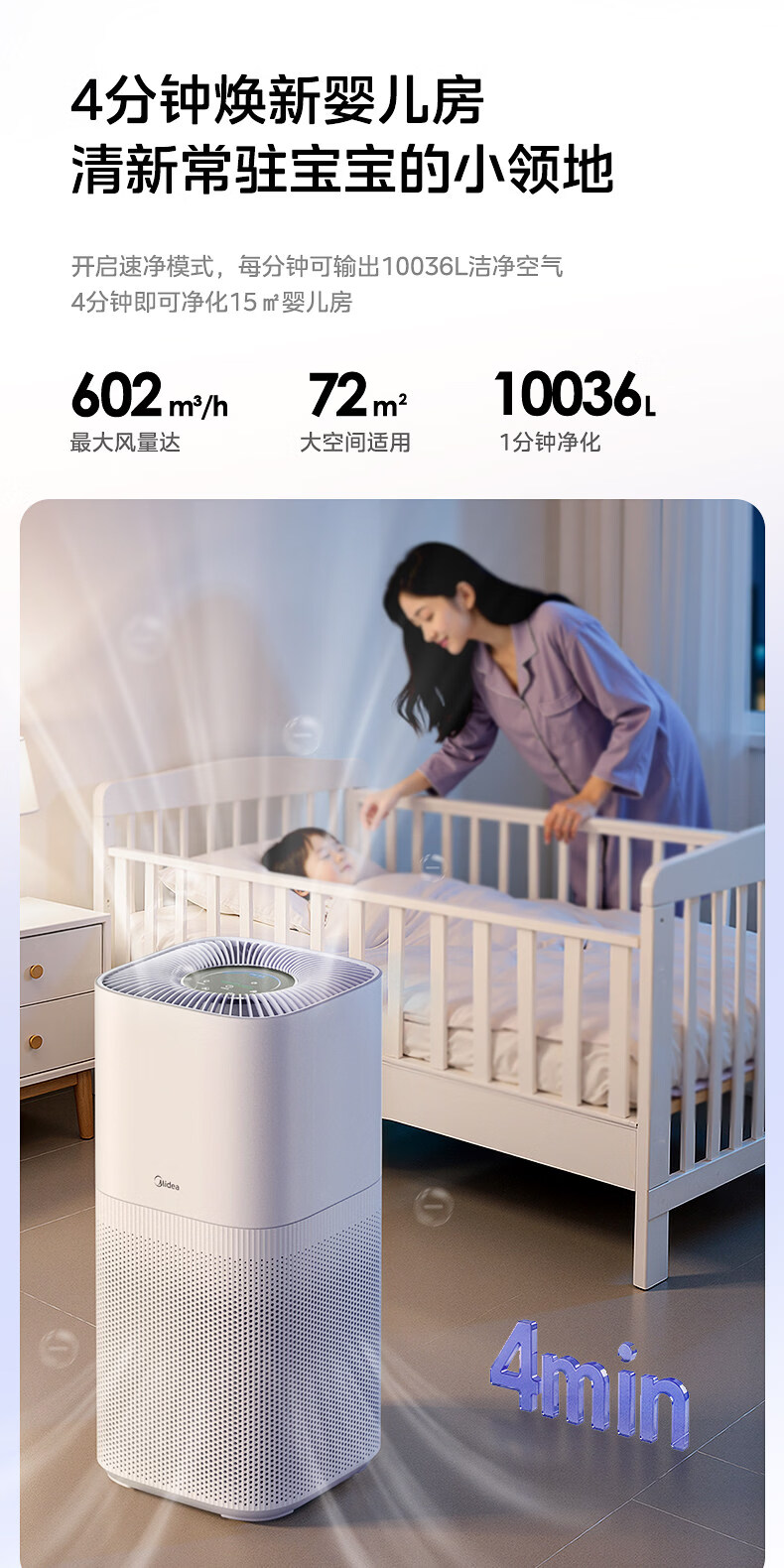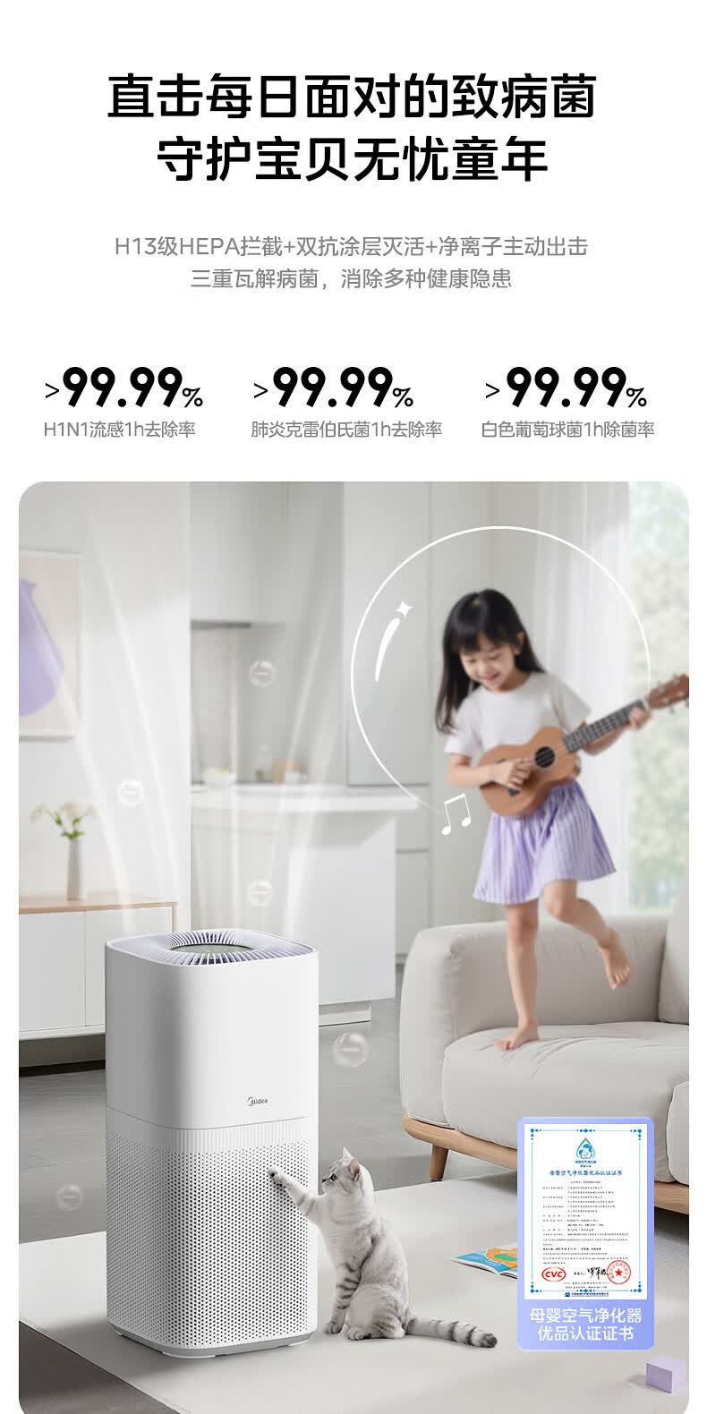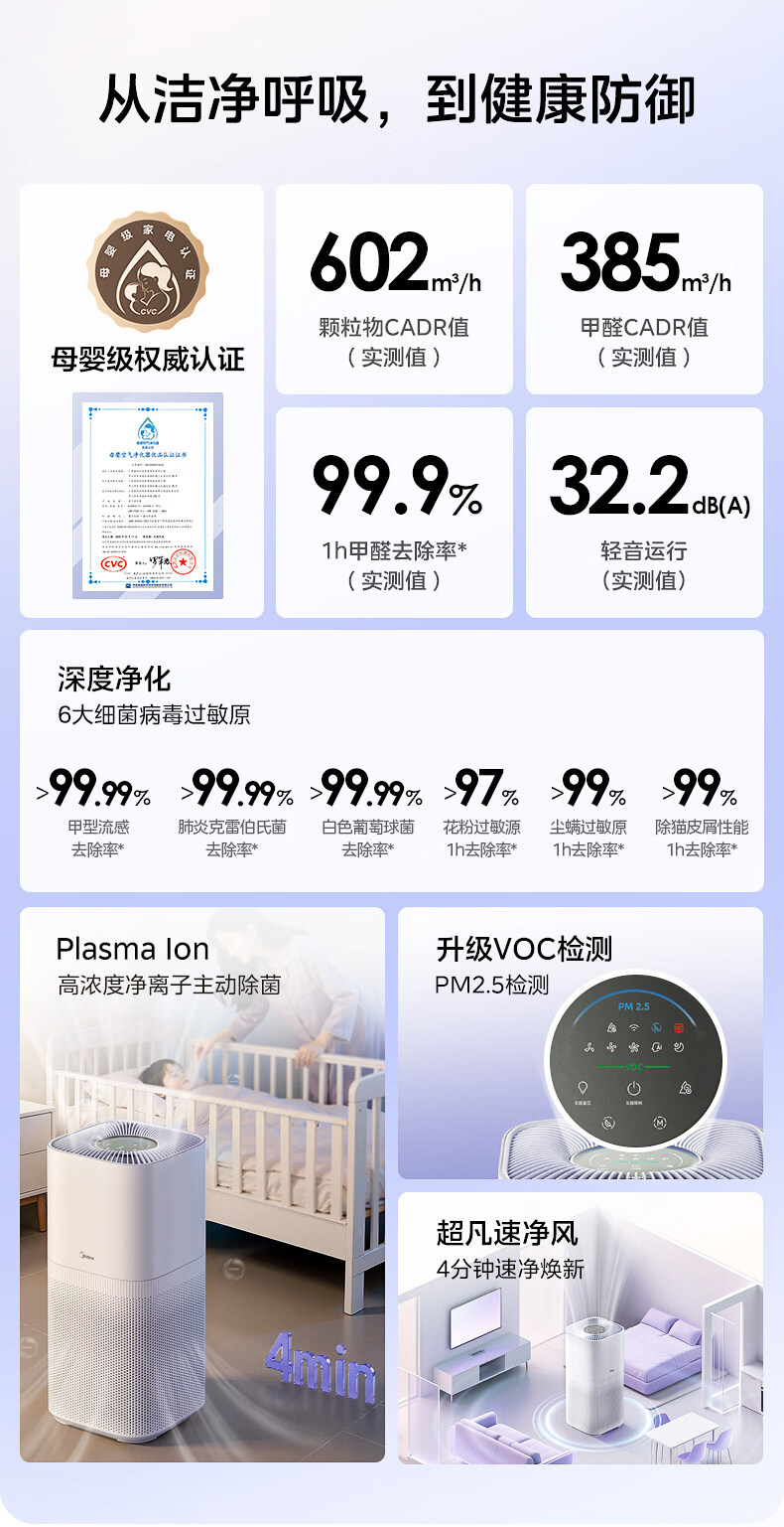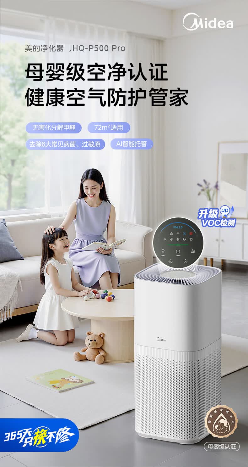 美的(Midea)美的P500Pro母婴空气净化器 数显家用鼻炎过敏除菌净化器 分解除甲醛新房婴儿无臭氧JHQ-P500 Pro 白色 【母婴医护双认证】P500Pro