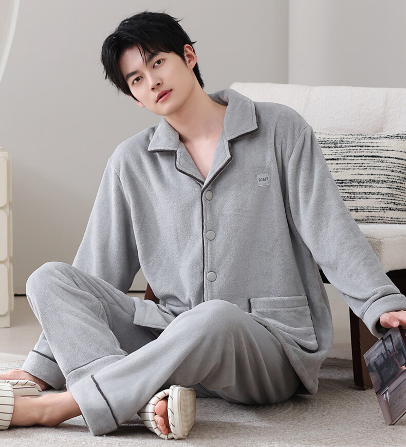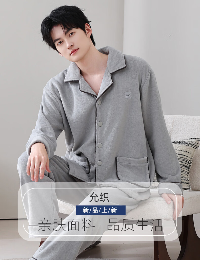 允织法兰绒睡衣男士冬季秋冬款加绒加厚保暖珊瑚绒男款家居服大码套装 5902-星氤灰 L (170) :建议100-135斤穿着