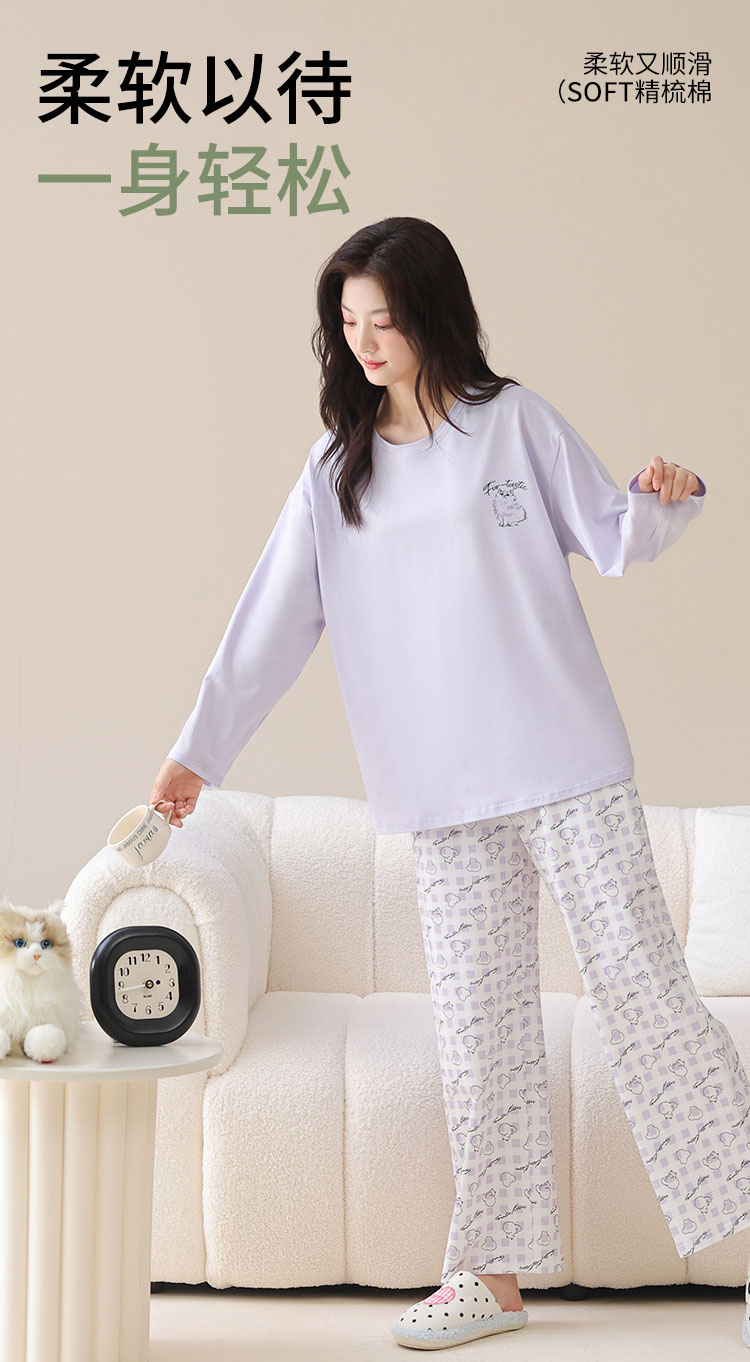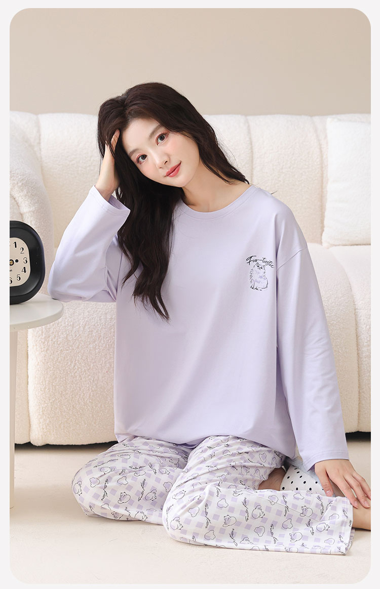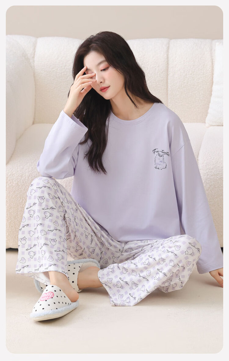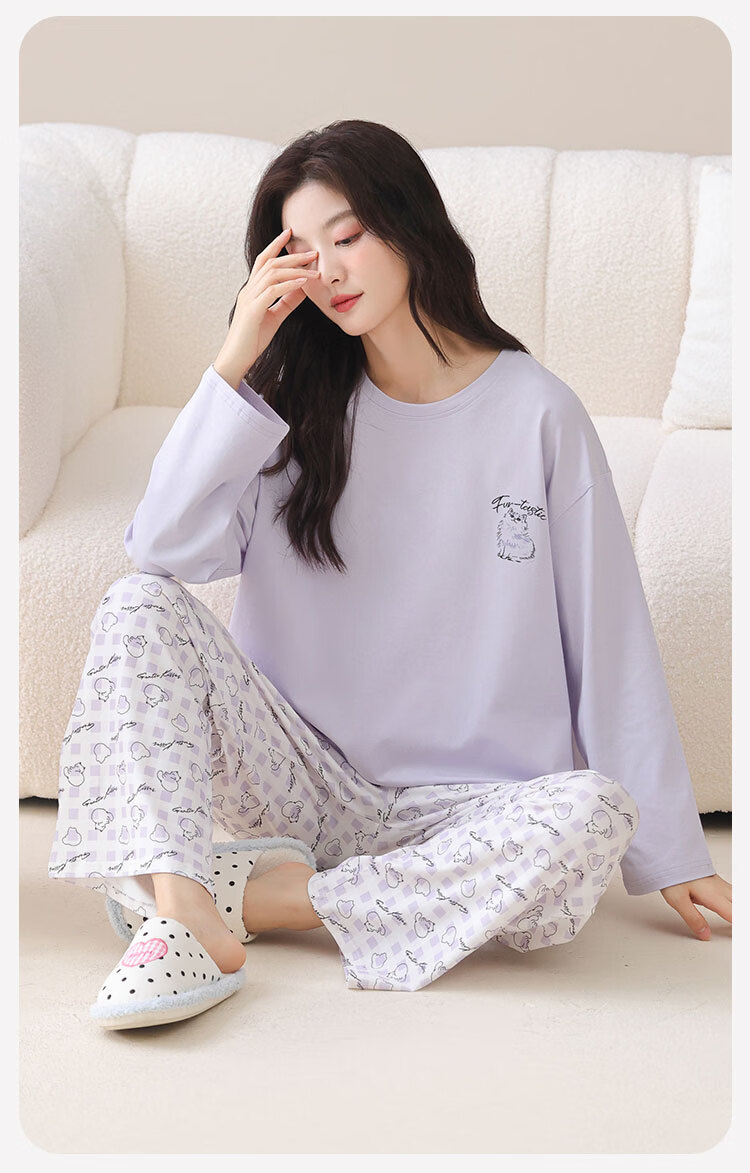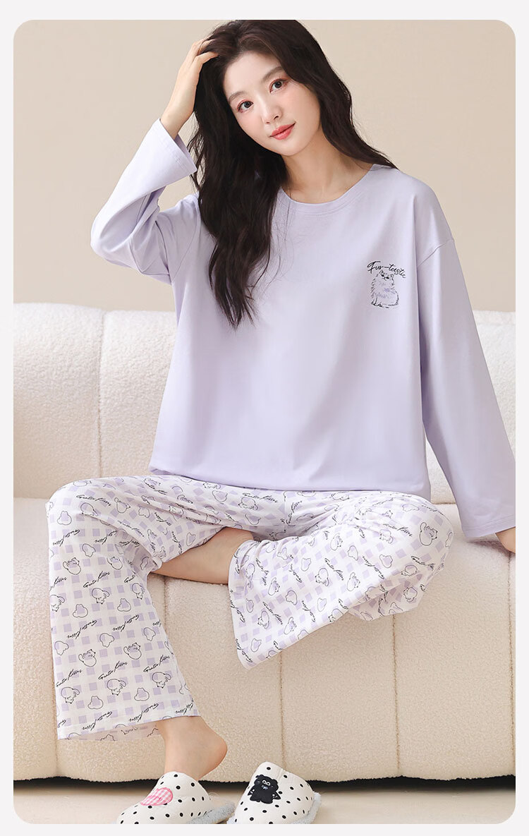 洁丽雅女士睡衣女春夏款100%棉舒适圆领套头长袖长裤家居服套装可外穿 绒绒点黛 XL
