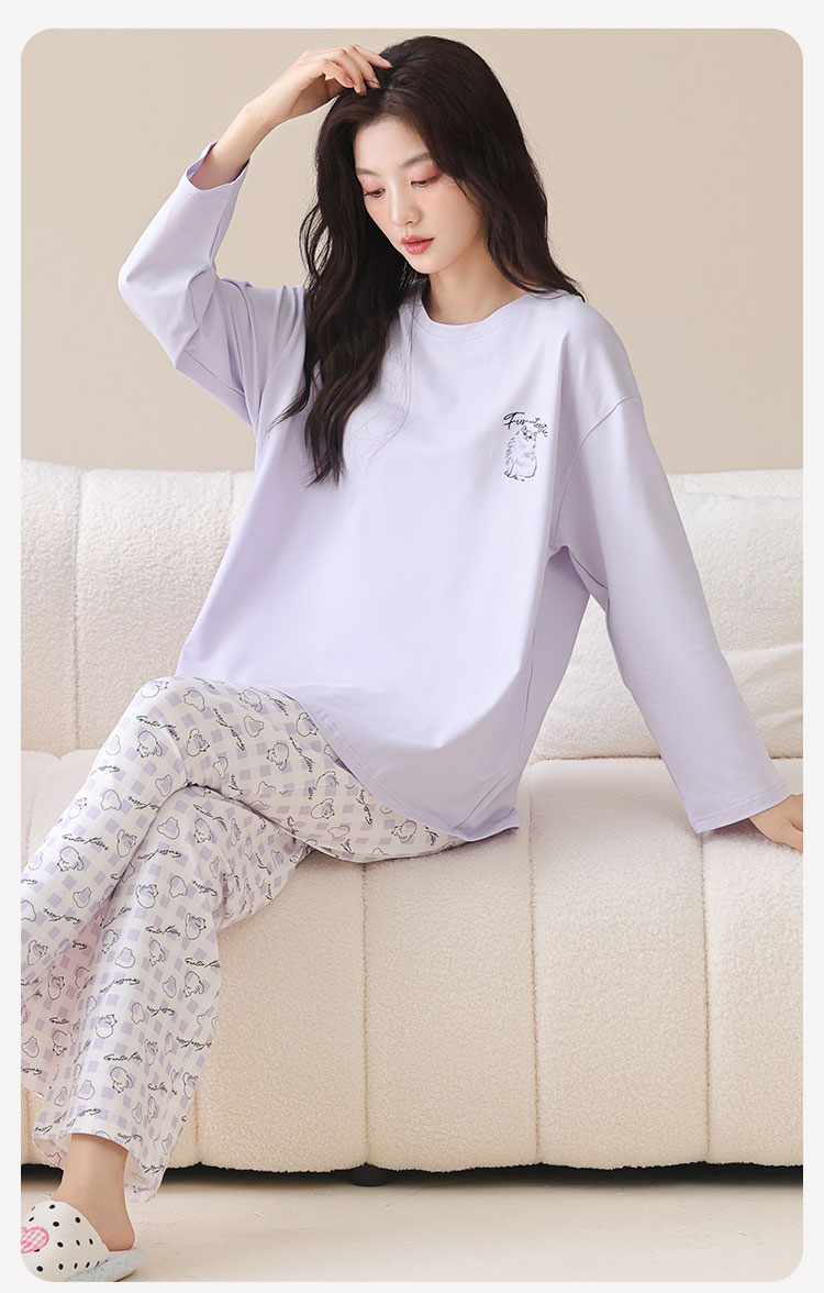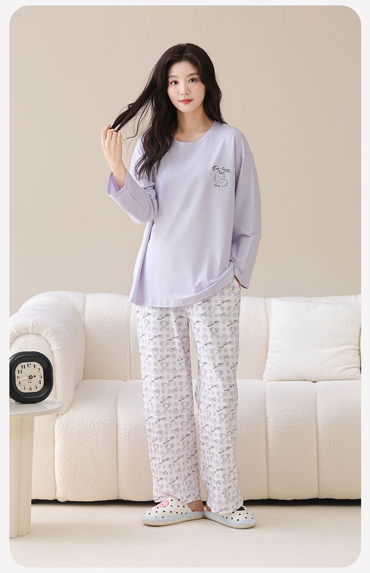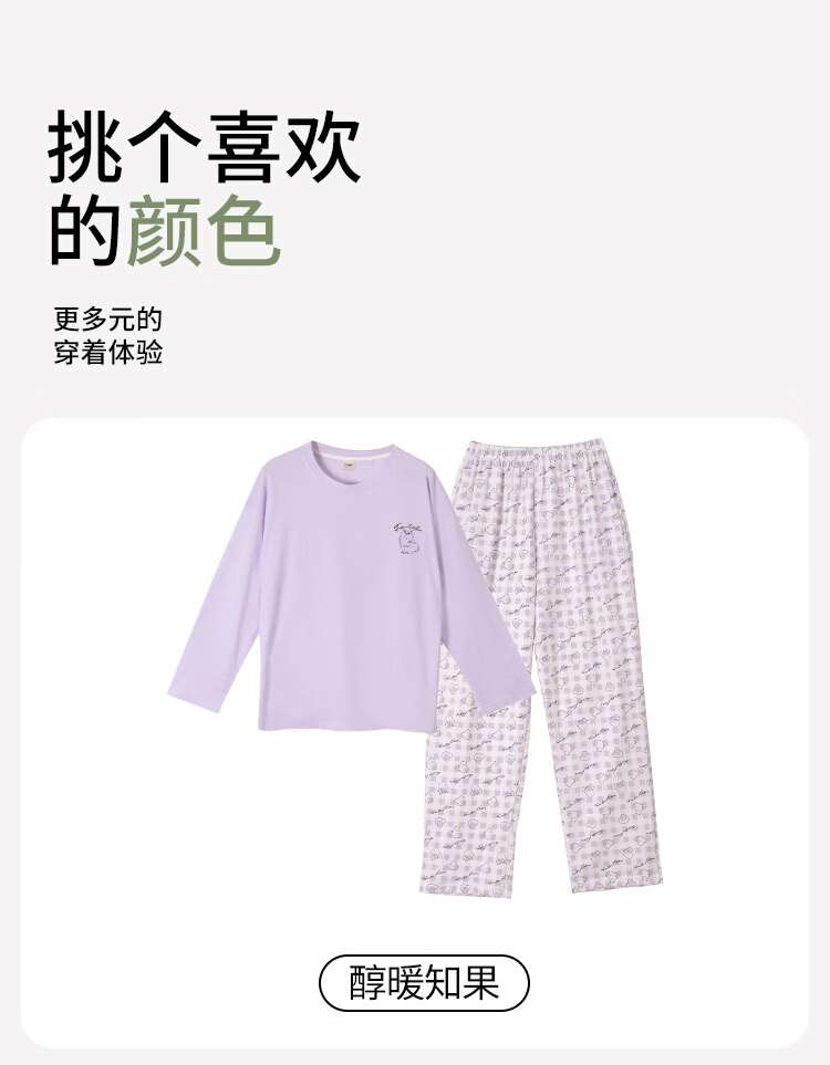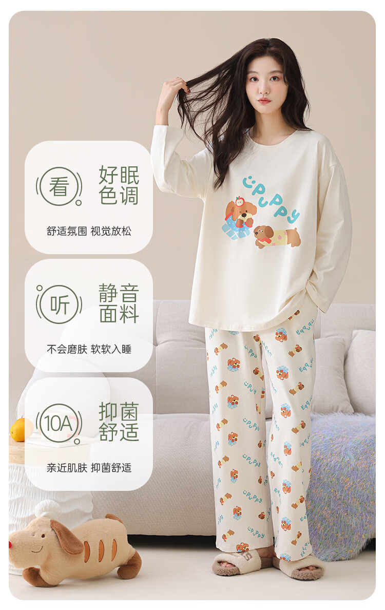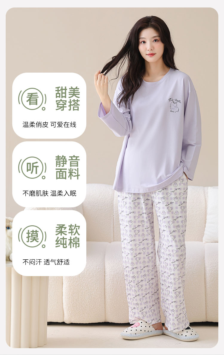 洁丽雅女士睡衣女春夏款100%棉舒适圆领套头长袖长裤家居服套装可外穿 绒绒点黛 XL
