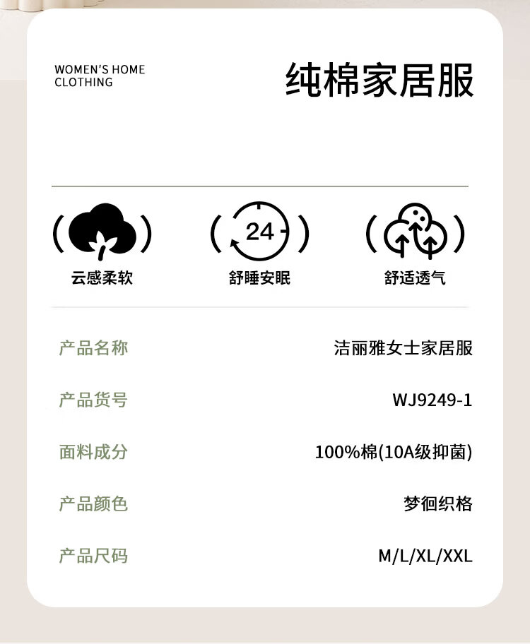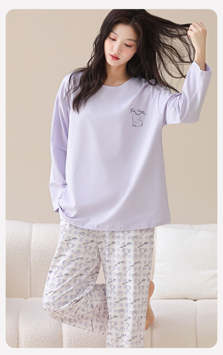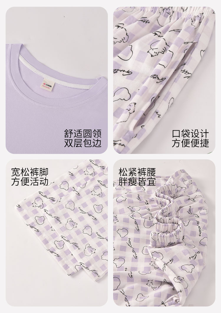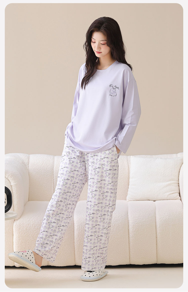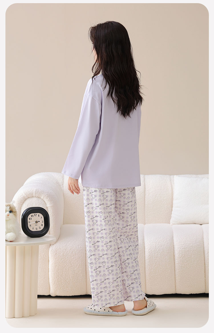 洁丽雅女士睡衣女春夏款100%棉舒适圆领套头长袖长裤家居服套装可外穿 绒绒点黛 XL