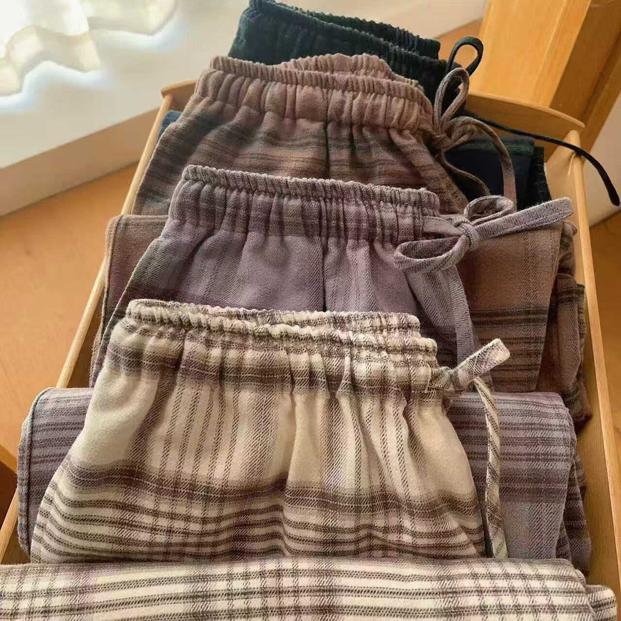 蔓秋 MEJU秋冬纯棉女士格子睡裤磨毛休闲保暖中腰带口袋可外穿阔腿裤 咖色 M 115斤以内