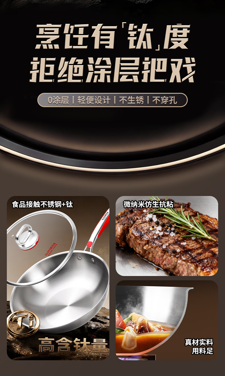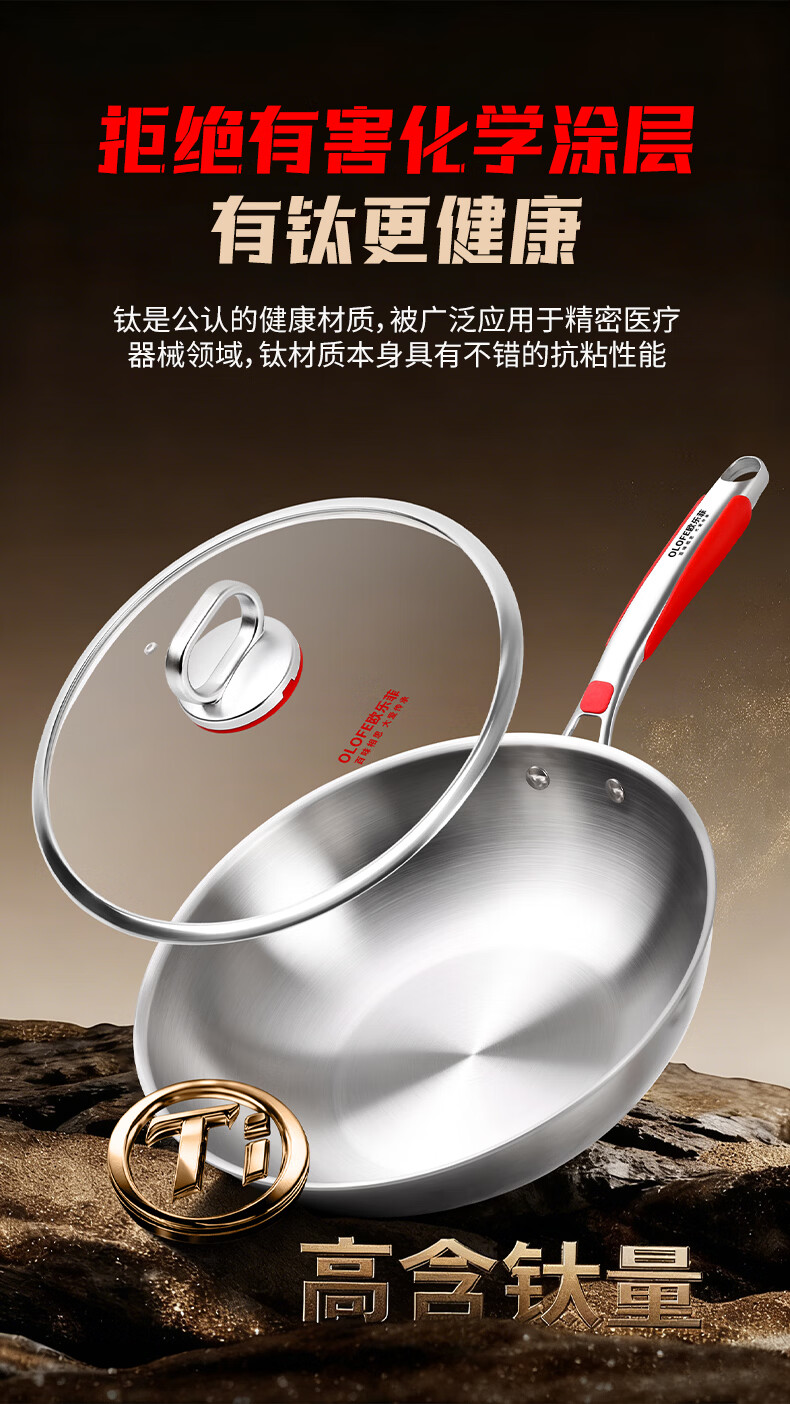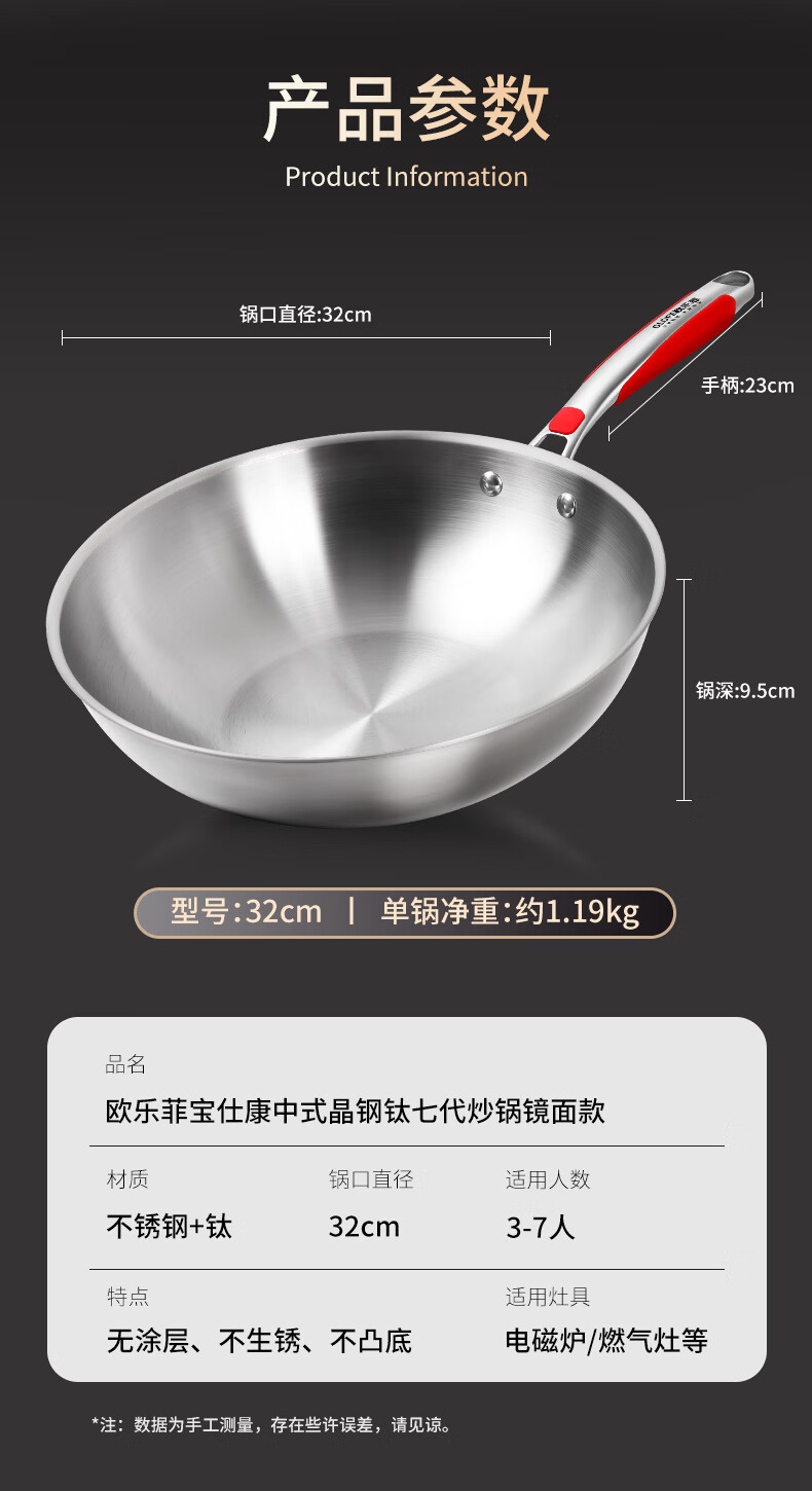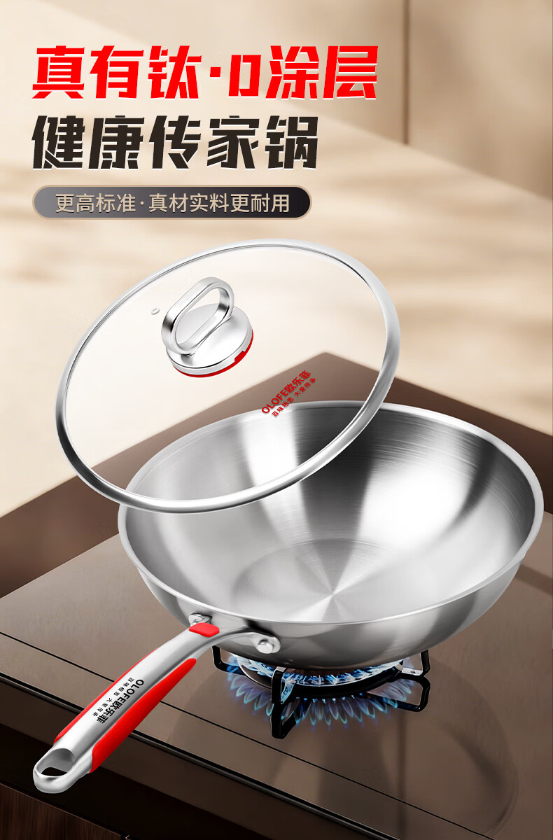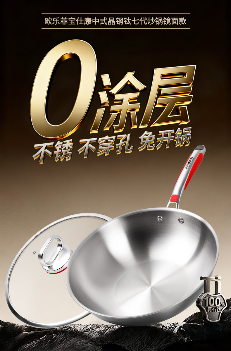 欧乐菲(OLOFE)0涂层不锈钢钛炒锅第七代中式晶刚钛镜面家用平底轻便炒菜锅32cm 【第七代】免开锅 32cm