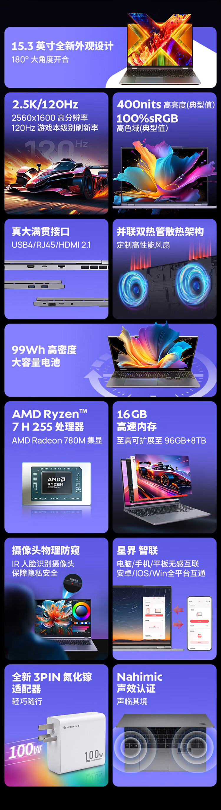 机械革命【国家补贴】无界15X Pro (R7 H 255 16G 1T 99Wh 120Hz 2.5K 灰)办公笔记本电脑轻薄游戏本