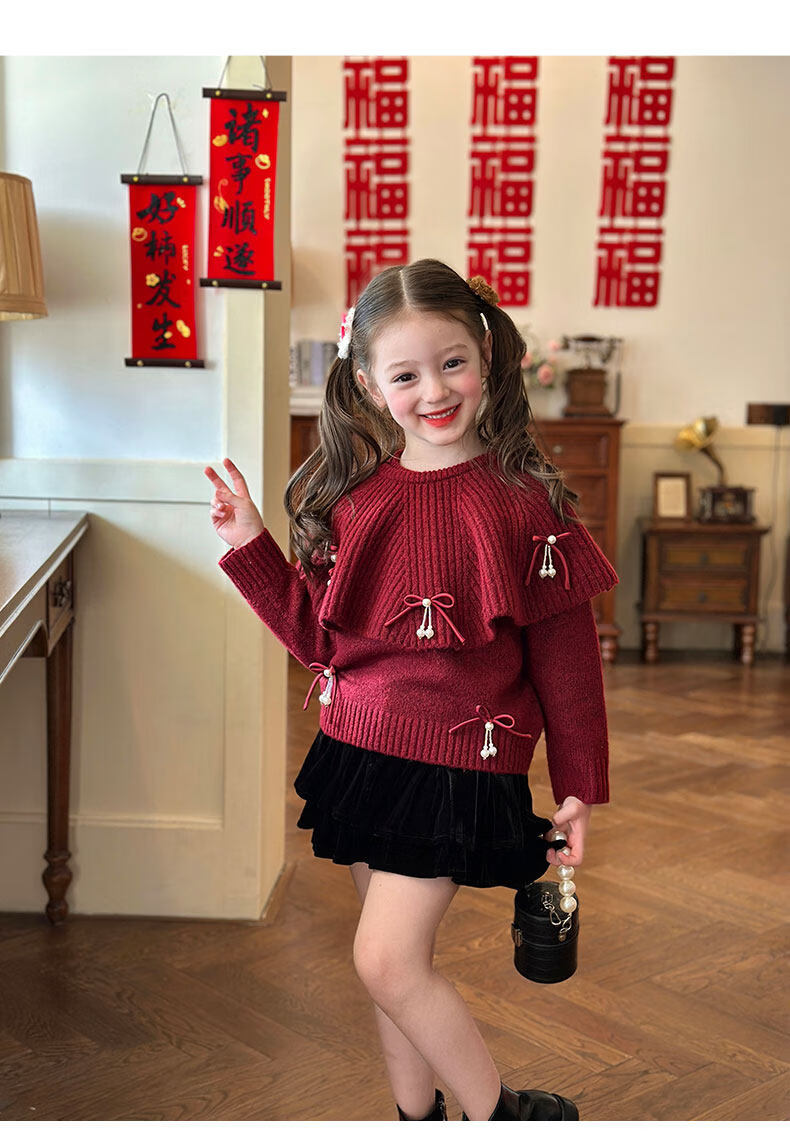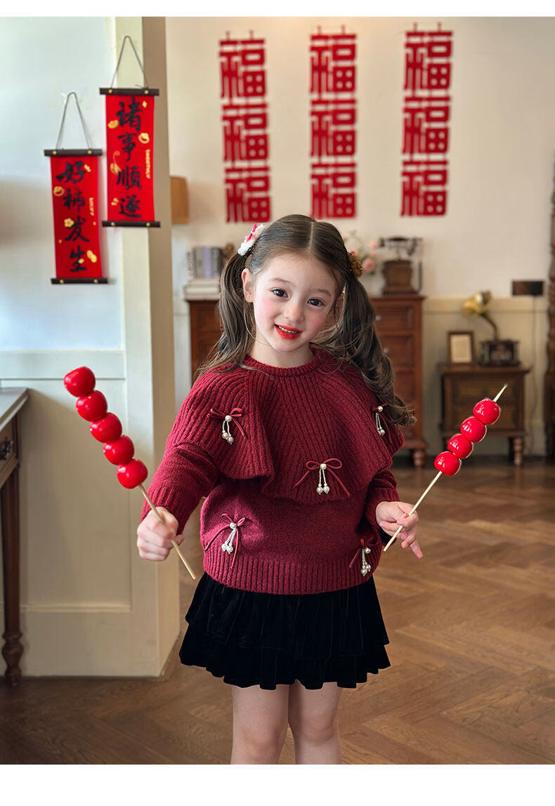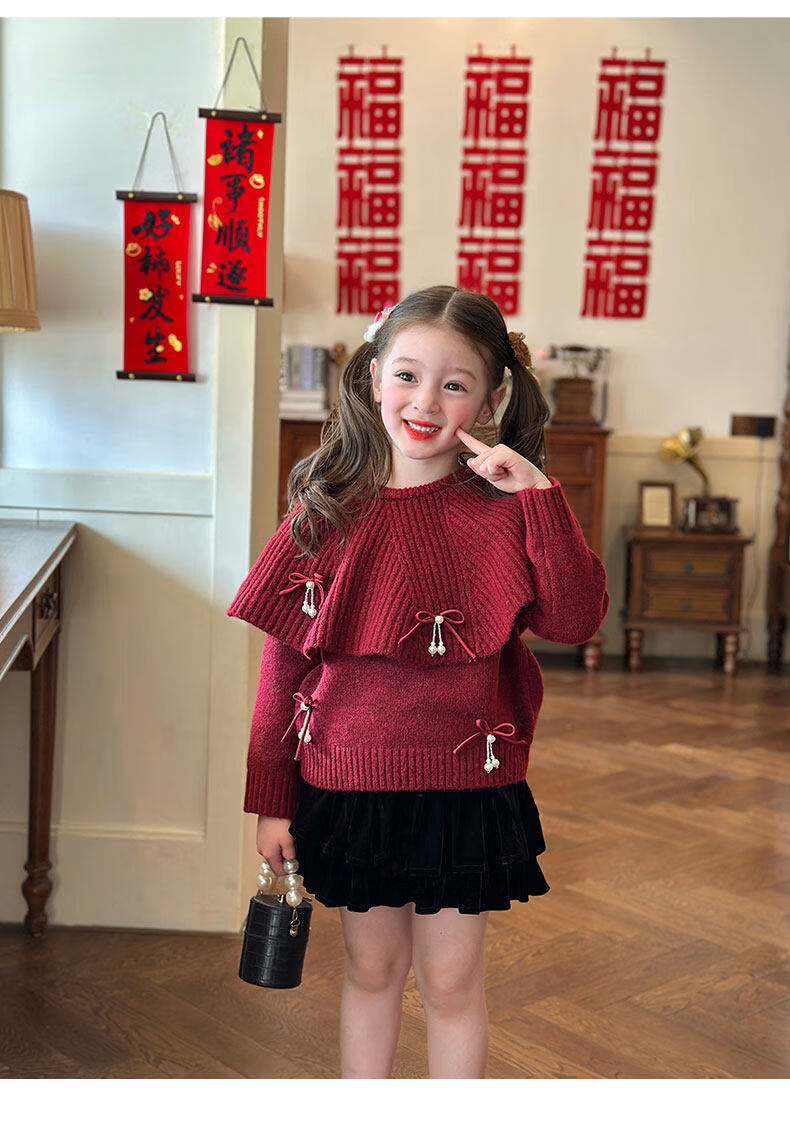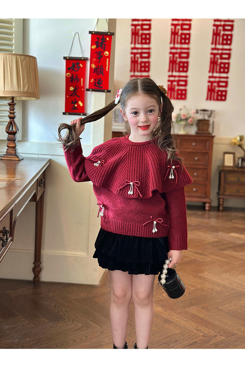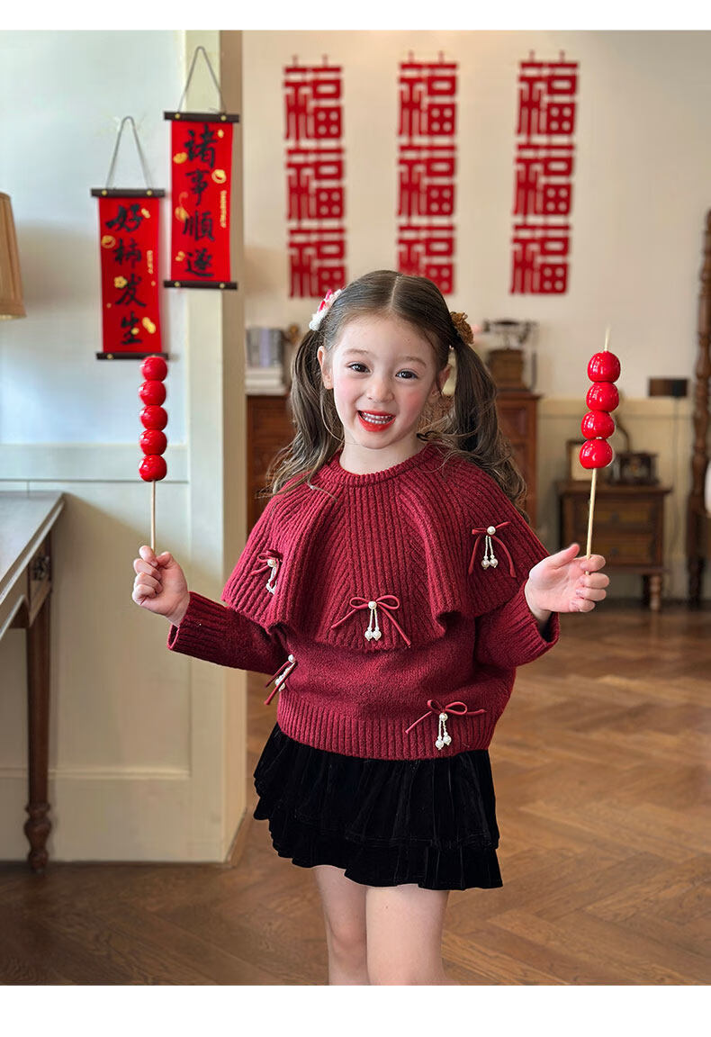 栀了成长记女童装红色新年针织上衣2025冬季儿童韩版时髦毛衣套装 红色 毛衣送披肩 100 cm