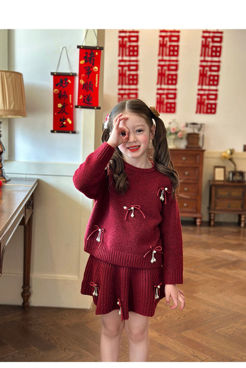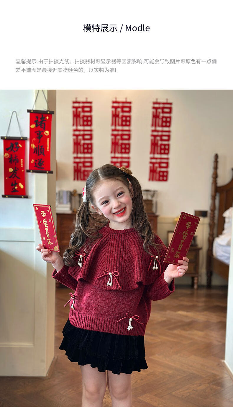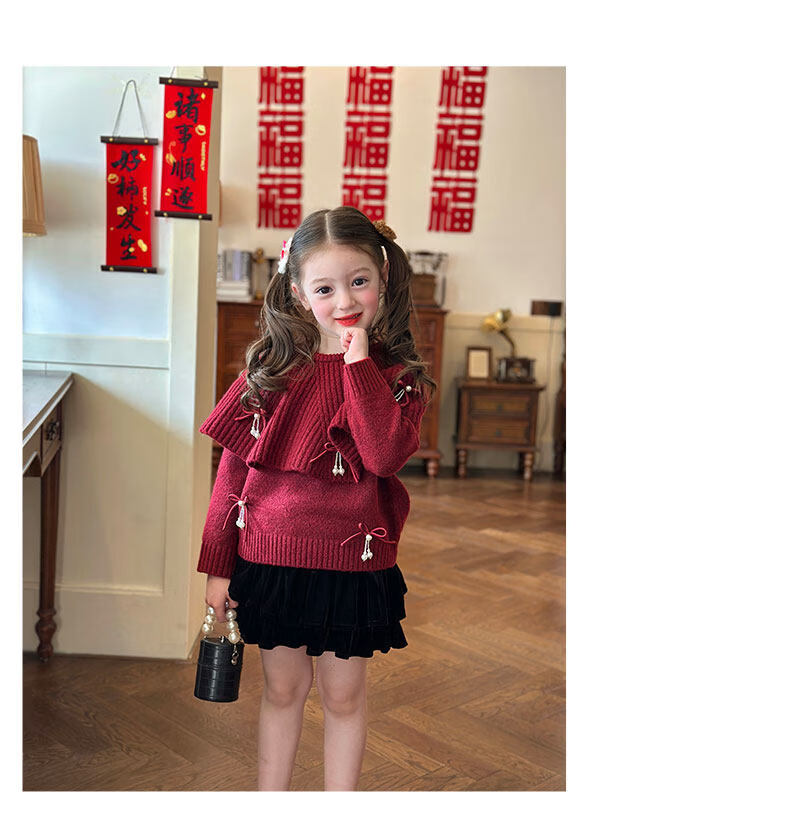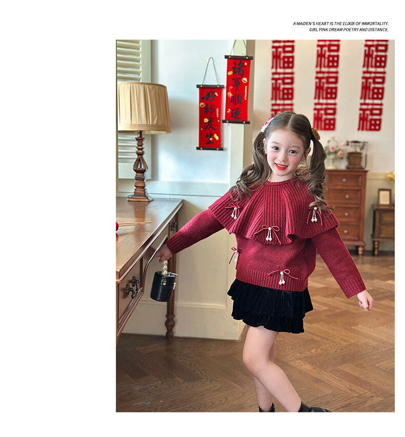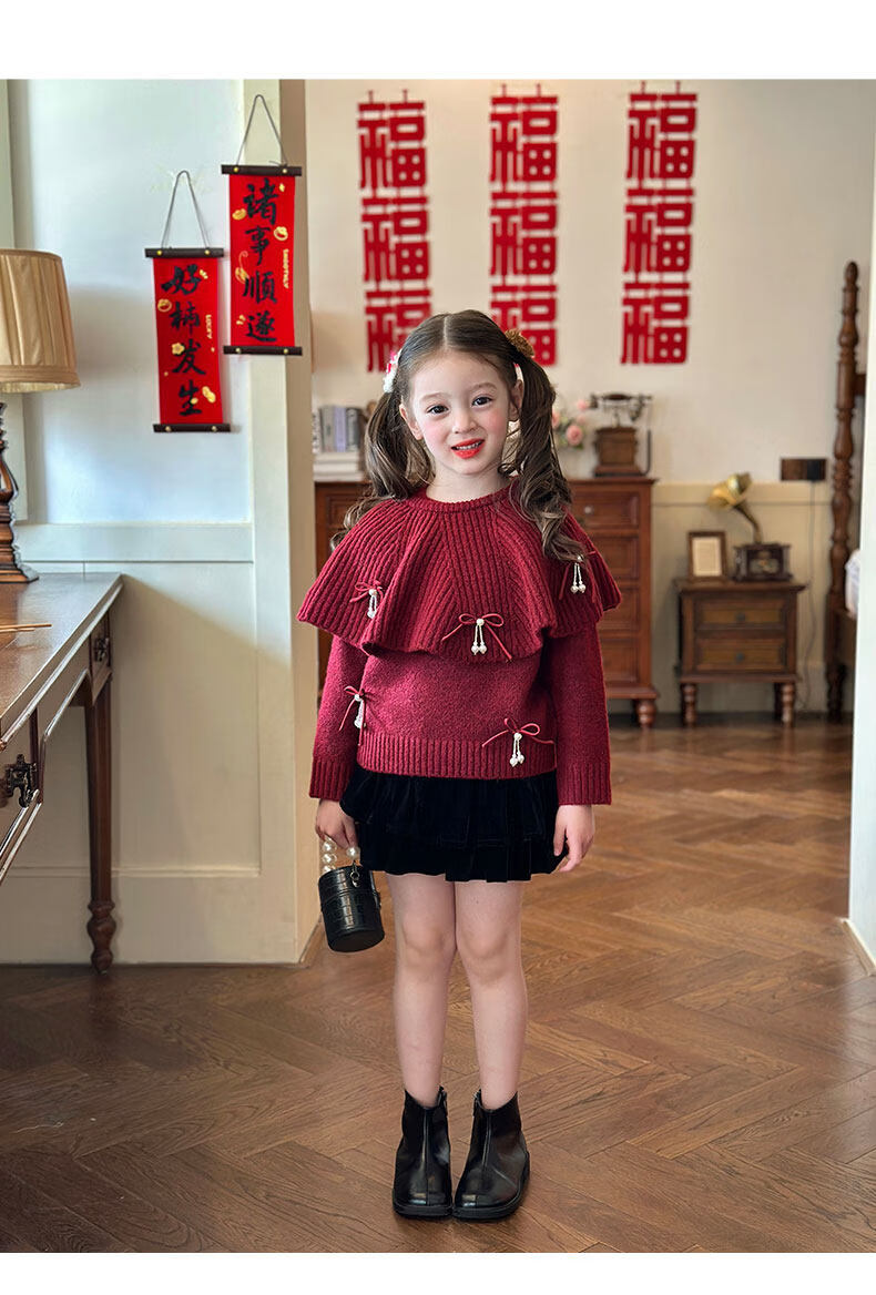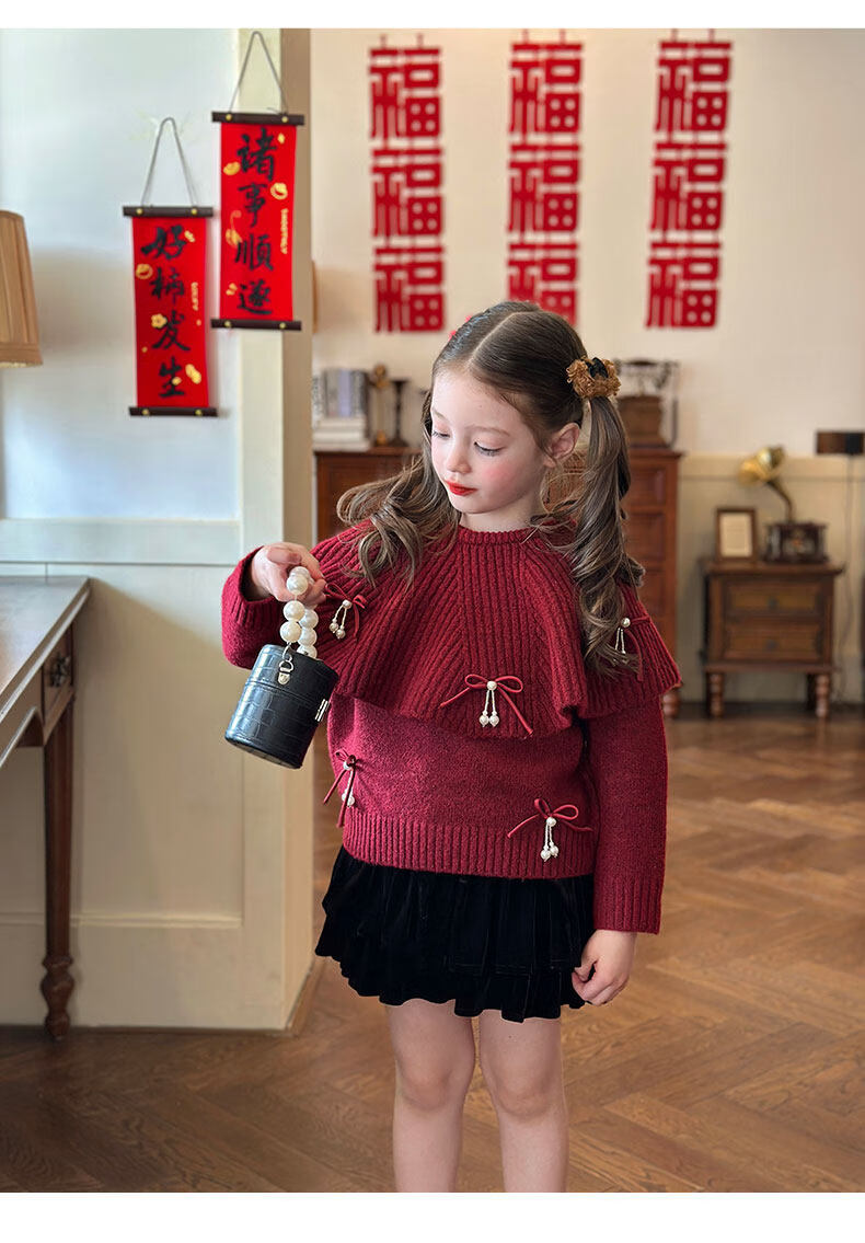 栀了成长记女童装红色新年针织上衣2025冬季儿童韩版时髦毛衣套装 红色 毛衣送披肩 100 cm
