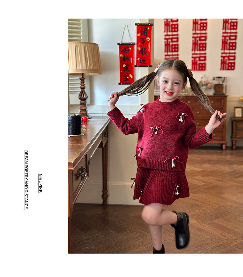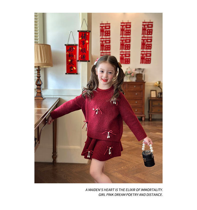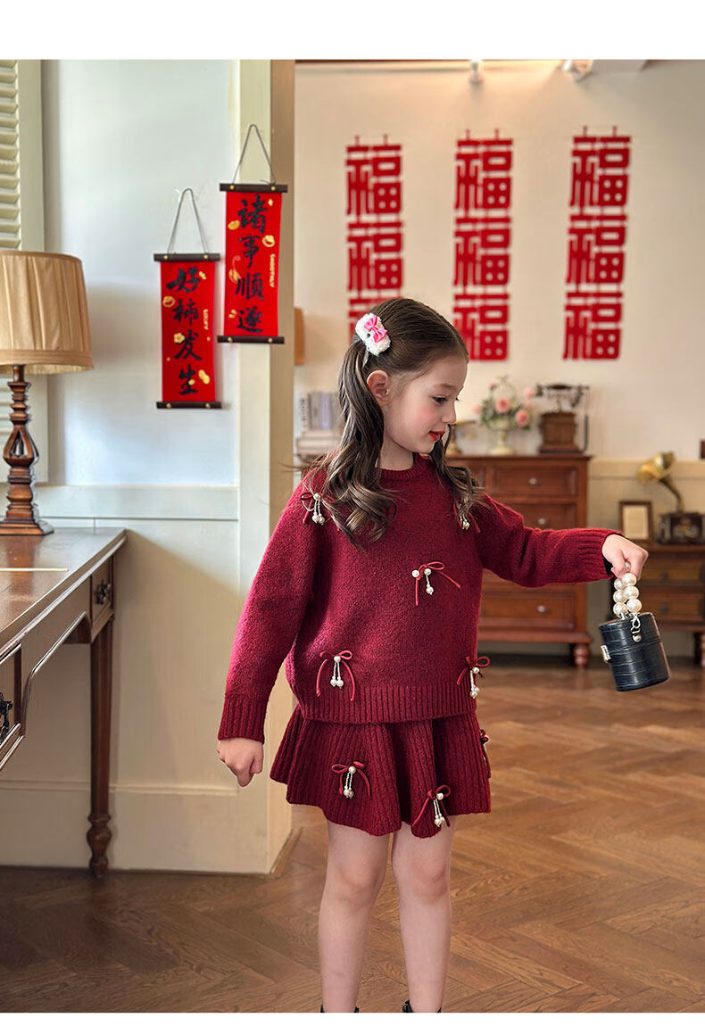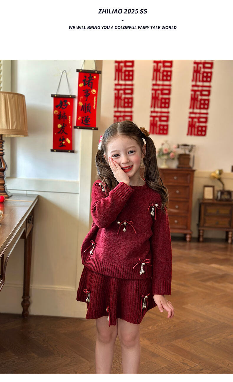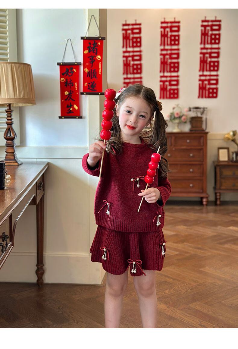 栀了成长记女童装红色新年针织上衣2025冬季儿童韩版时髦毛衣套装 红色 毛衣送披肩 100 cm