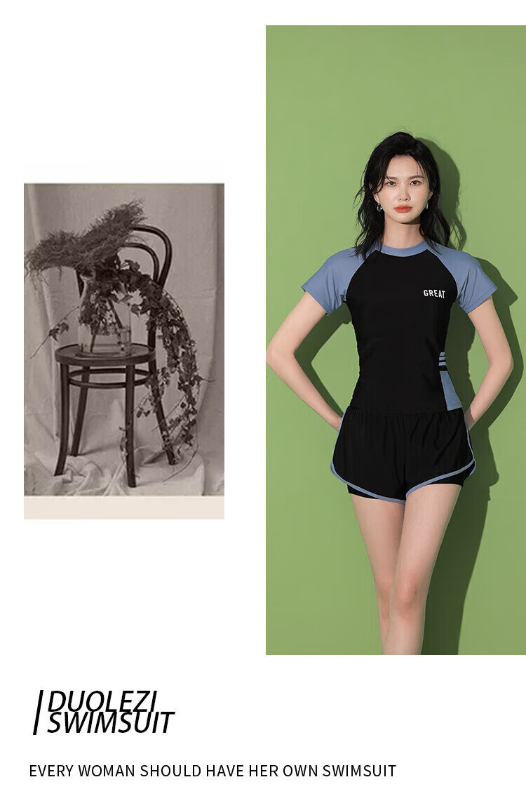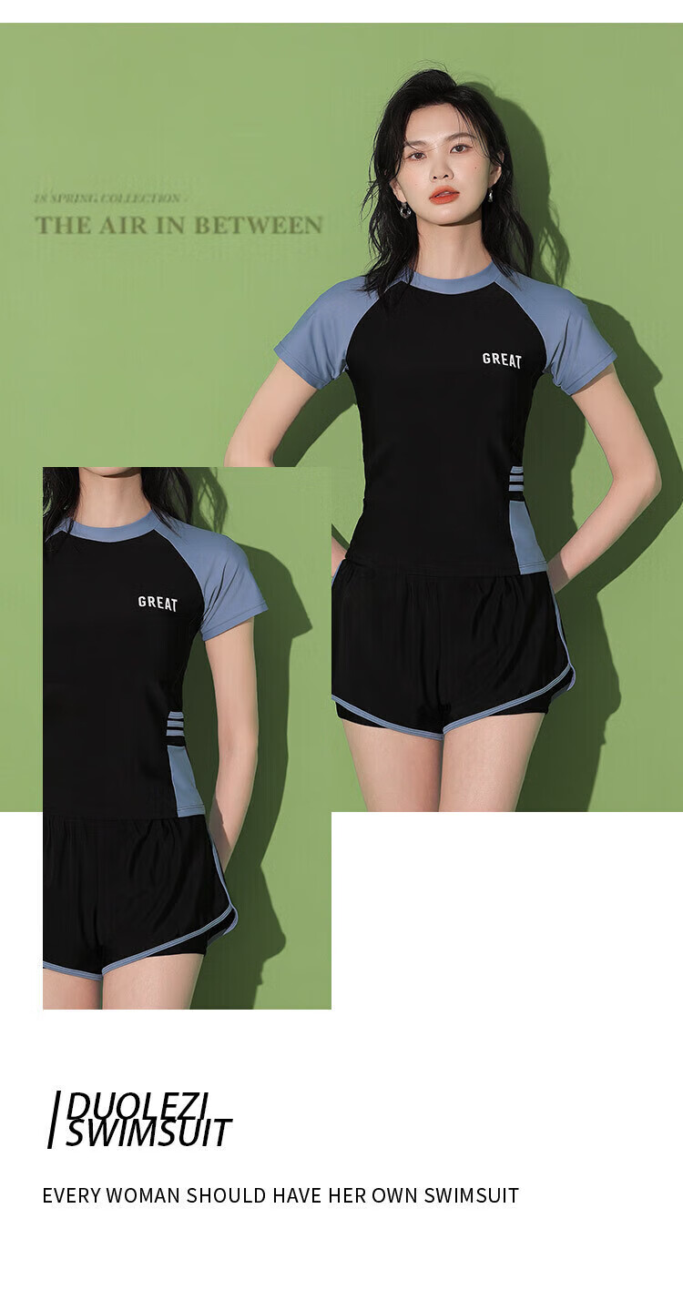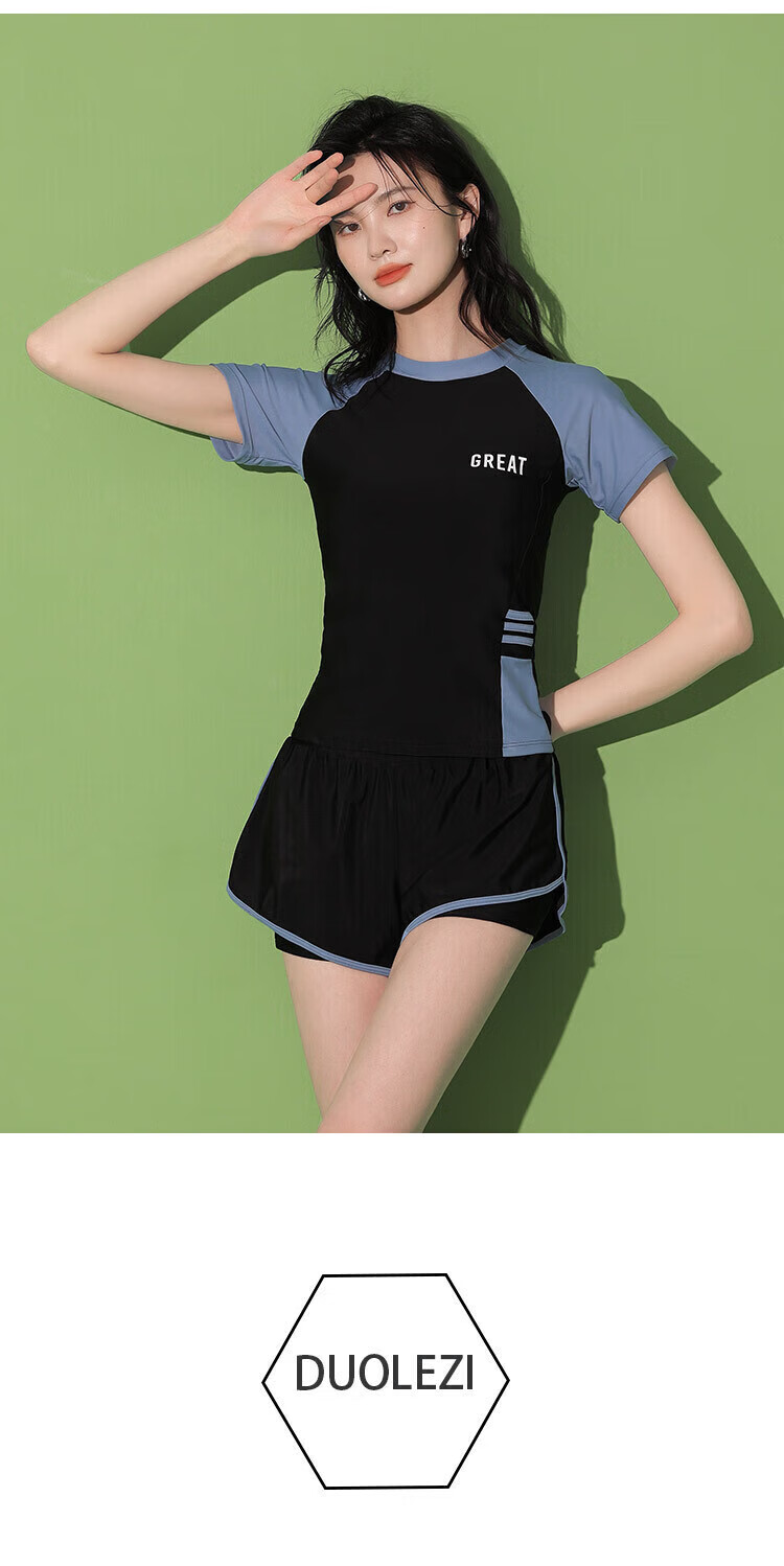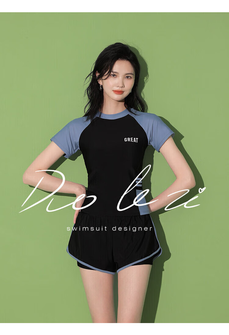 东方骆驼游泳衣女保守分体式两件套遮肚显瘦2026新款学生上课感泡温泉 黑搭蓝 L 建议体重100-110斤