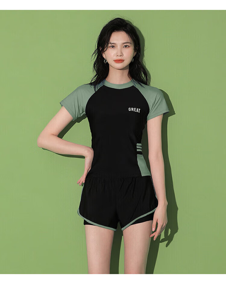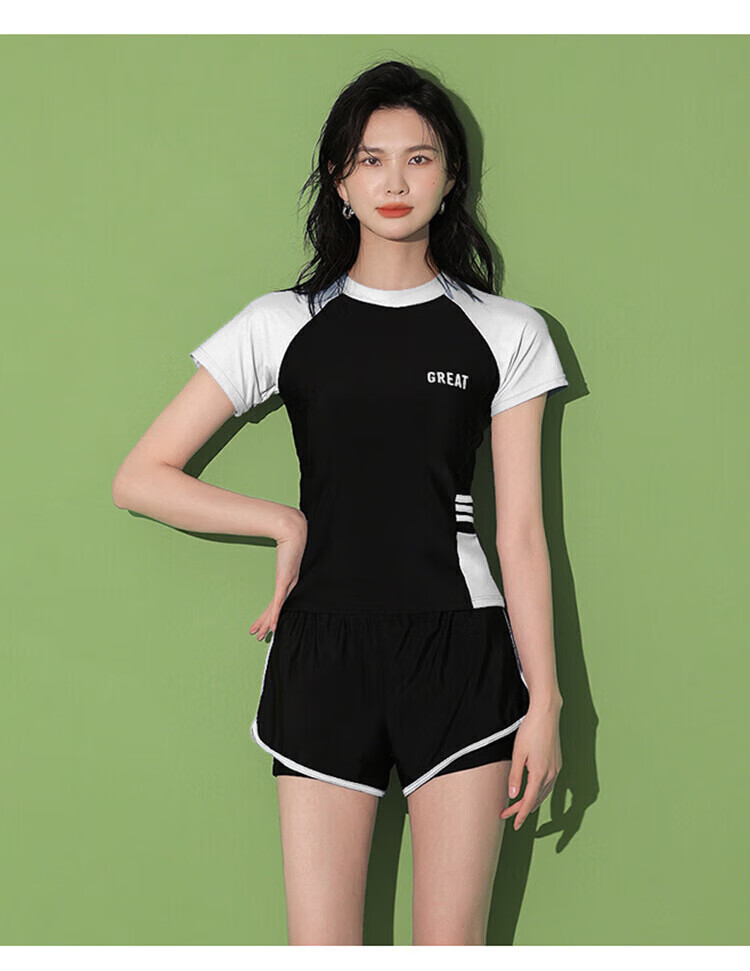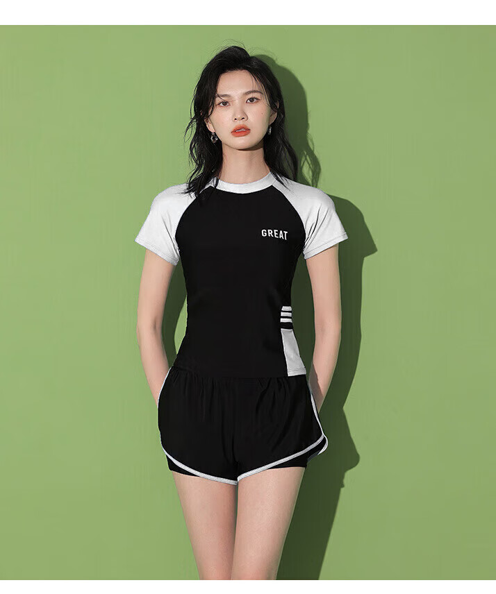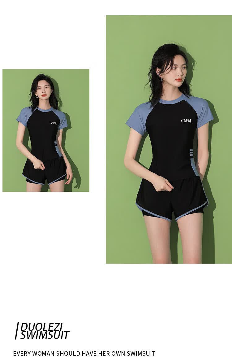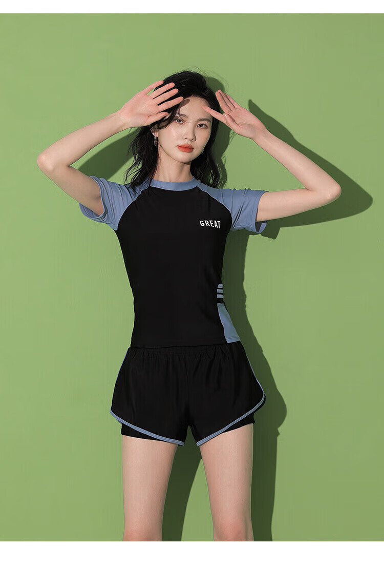 东方骆驼游泳衣女保守分体式两件套遮肚显瘦2026新款学生上课感泡温泉 黑搭蓝 L 建议体重100-110斤