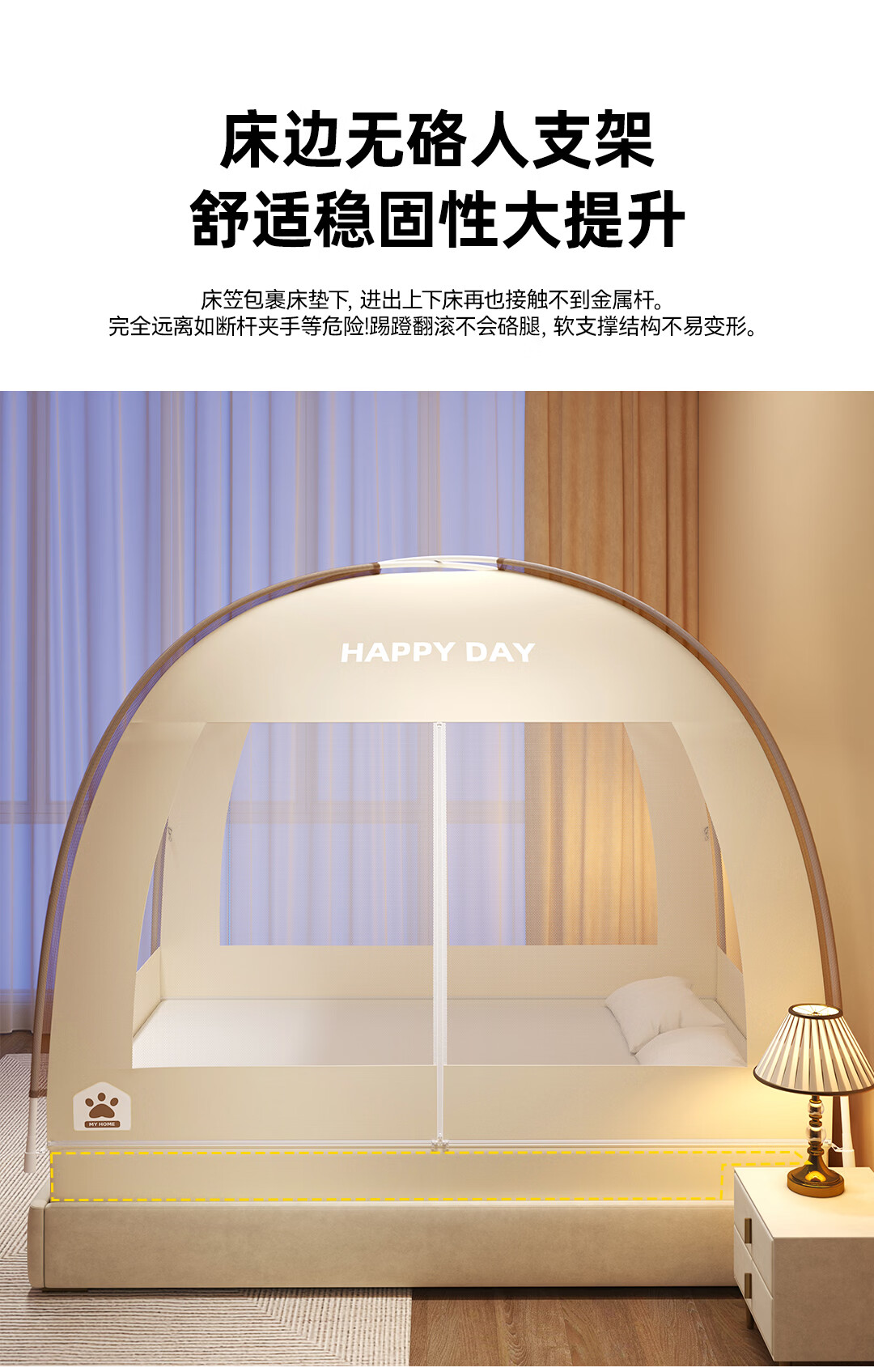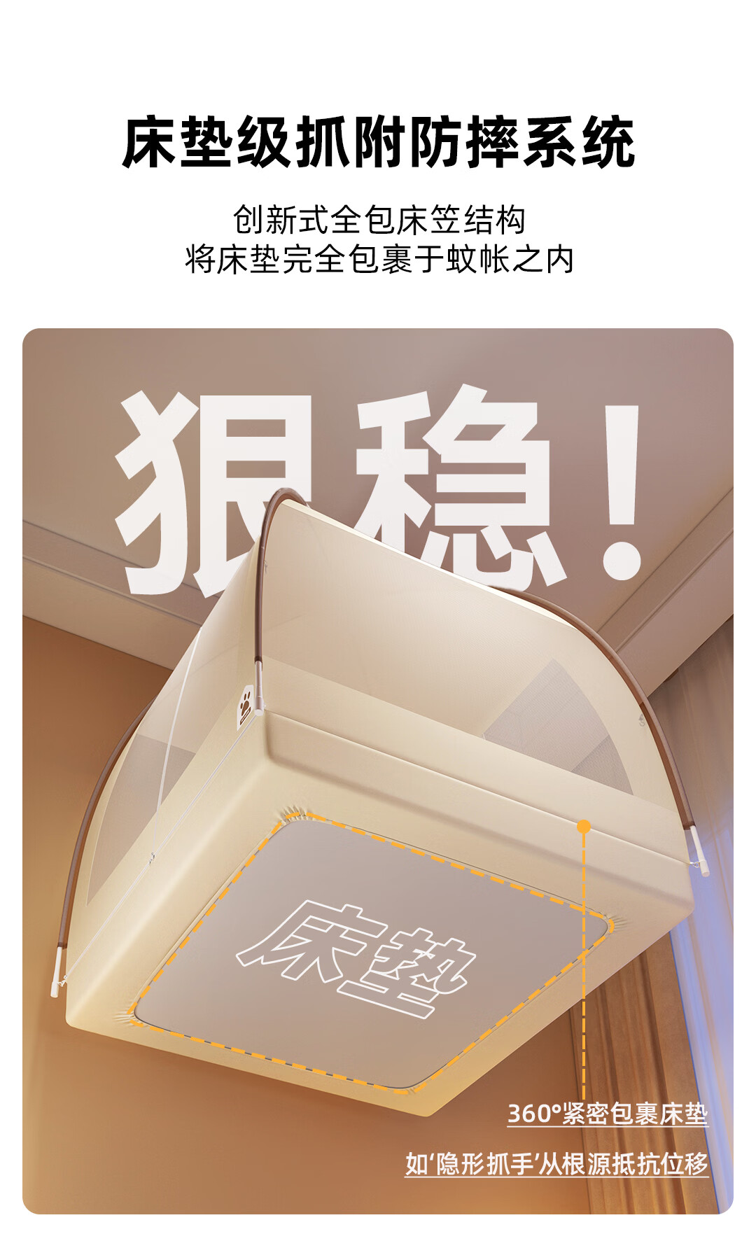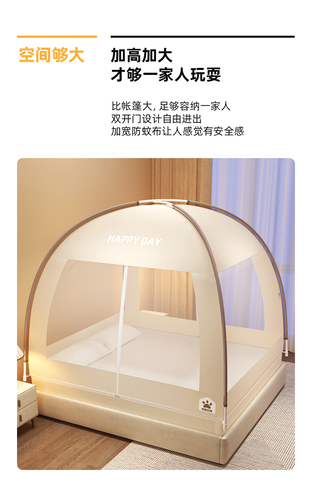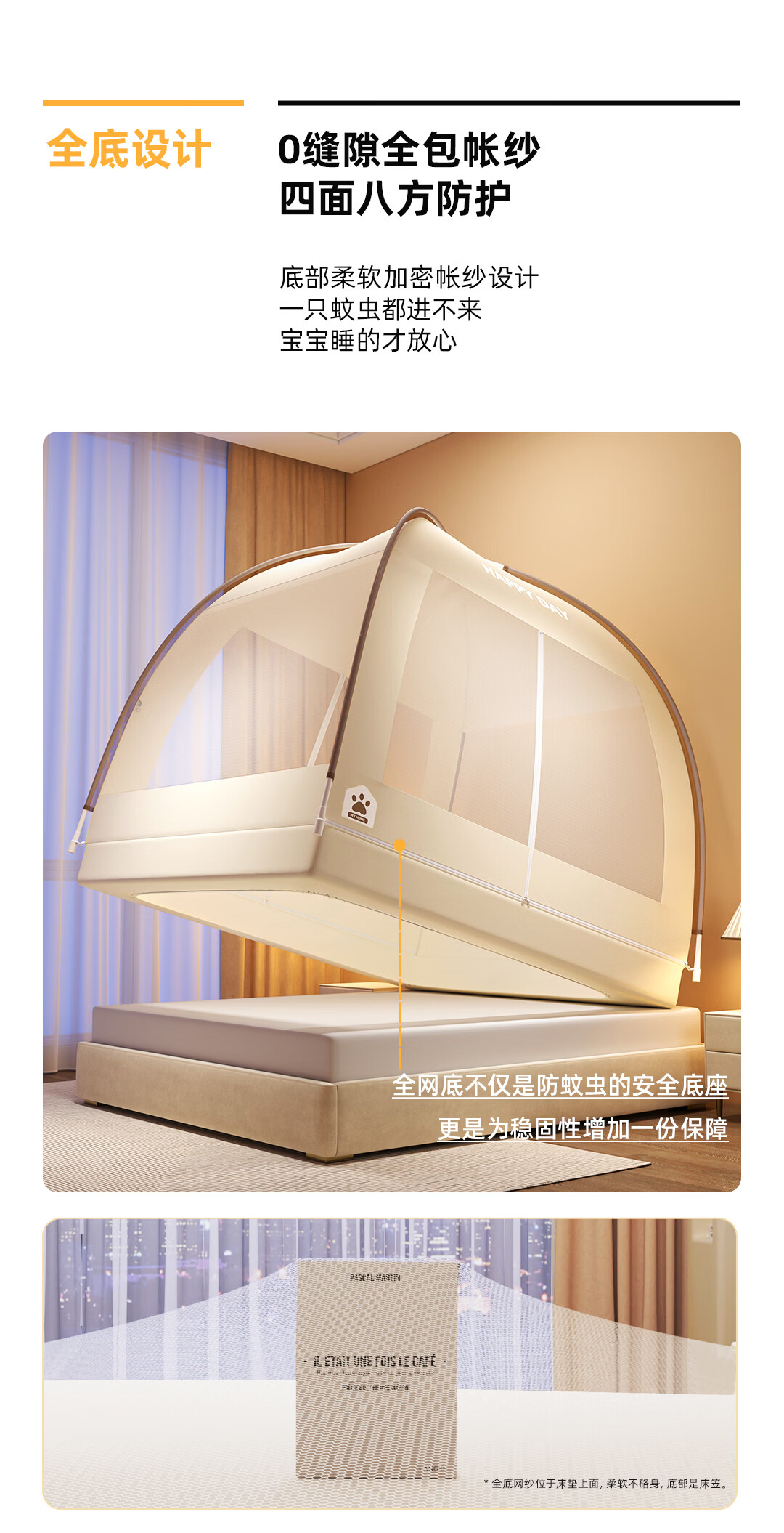 高睿2026新款床笠式蒙古包蚊帐免安装可折叠双开门儿童防蚊A类大空间 【床笠款-浅米咖】 【1.5宽*2.0长】免安装-双开门