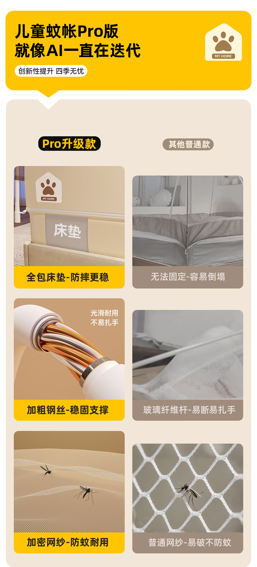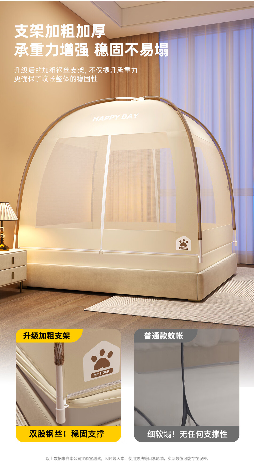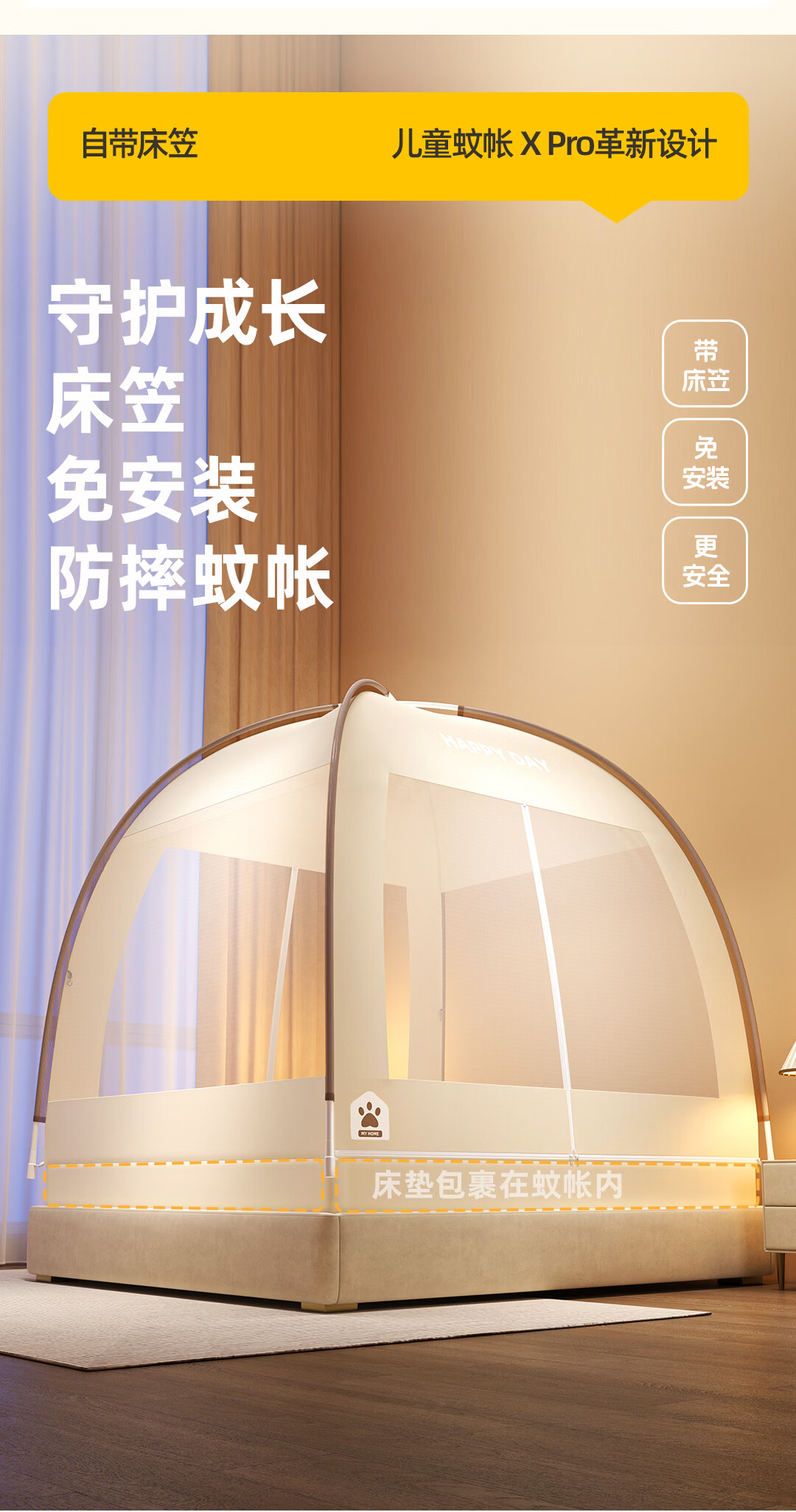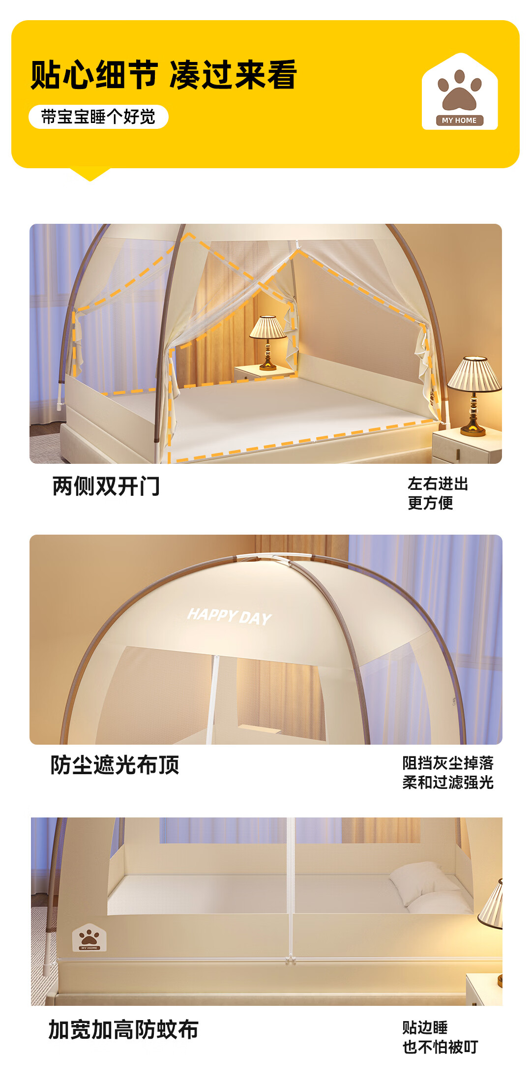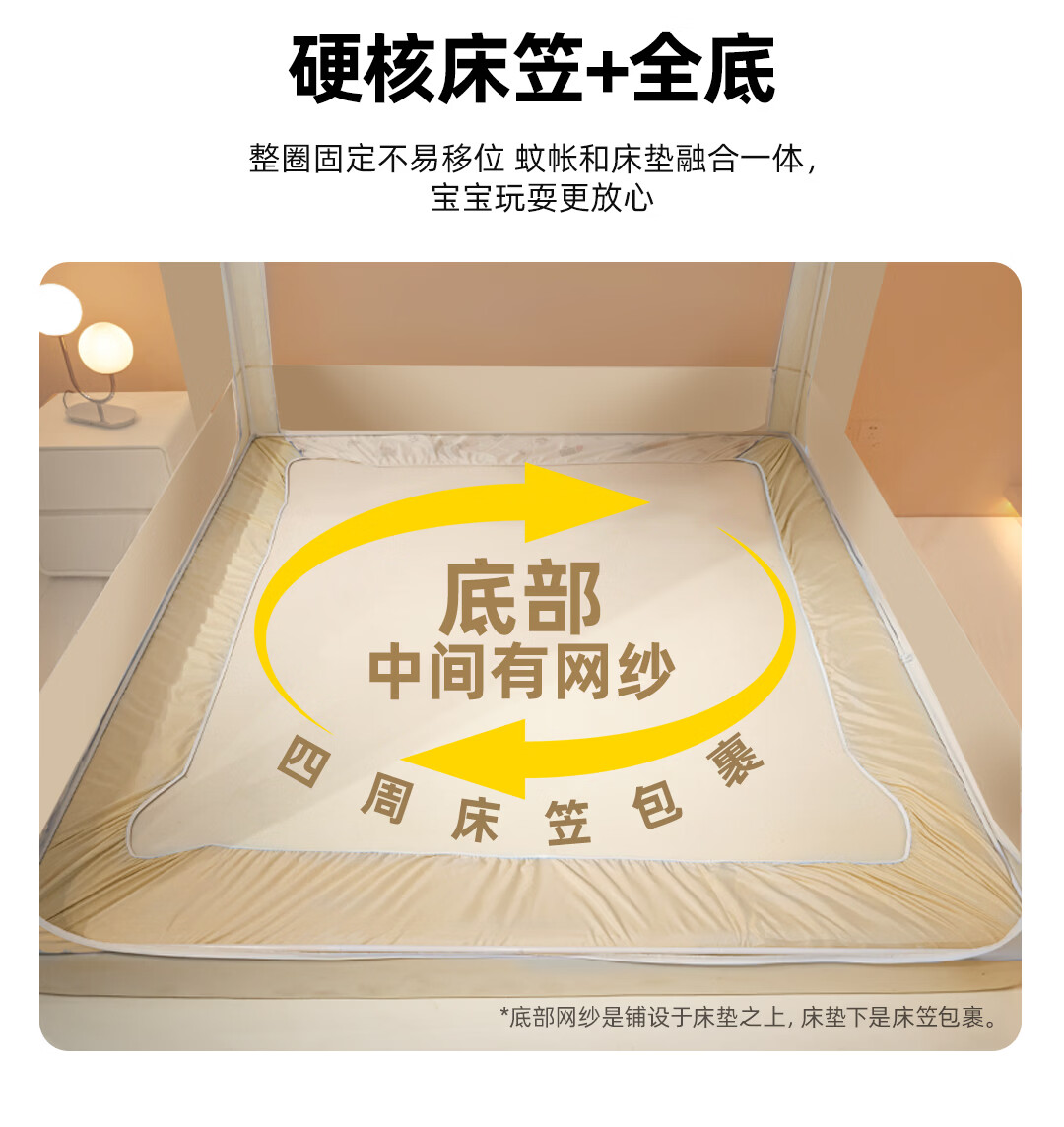 高睿2026新款床笠式蒙古包蚊帐免安装可折叠双开门儿童防蚊A类大空间 【床笠款-浅米咖】 【1.5宽*2.0长】免安装-双开门