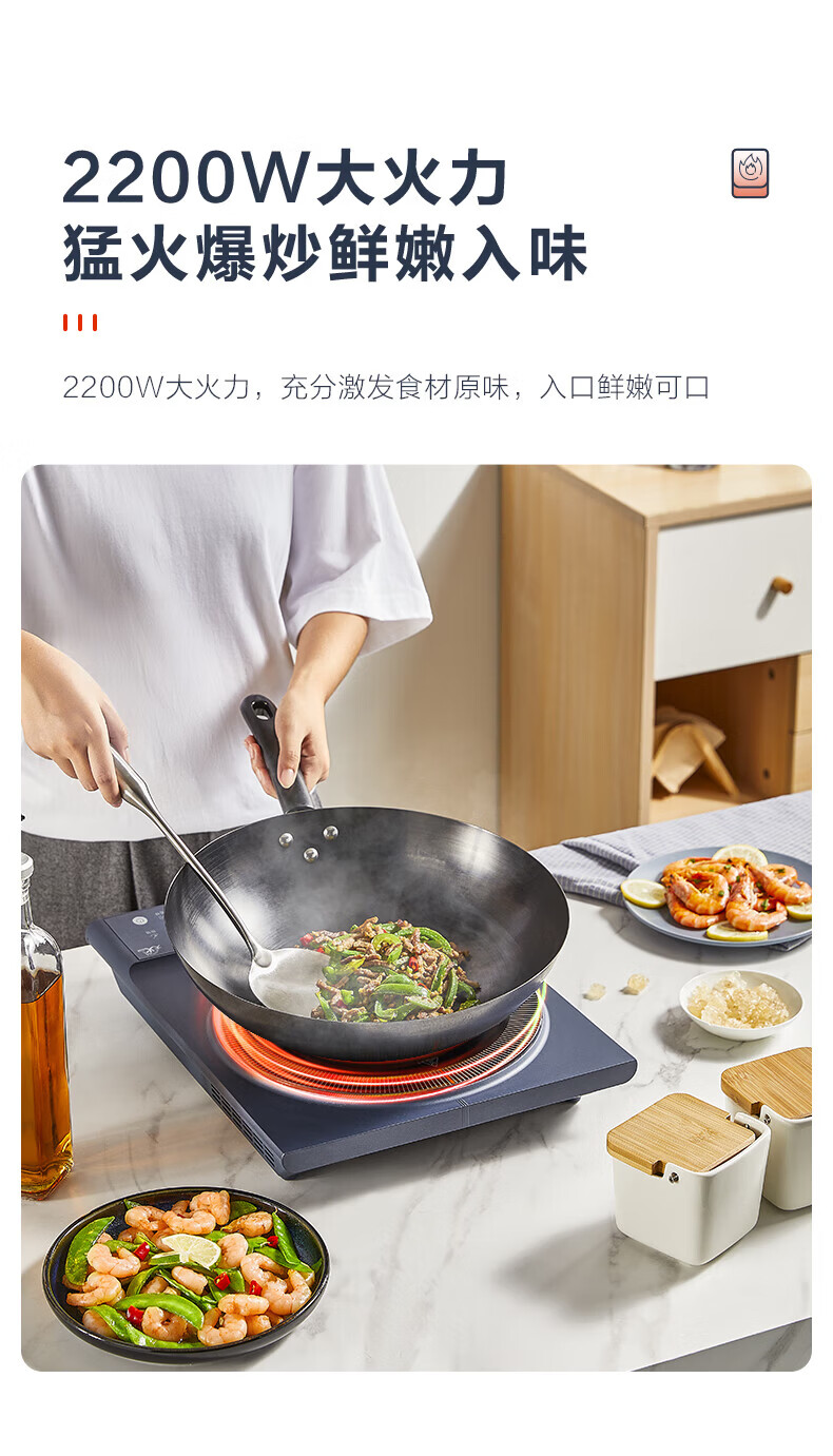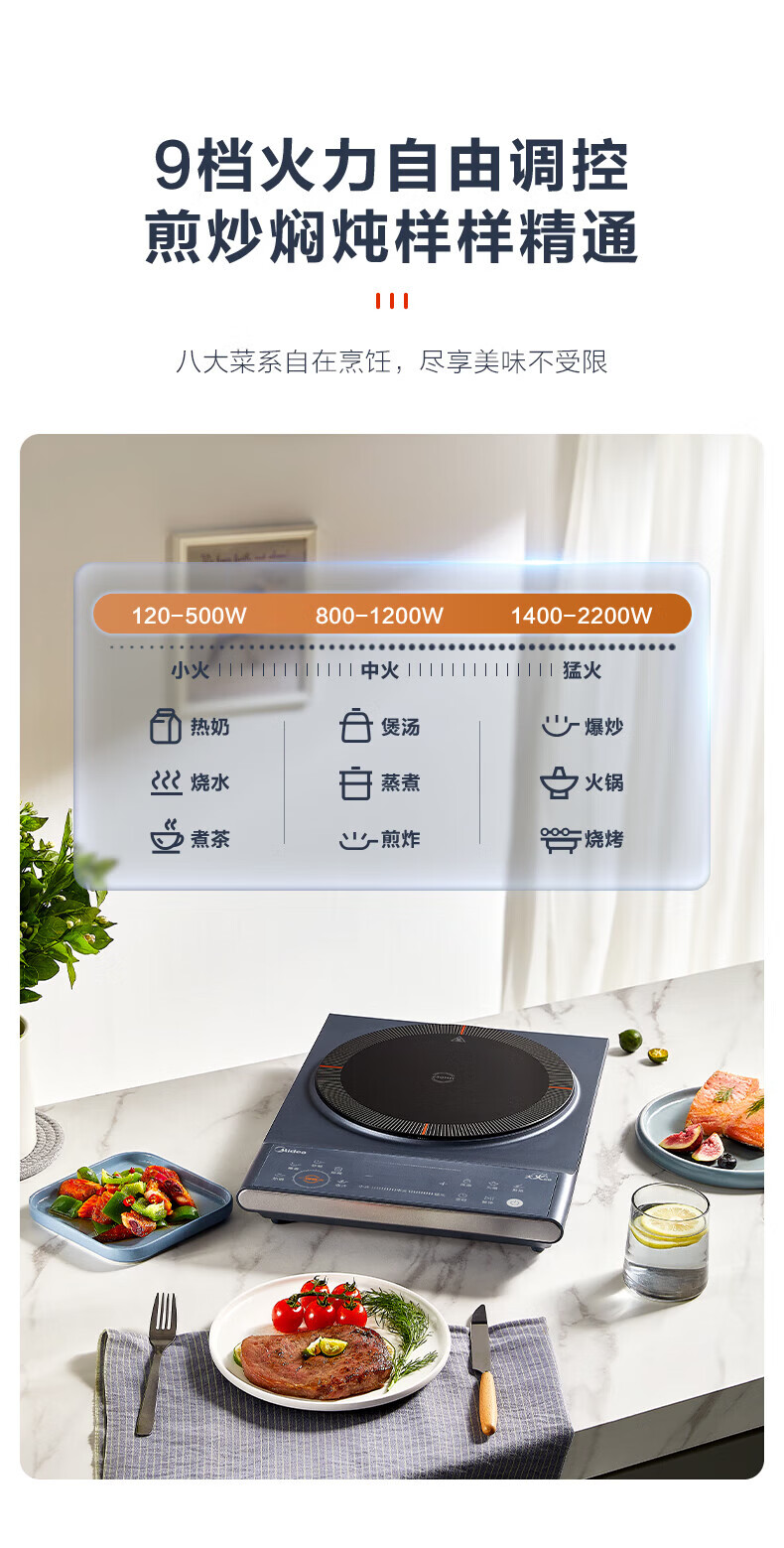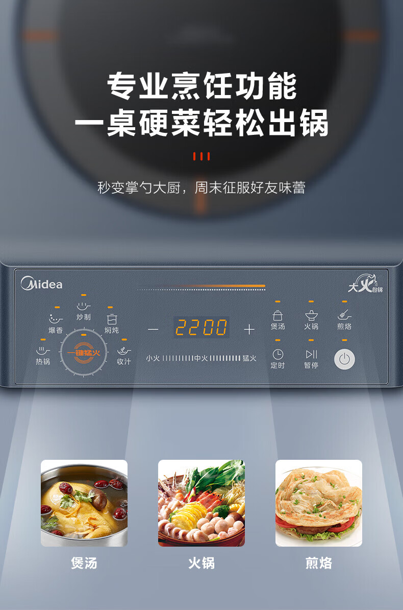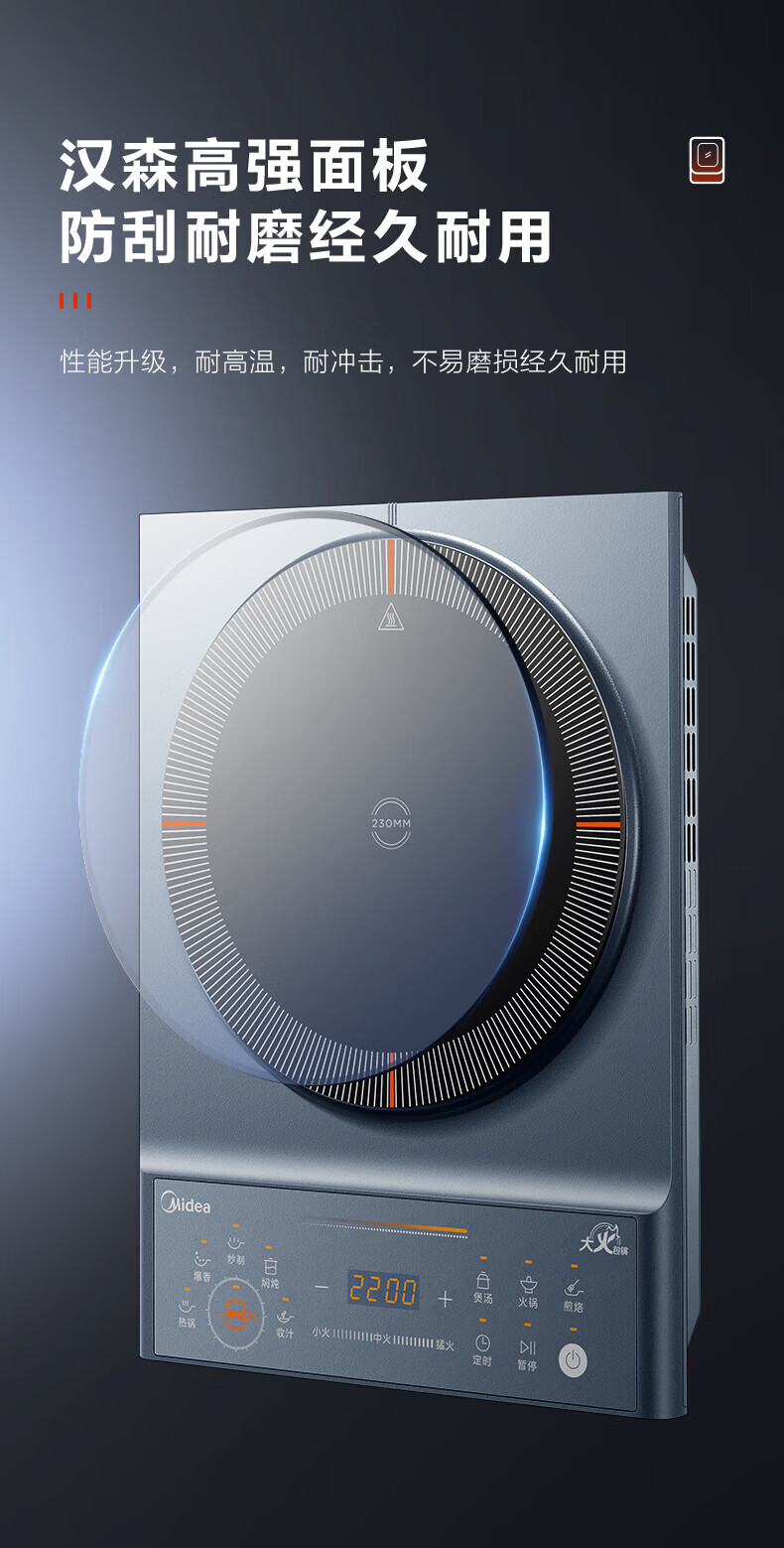 美的(Midea)电磁炉电陶炉 家用2200W大功率匀火加热爆炒火锅炉九档火力智能定时专业烹饪功能一体面板防水耐刮 【单灶2200W】MC-CLC2266