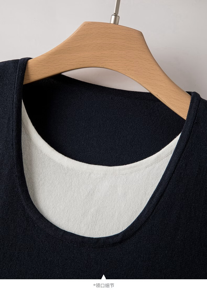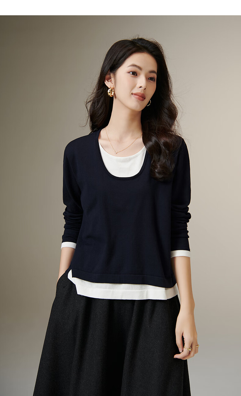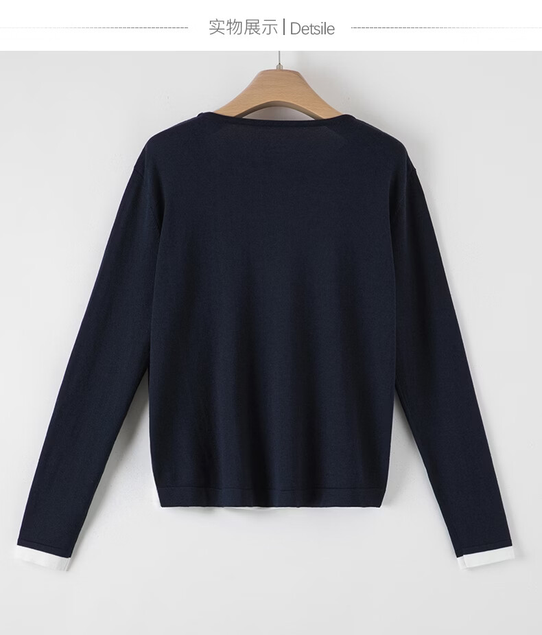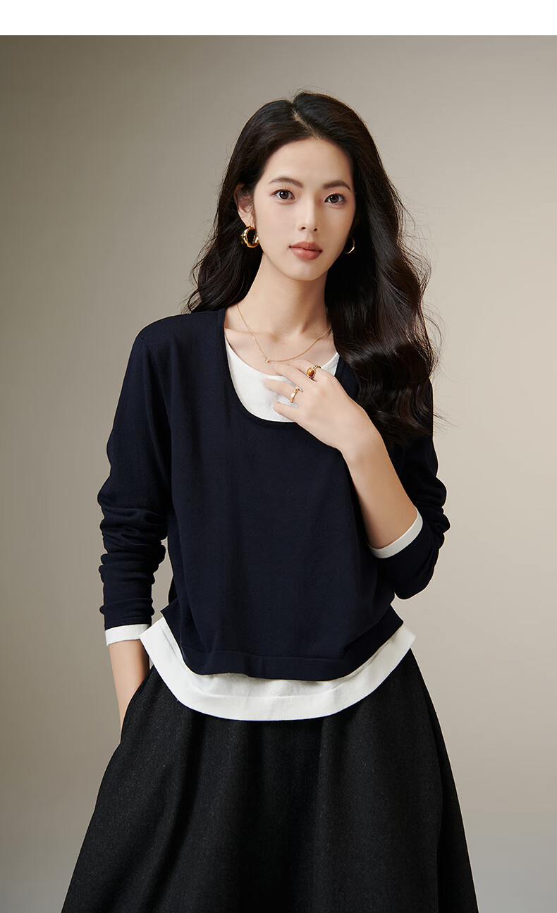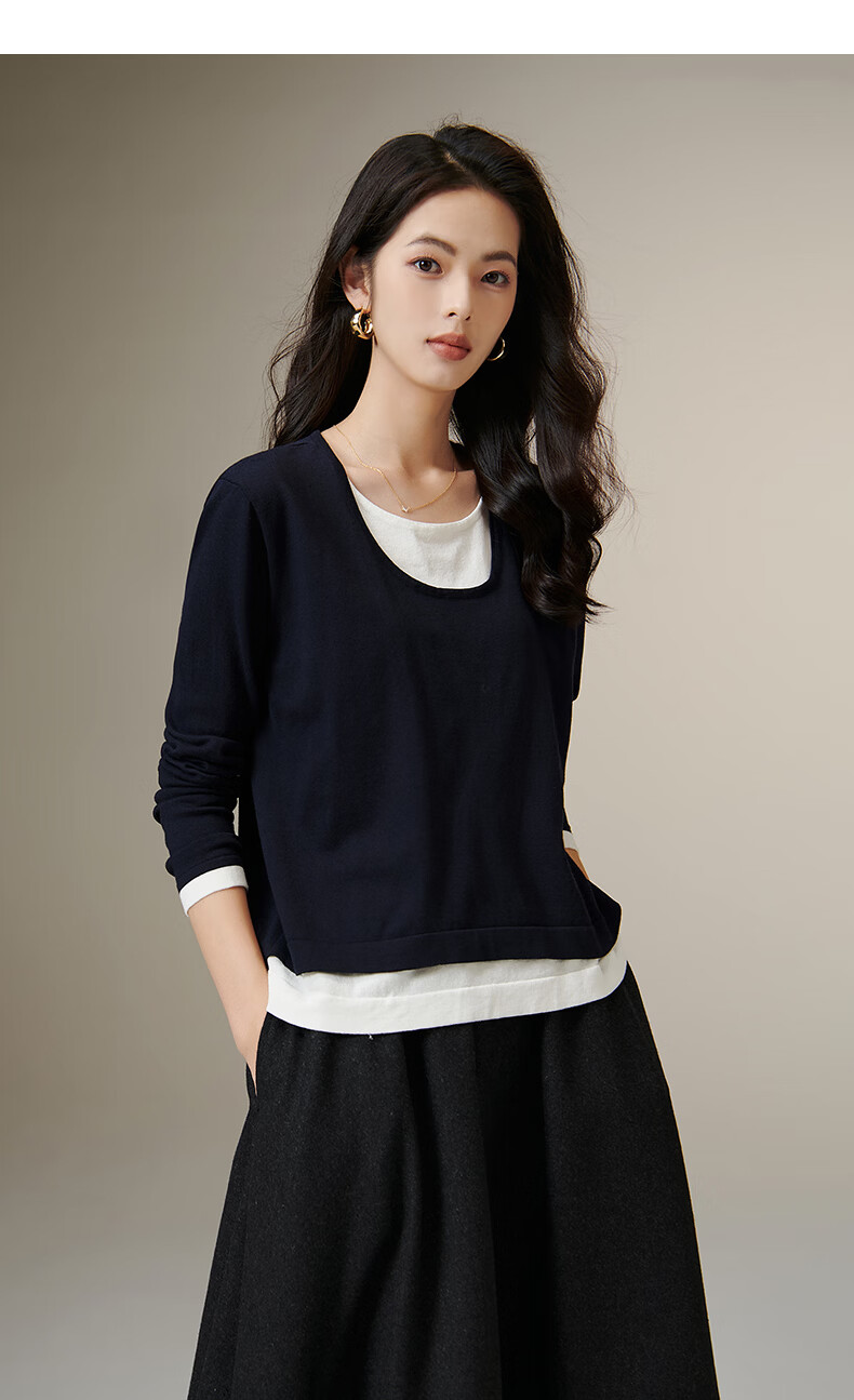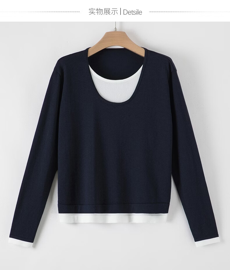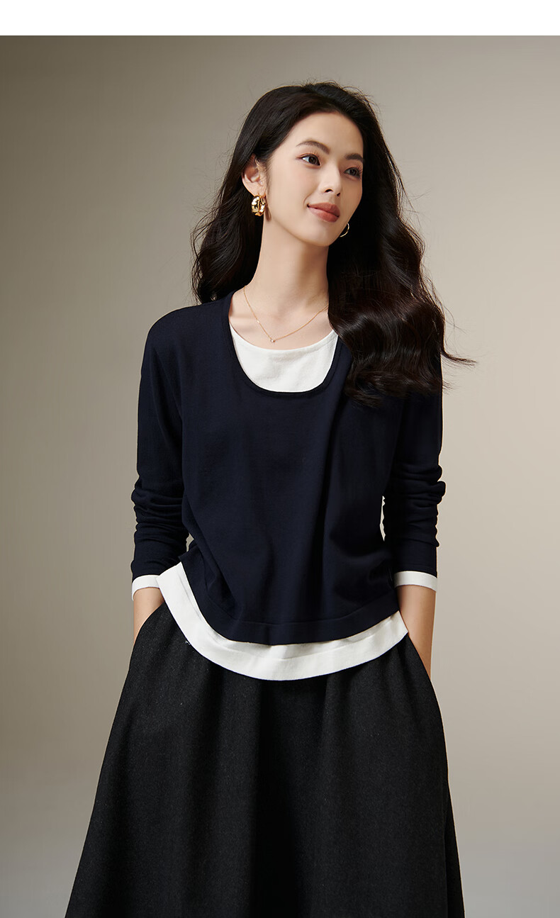 晚白【新品】2026春季时尚假两件上衣舒适亲肤棉质莱赛尔大码针织衫 藏蓝色 M