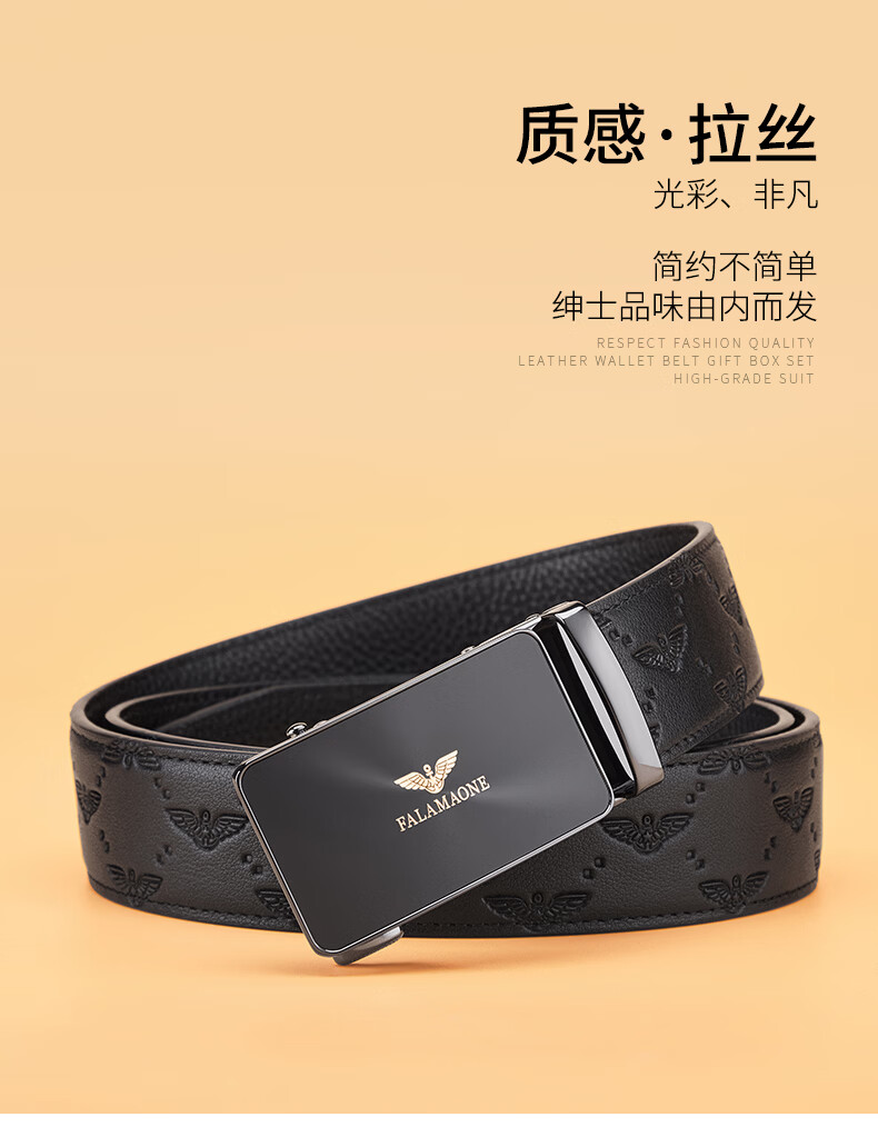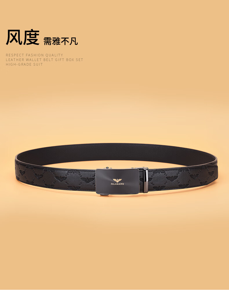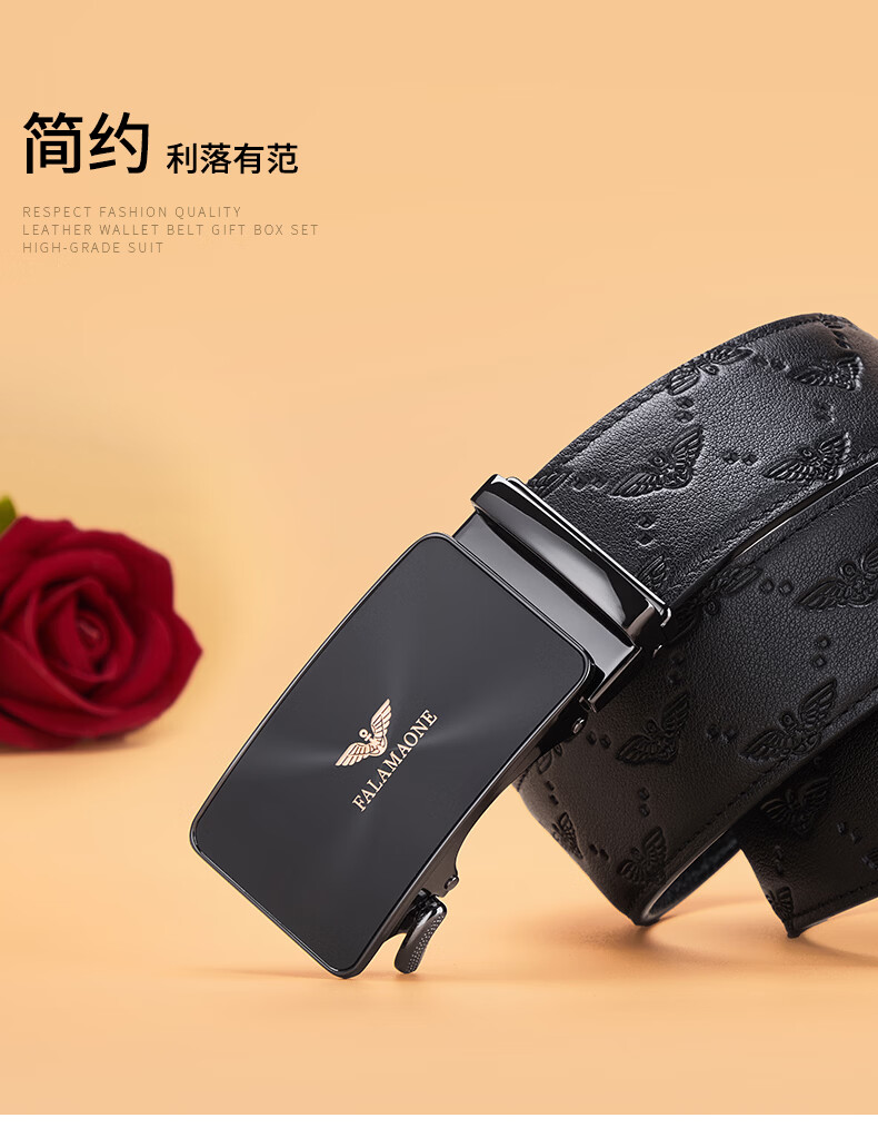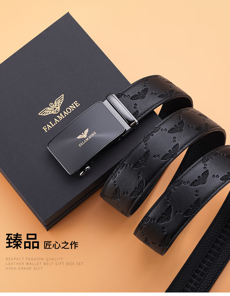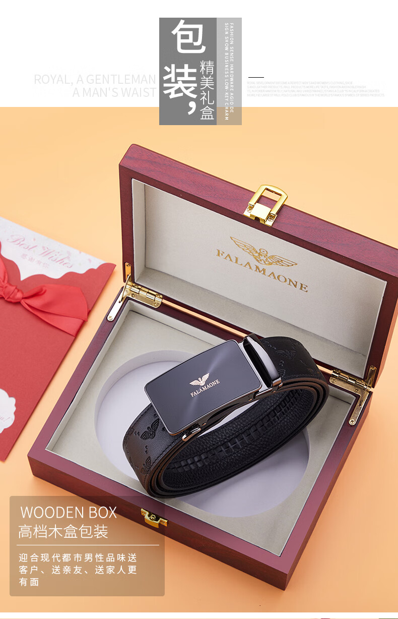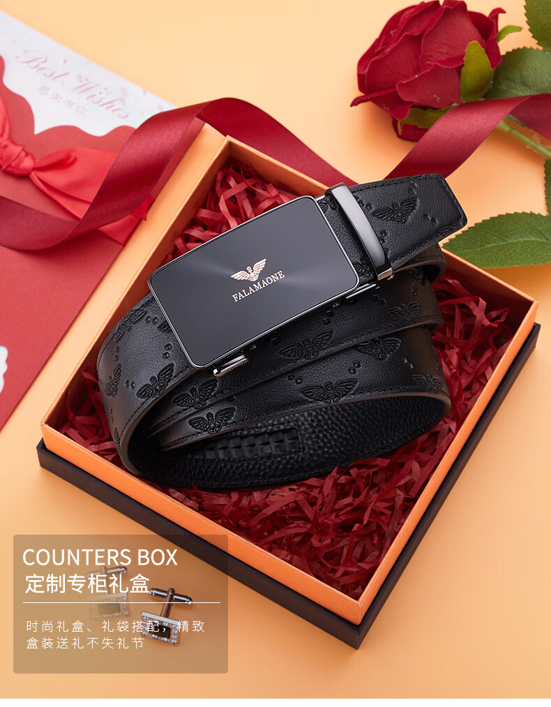 FALAMAONE法莱阿玛尼男士腰带真皮奢侈品正品2025经典款牛皮皮带男士自动扣 新款压花纹【花束+实木礼盒】 120cm 改尺寸下单备注或联系客服