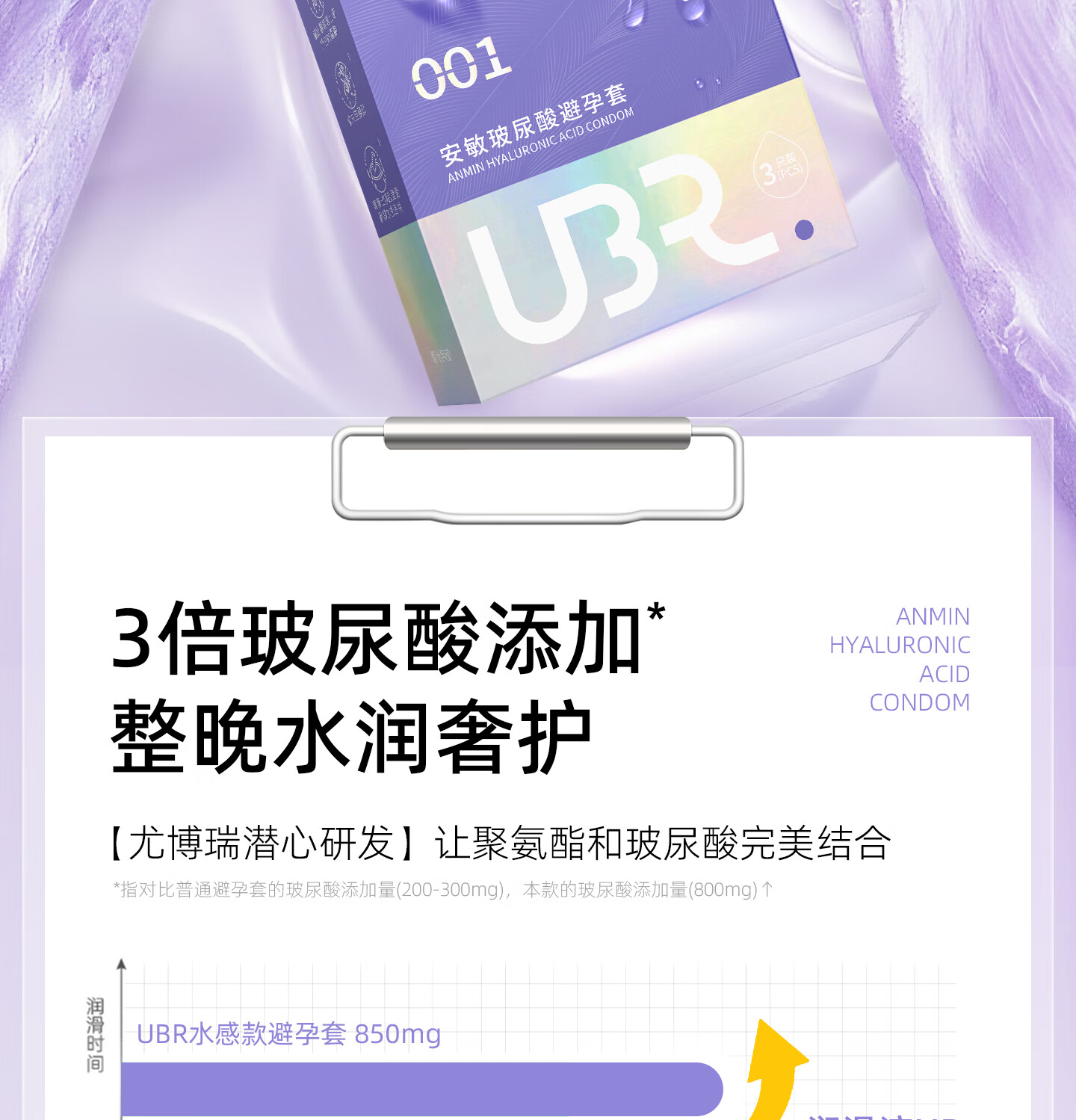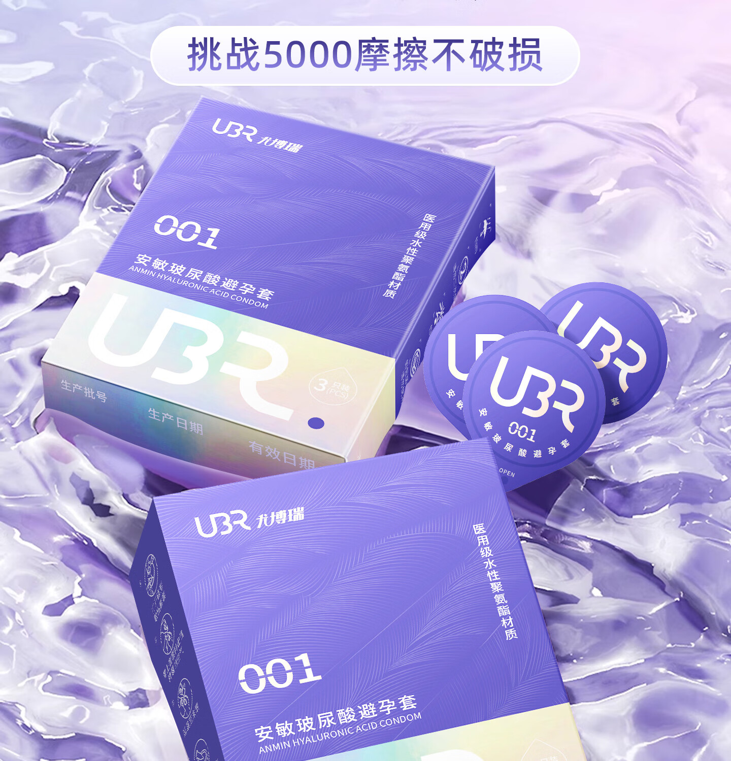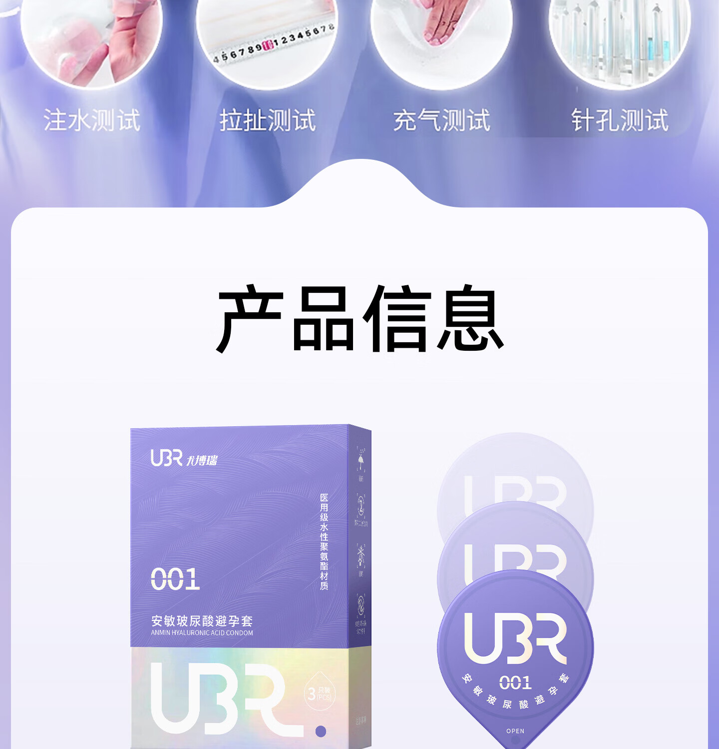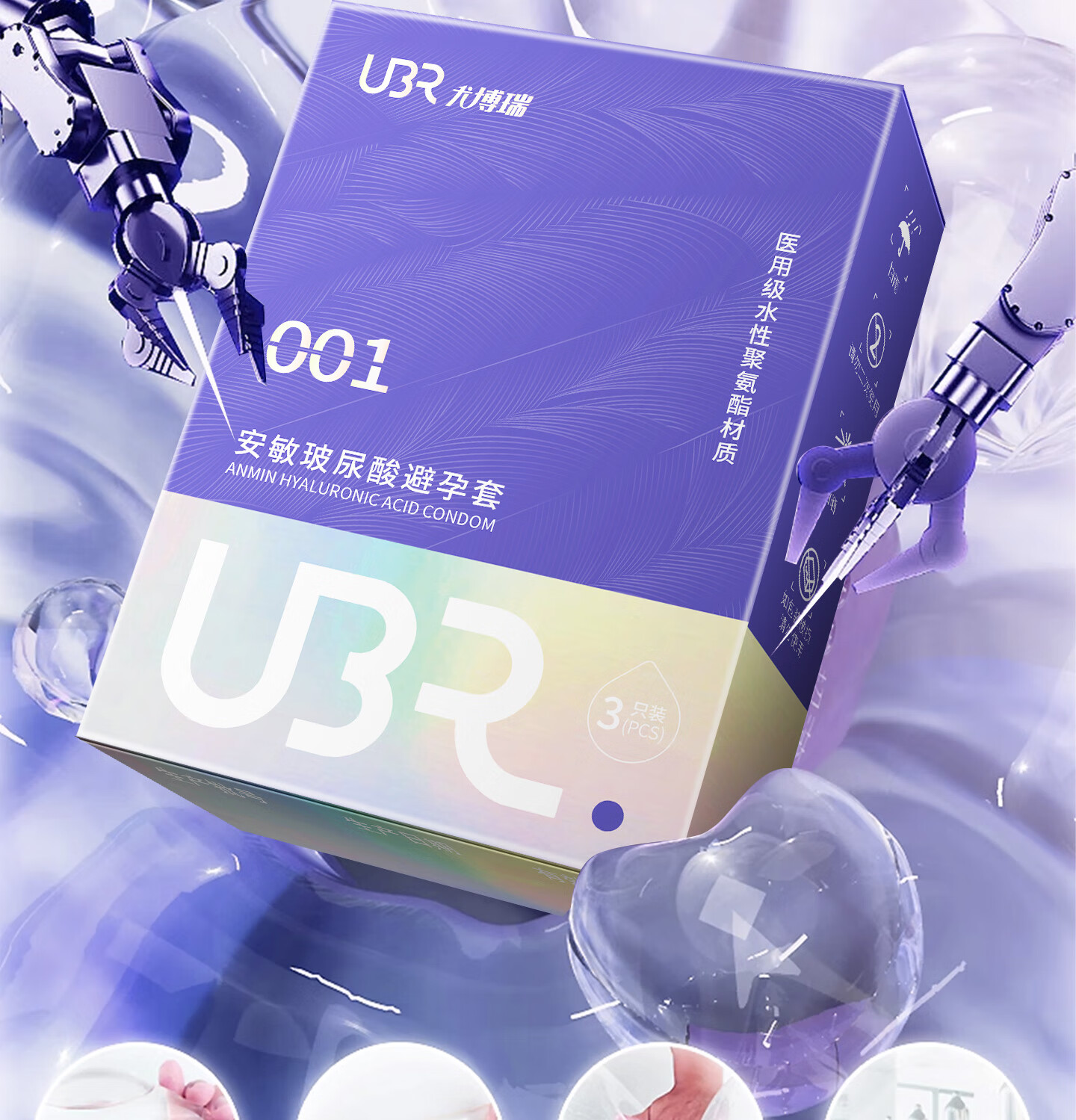 UBR尤博瑞聚氨酯001避孕套 超薄无感玻尿酸润滑持久8只装byt 【玻尿酸防HPV款】001玻尿酸3只