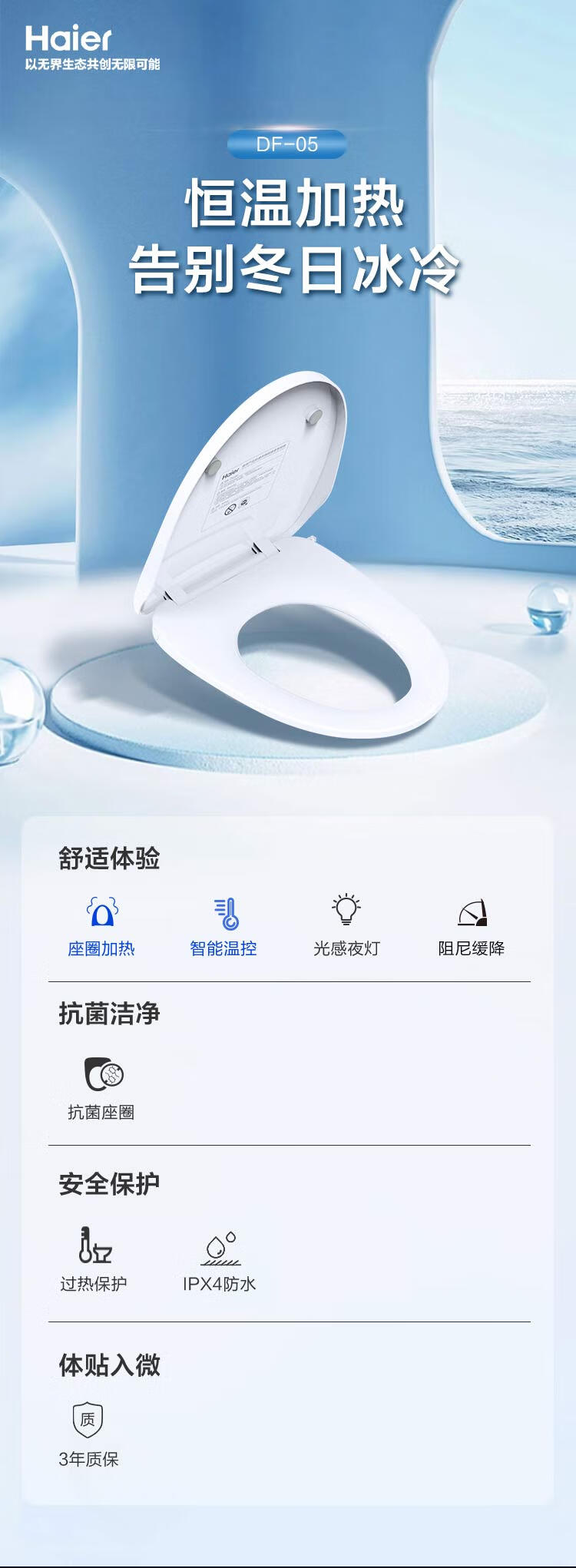 海尔(Haier) 智能马桶盖 座圈加热 夜灯照明 抗菌电动坐便盖 【无冲洗功能丨座圈加热丨不含安装】DF-05 【3年质保】