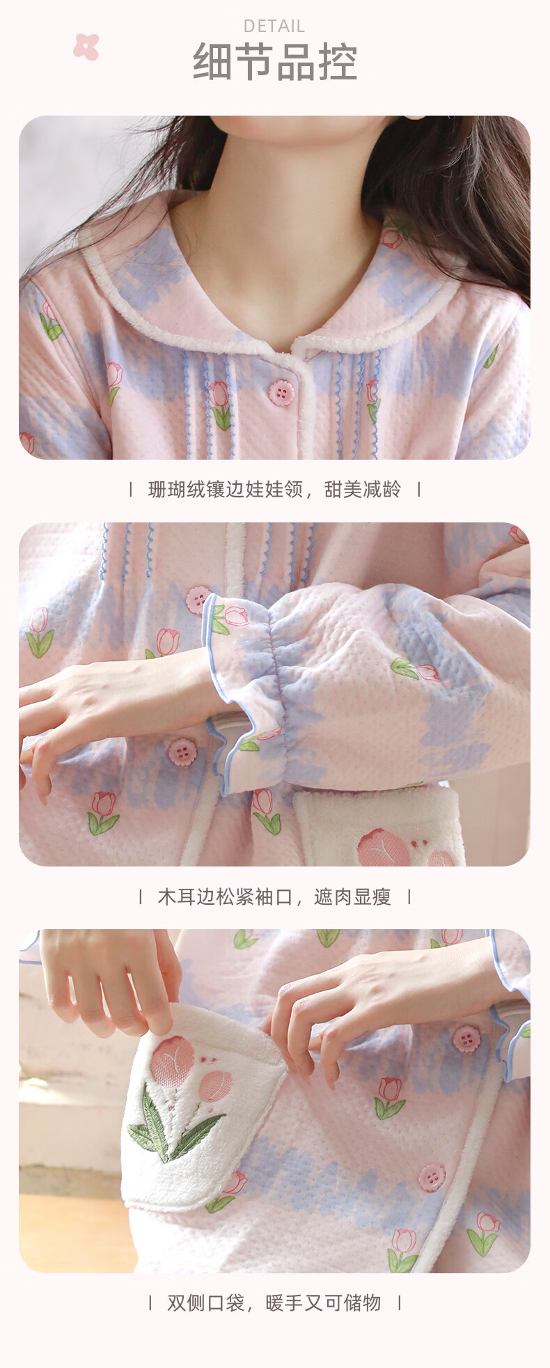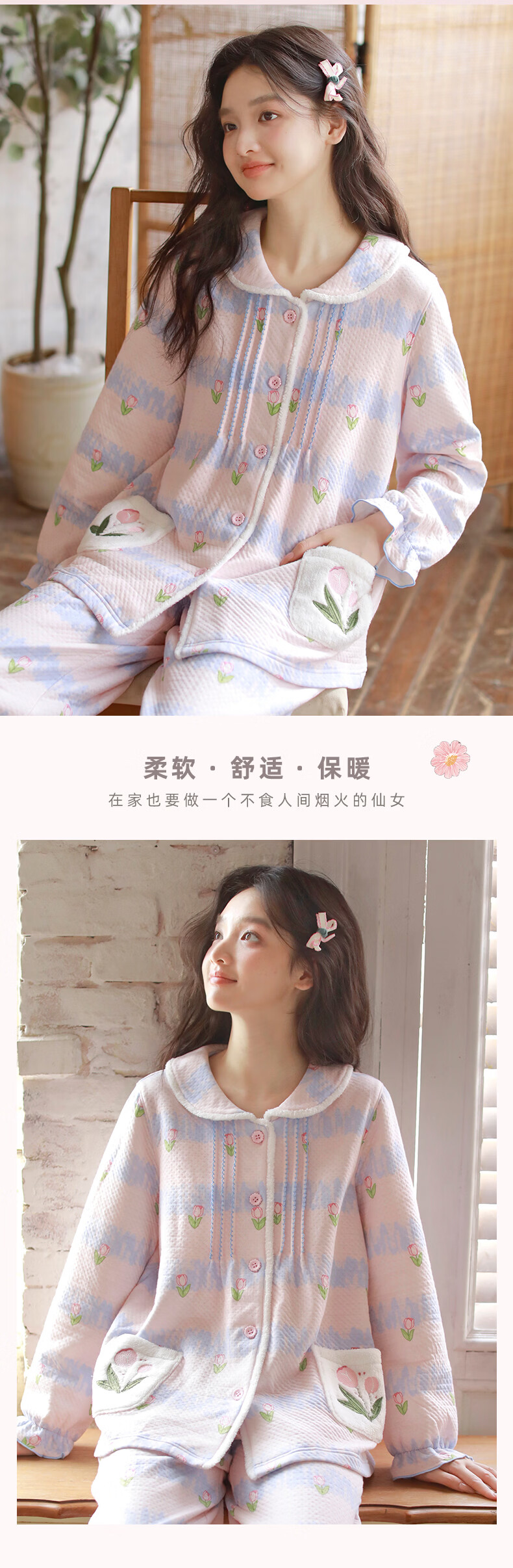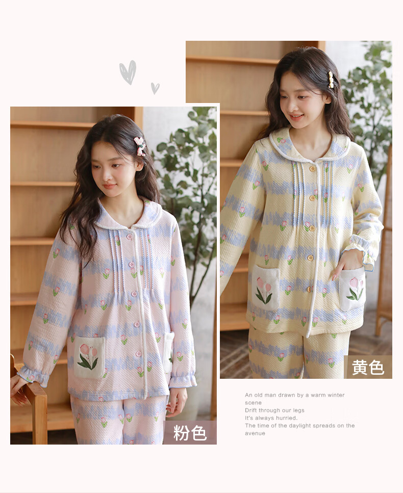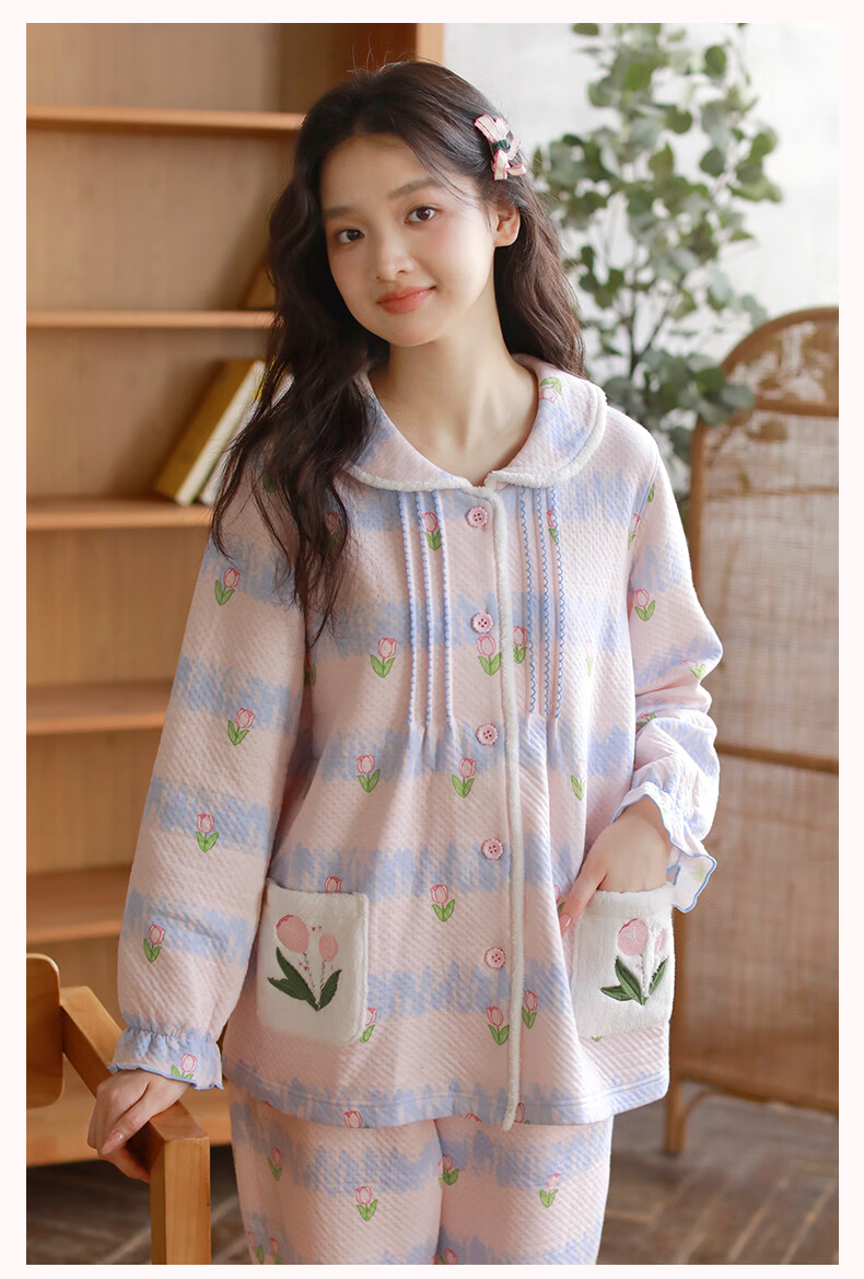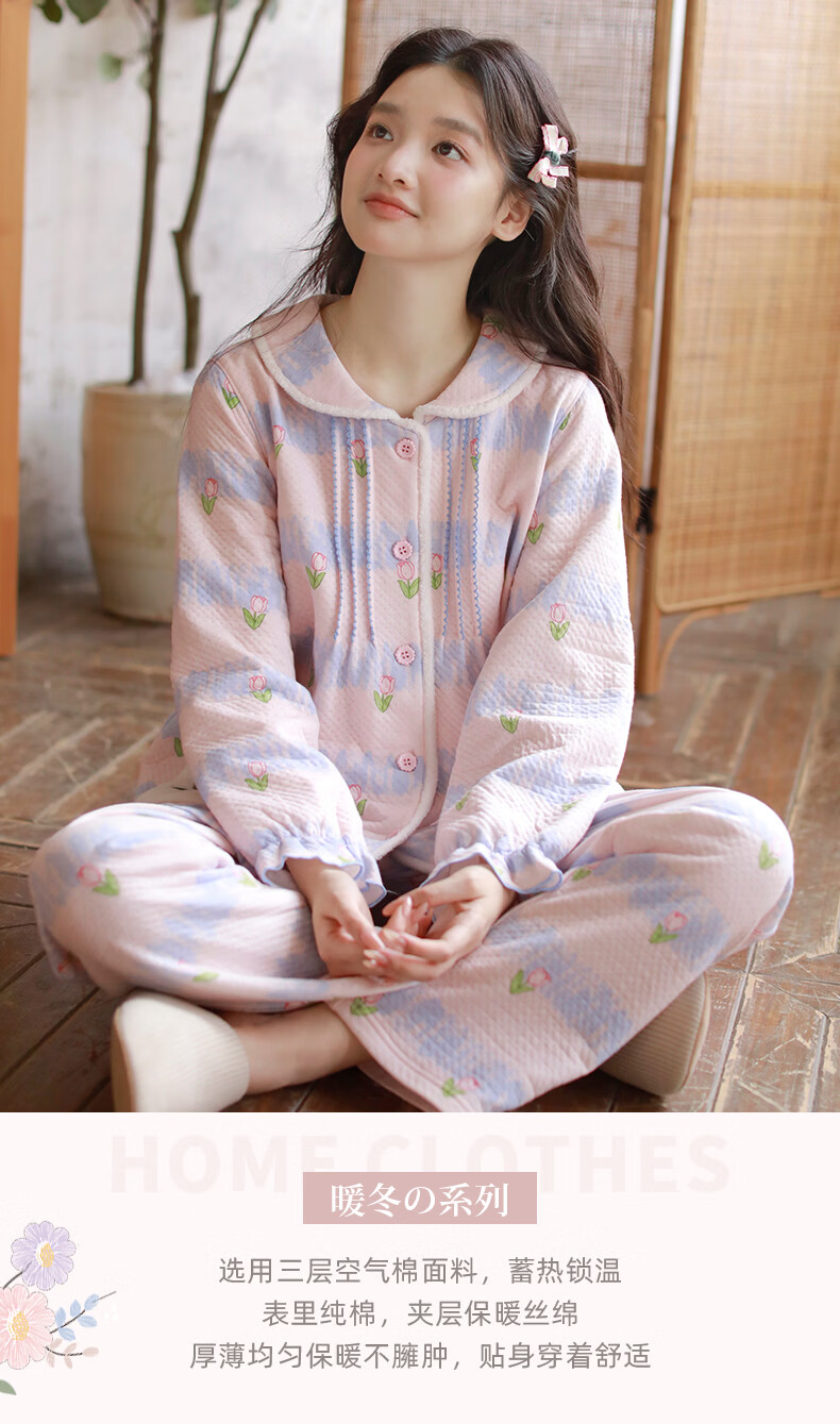 蔓秋 MEJU《郁金香》空气棉翻领长袖长裤家居服女士套装 粉色 L 125斤以内
