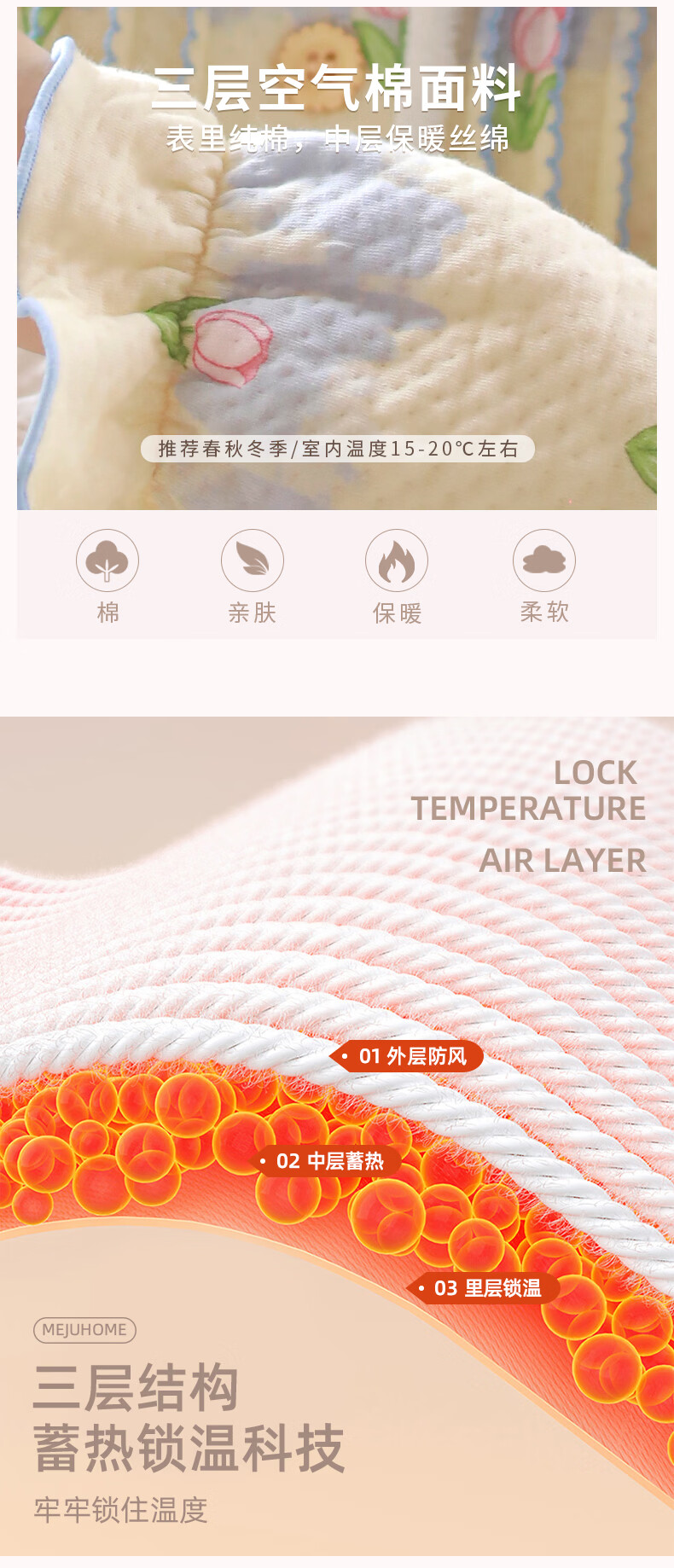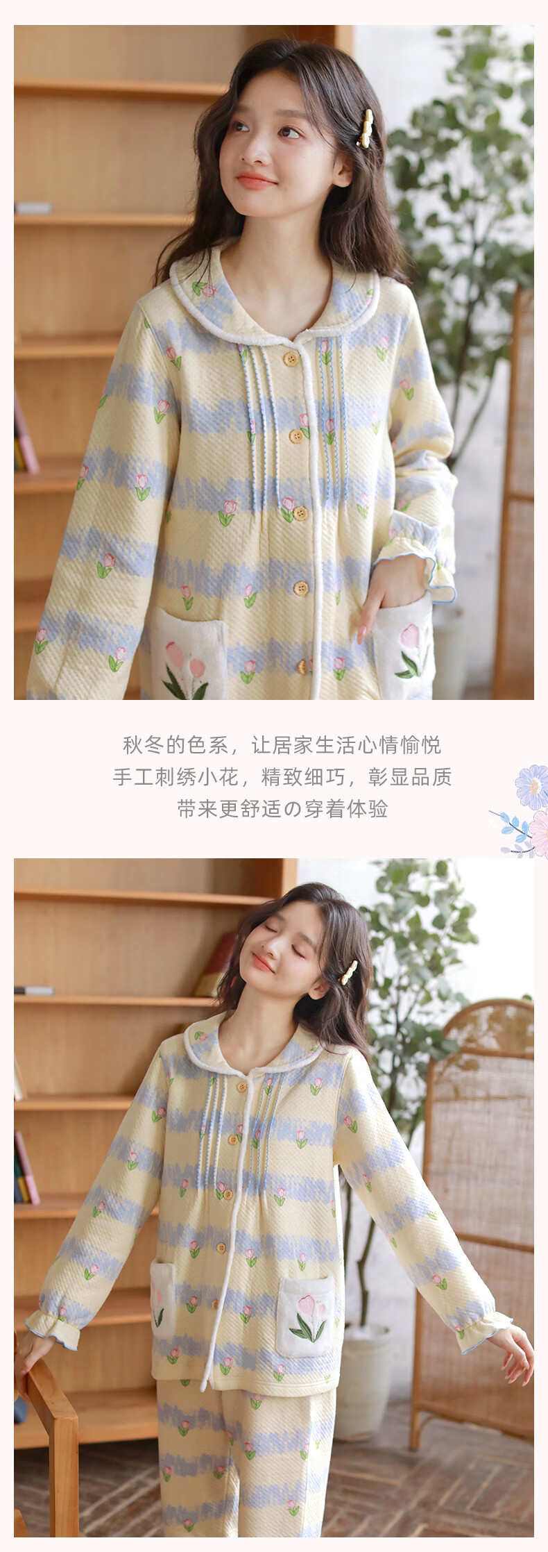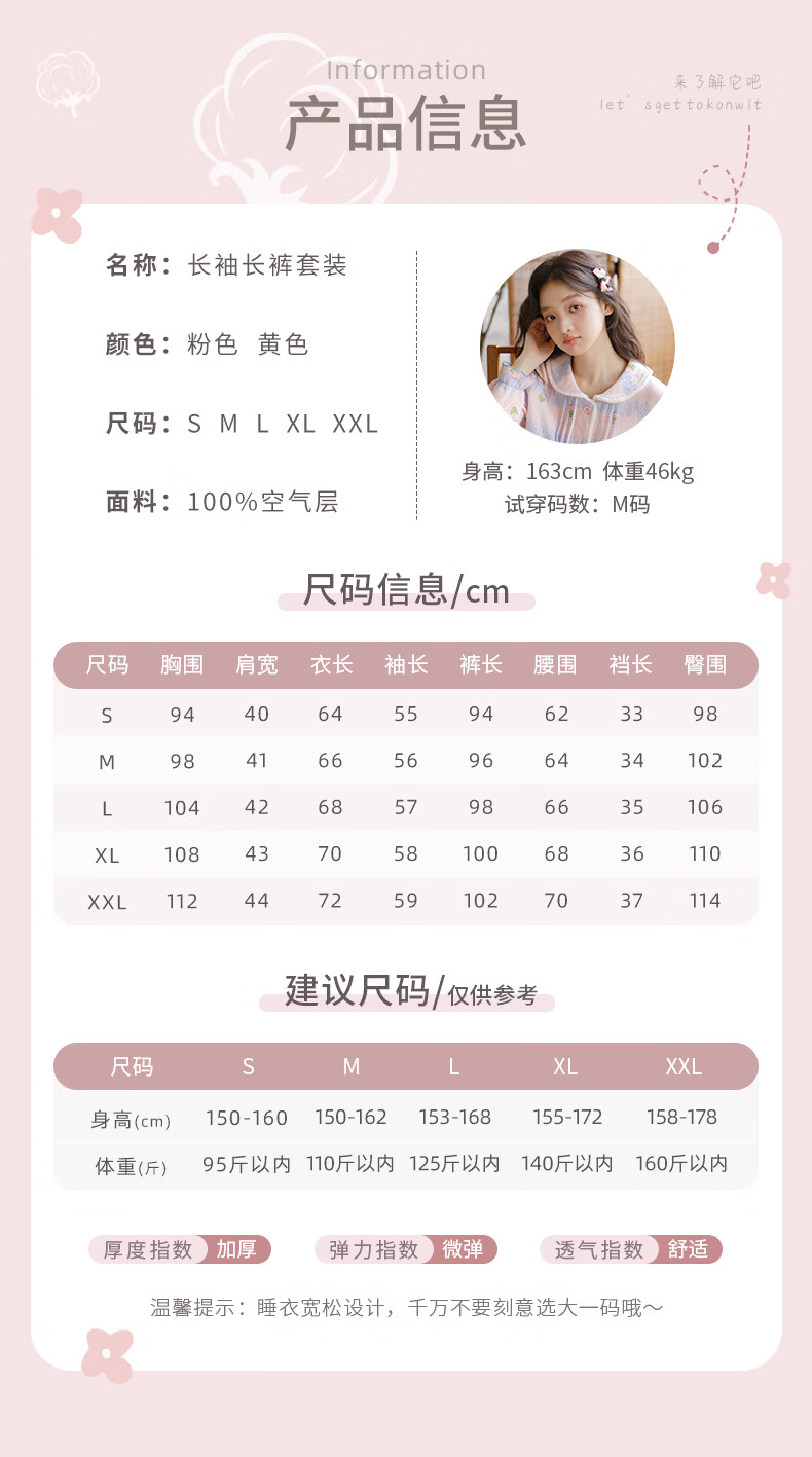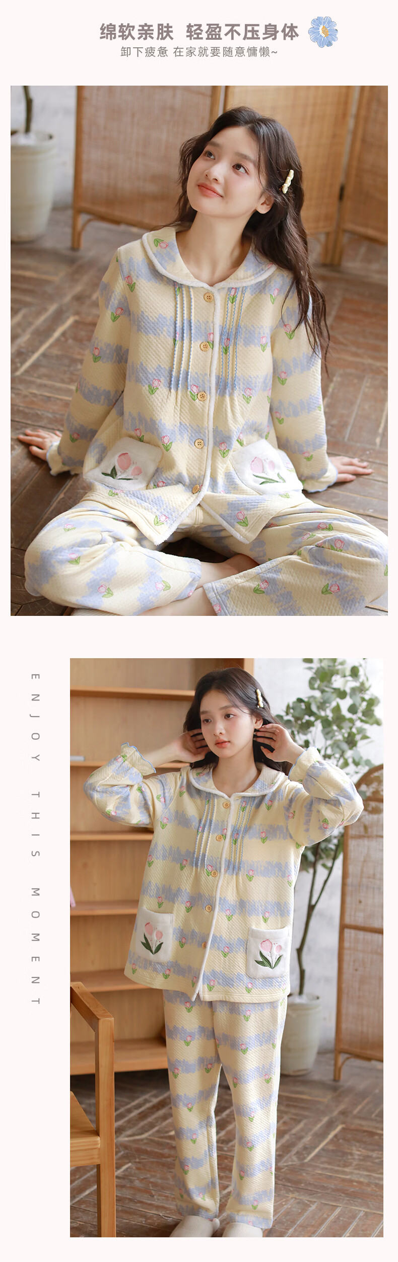 蔓秋 MEJU《郁金香》空气棉翻领长袖长裤家居服女士套装 粉色 L 125斤以内