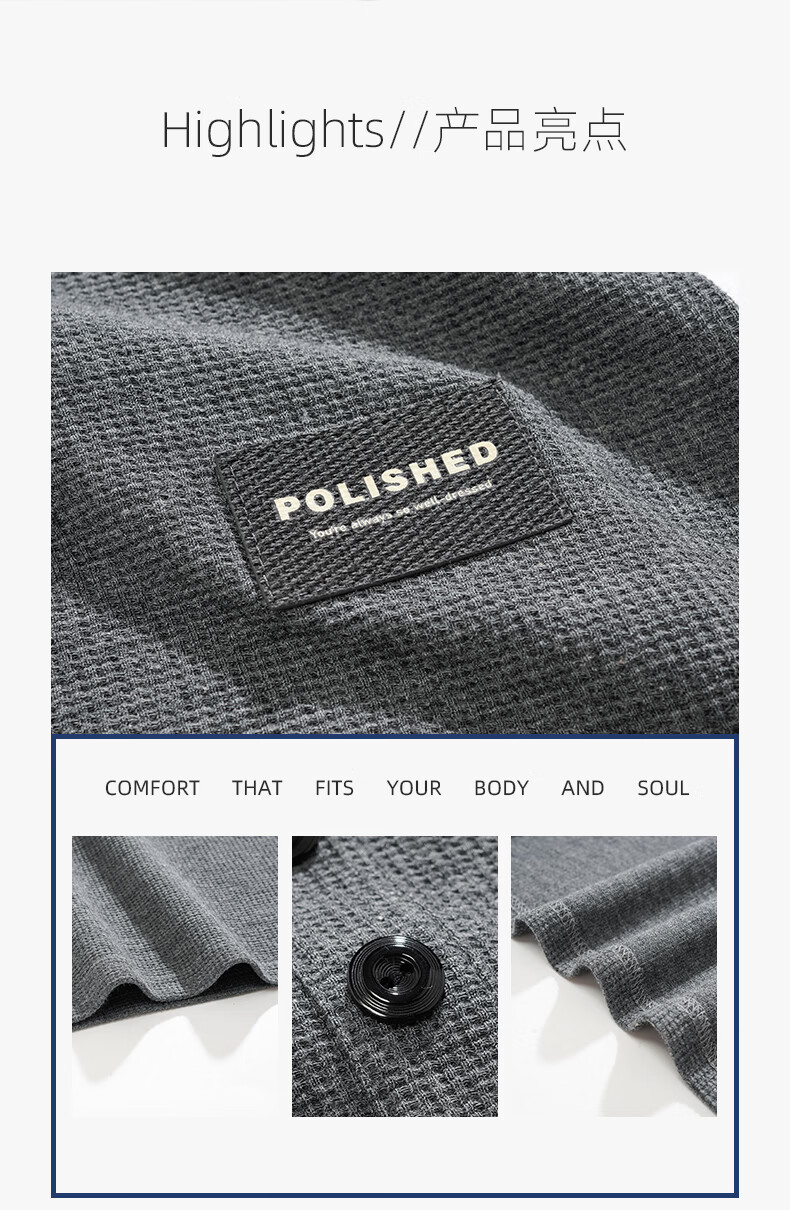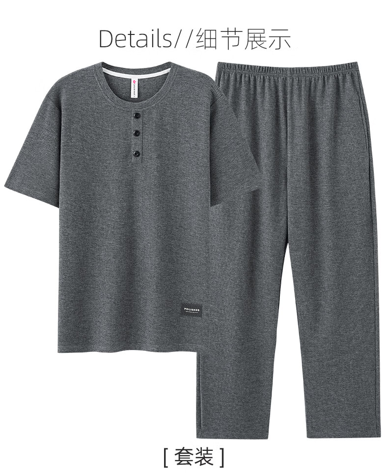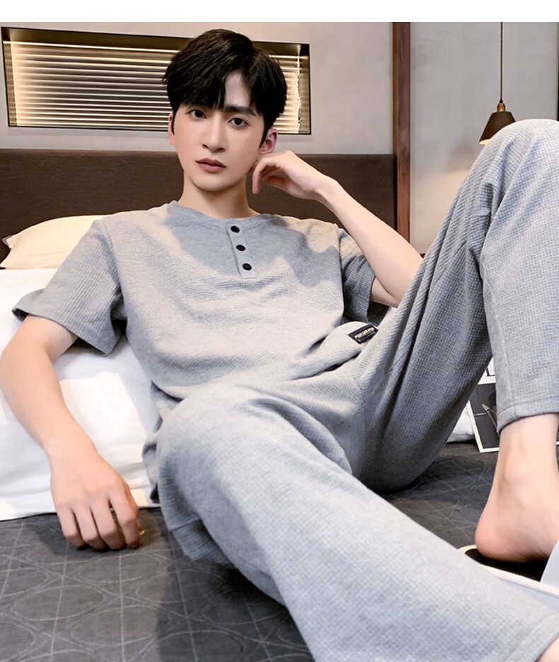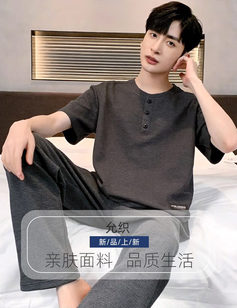 允织华夫格纯棉睡衣男士夏季短袖长裤宽松大码夏天薄款男款家居服套装 2402-深灰 L (170) :建议110-140斤穿着