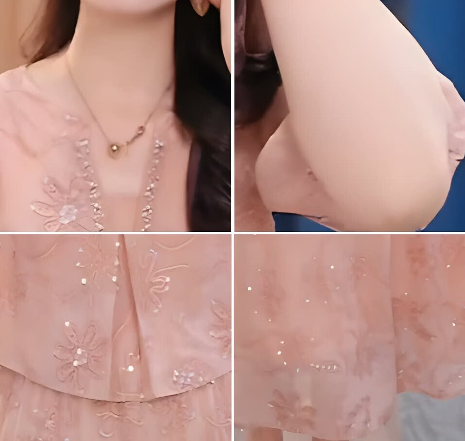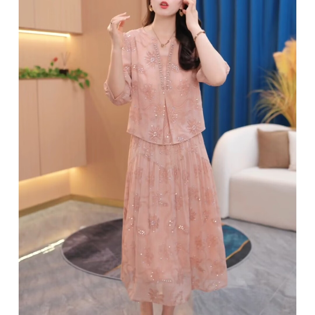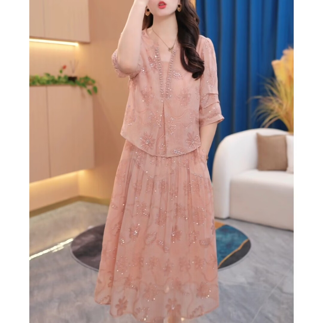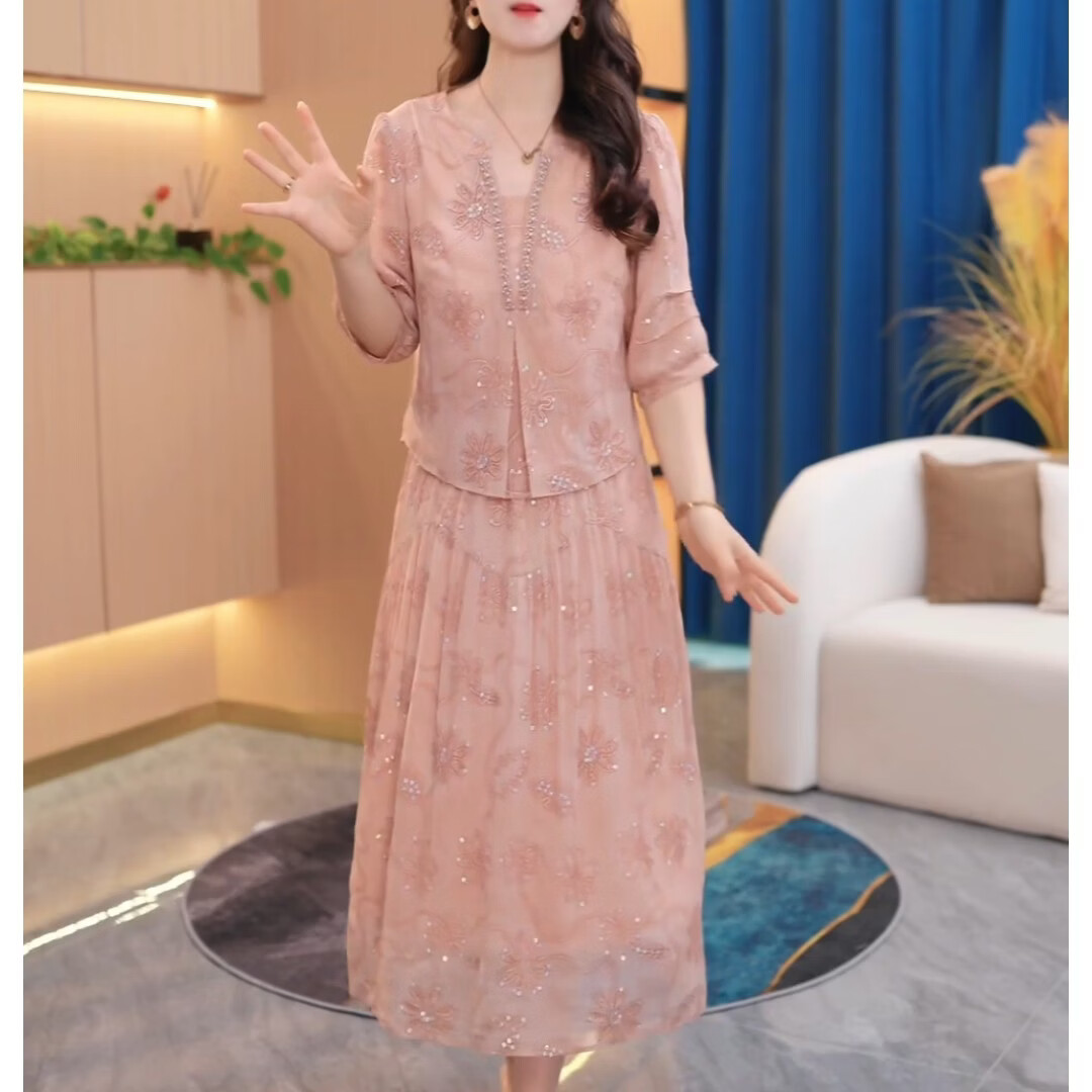 香影芬气质假两件刺绣连衣裙2026年夏季中年妈妈优雅减龄中长款粉色裙子 图片色 M (建议85-100斤)