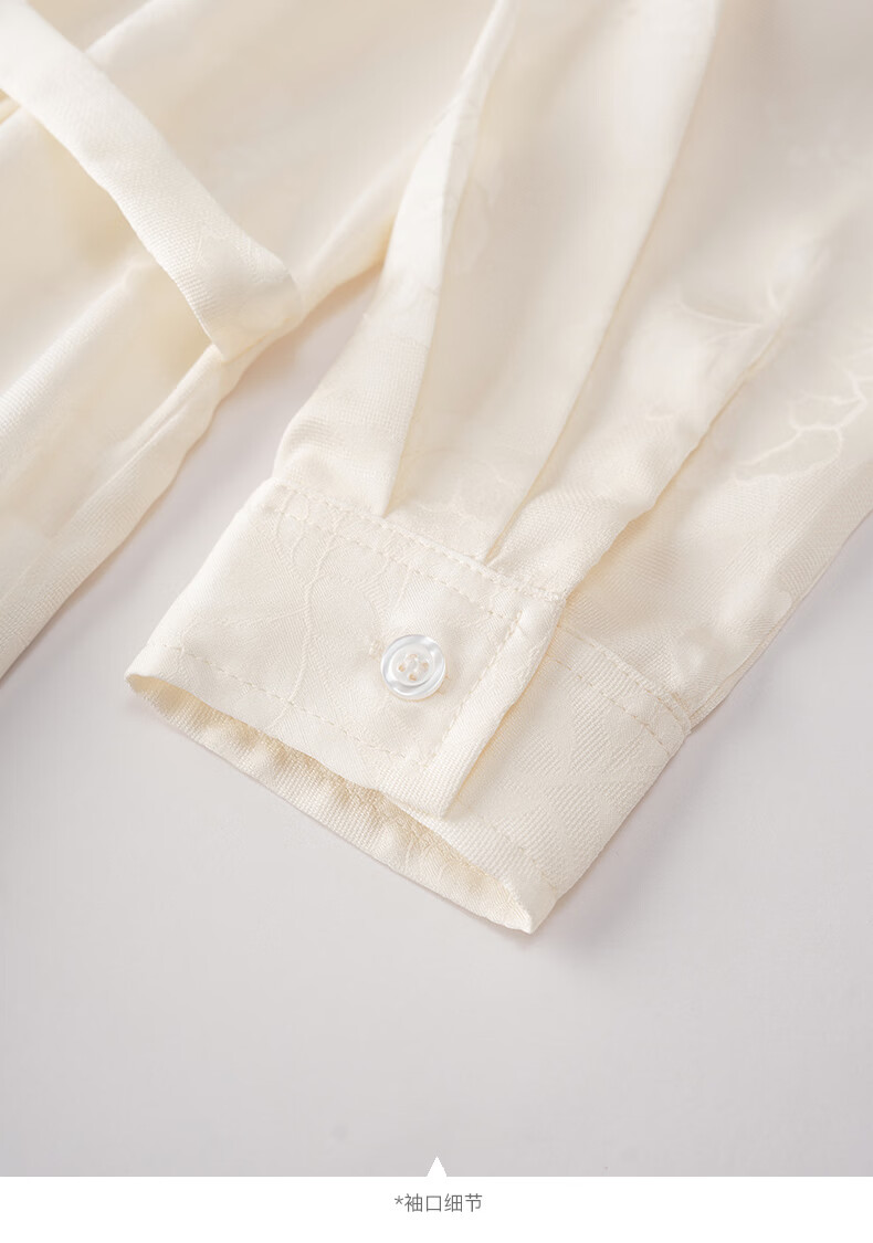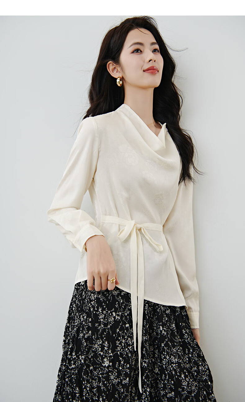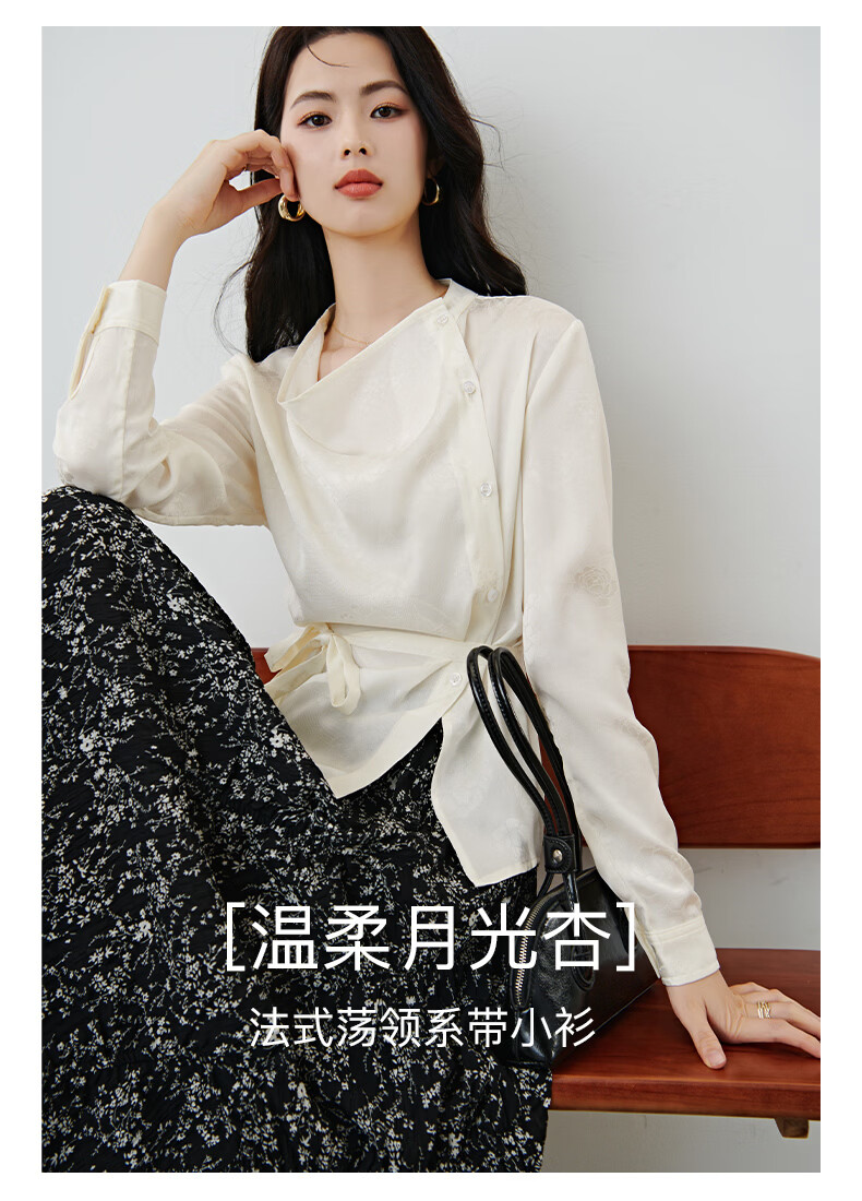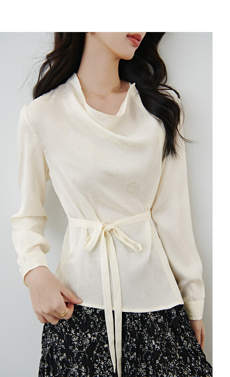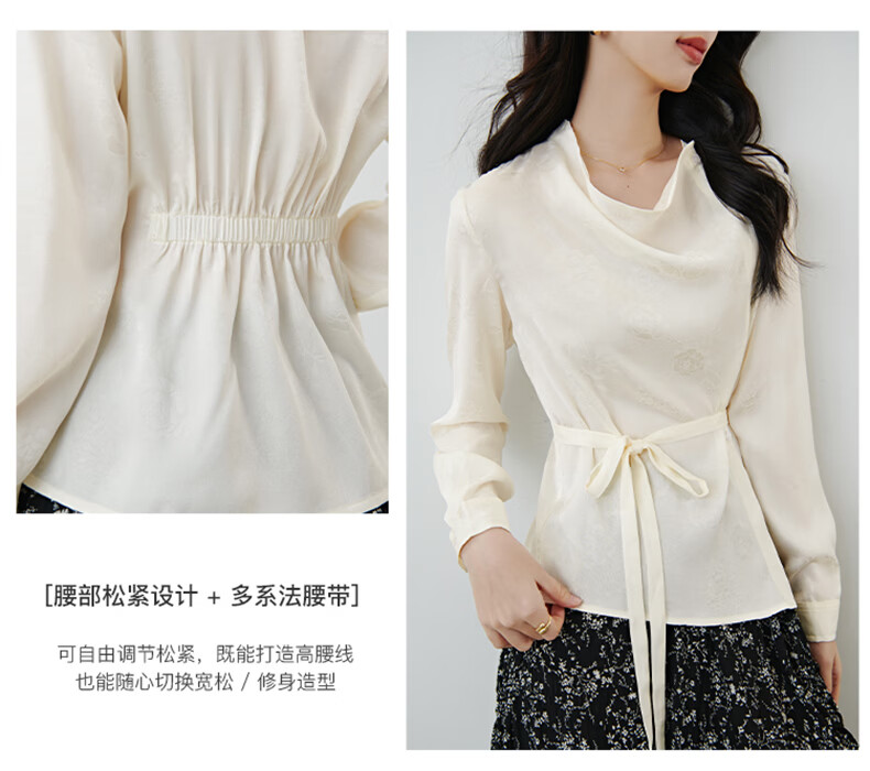 晚白2026春款法式荡领国风暗纹提花上衣系带松紧腰收腰显瘦大码衬衫女 浅杏色 L