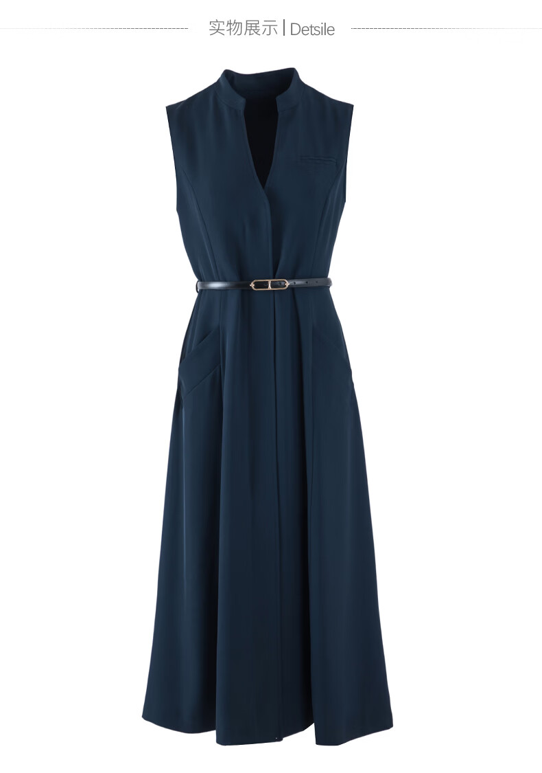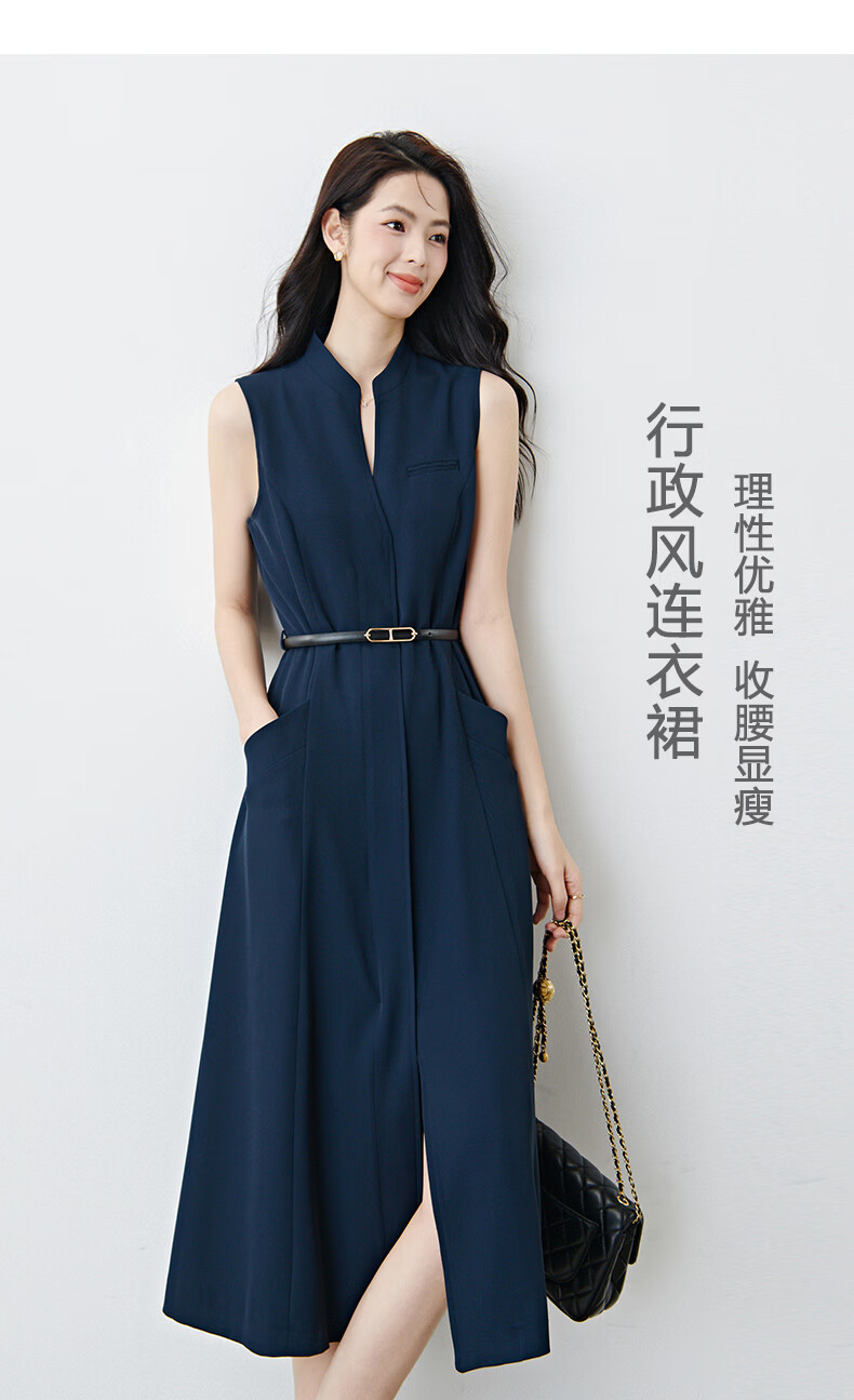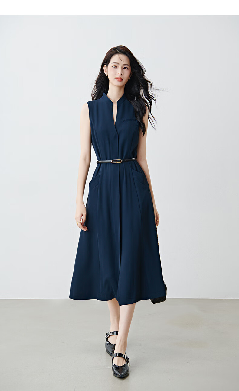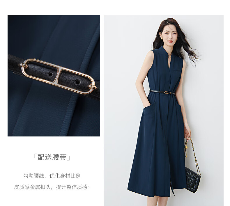 晚白2026年春款气质立领正式场合行政蓝系带收腰垂感无袖连衣裙配腰带 深蓝色 S