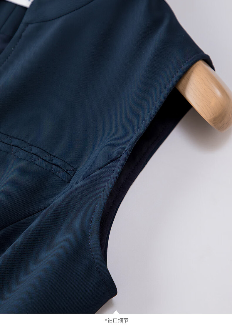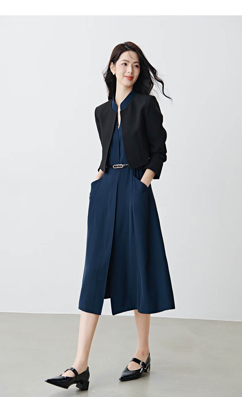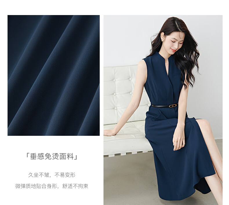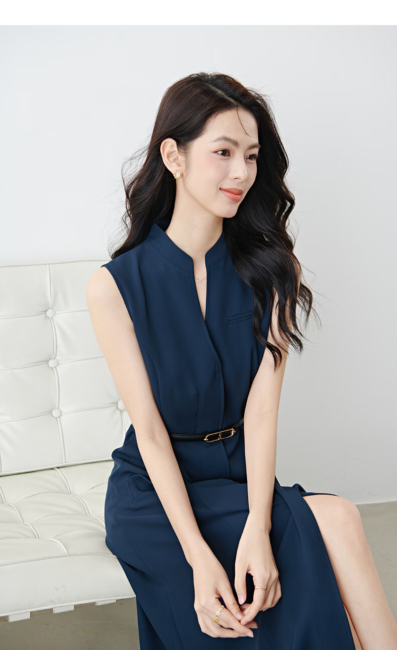 晚白2026年春款气质立领正式场合行政蓝系带收腰垂感无袖连衣裙配腰带 深蓝色 S