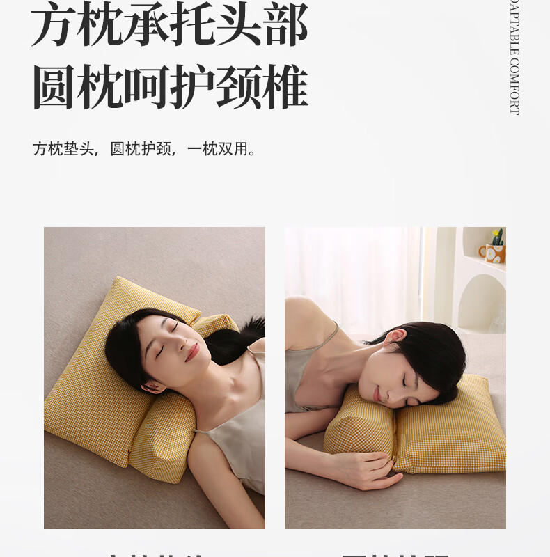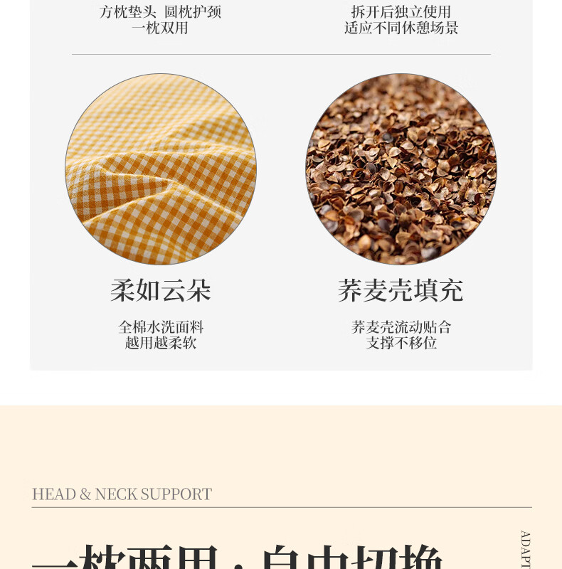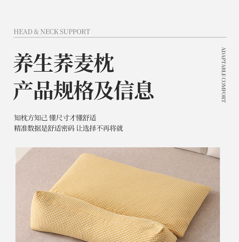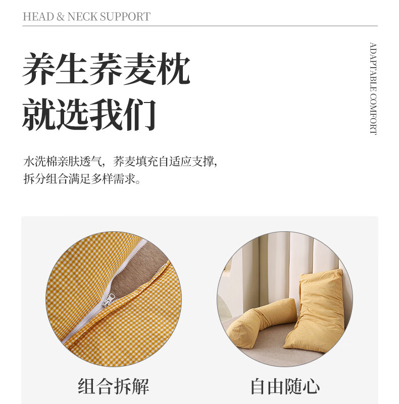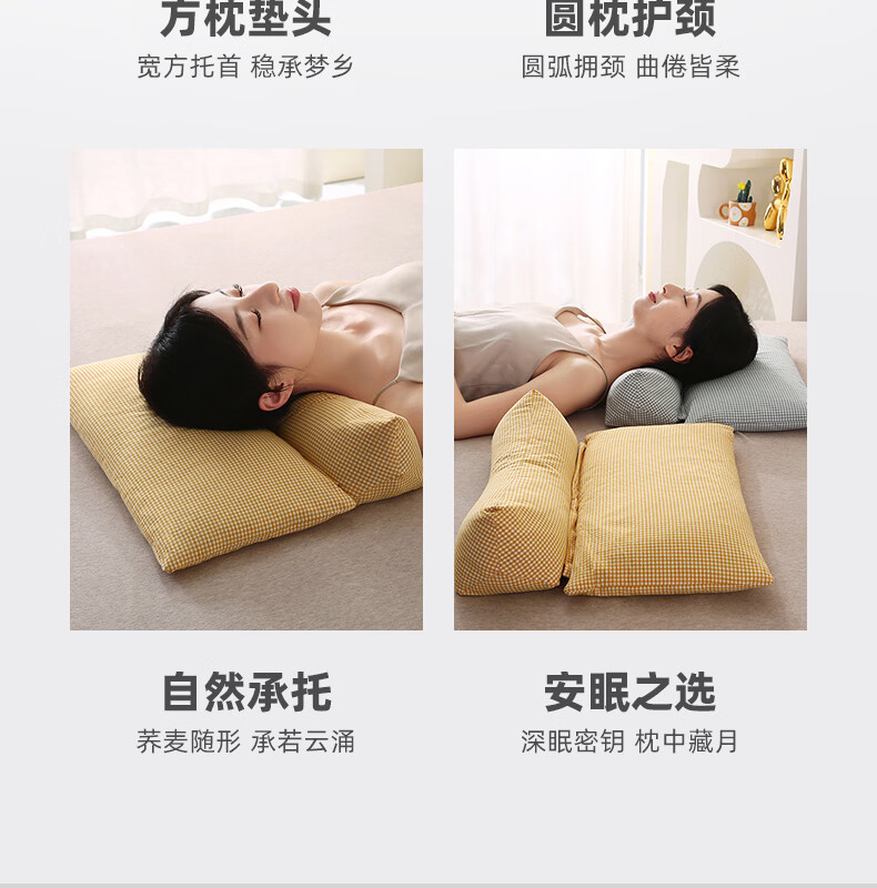 南极人(Nanjiren)全棉荞麦枕头单人枕芯枕头护颈枕颈椎病深度睡眠专用枕头成人一对 【牵引分区组合枕】小黄格小号【方枕40*22cm】