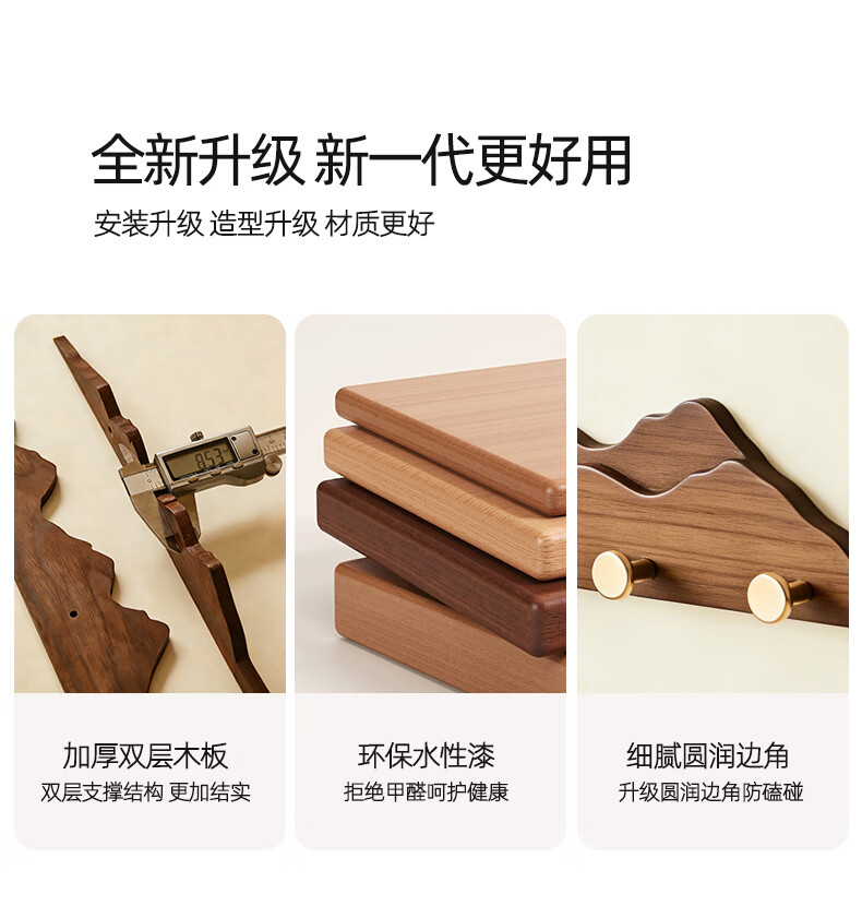 诗元中古风实木挂衣架壁挂墙上挂衣钩入户玄关免打孔高级感装饰衣帽架 【波浪星球】胡桃木色-4钩(打孔/免打孔 赠送配件)