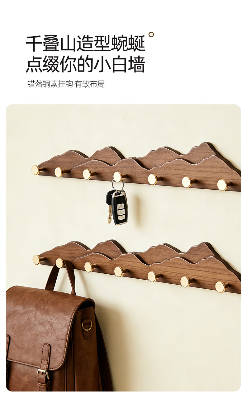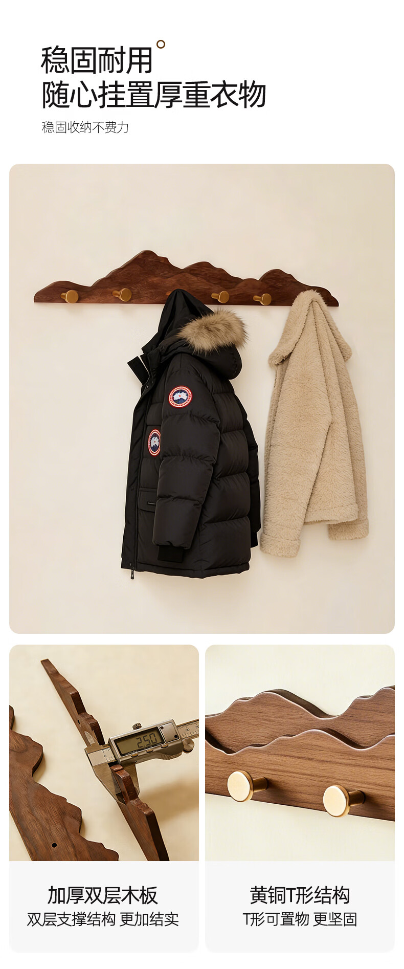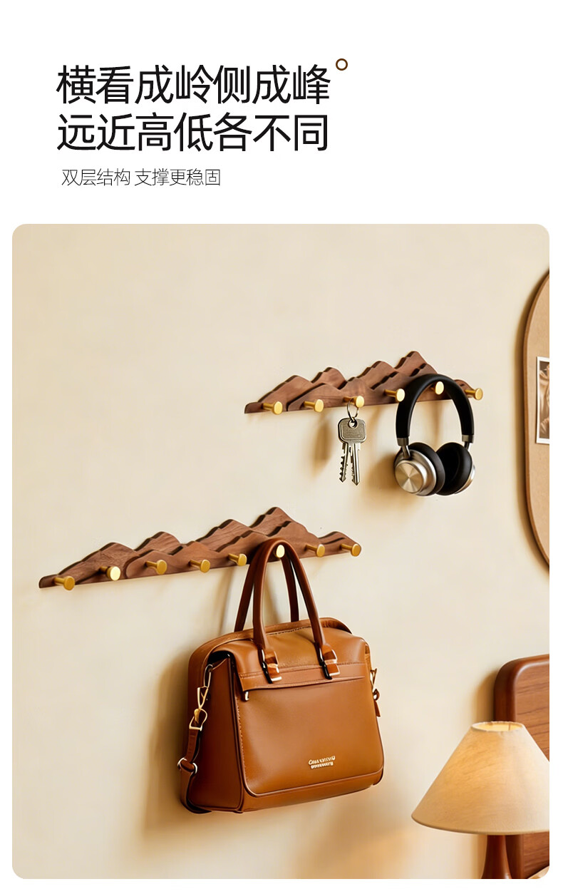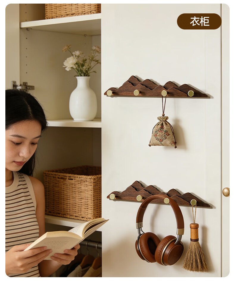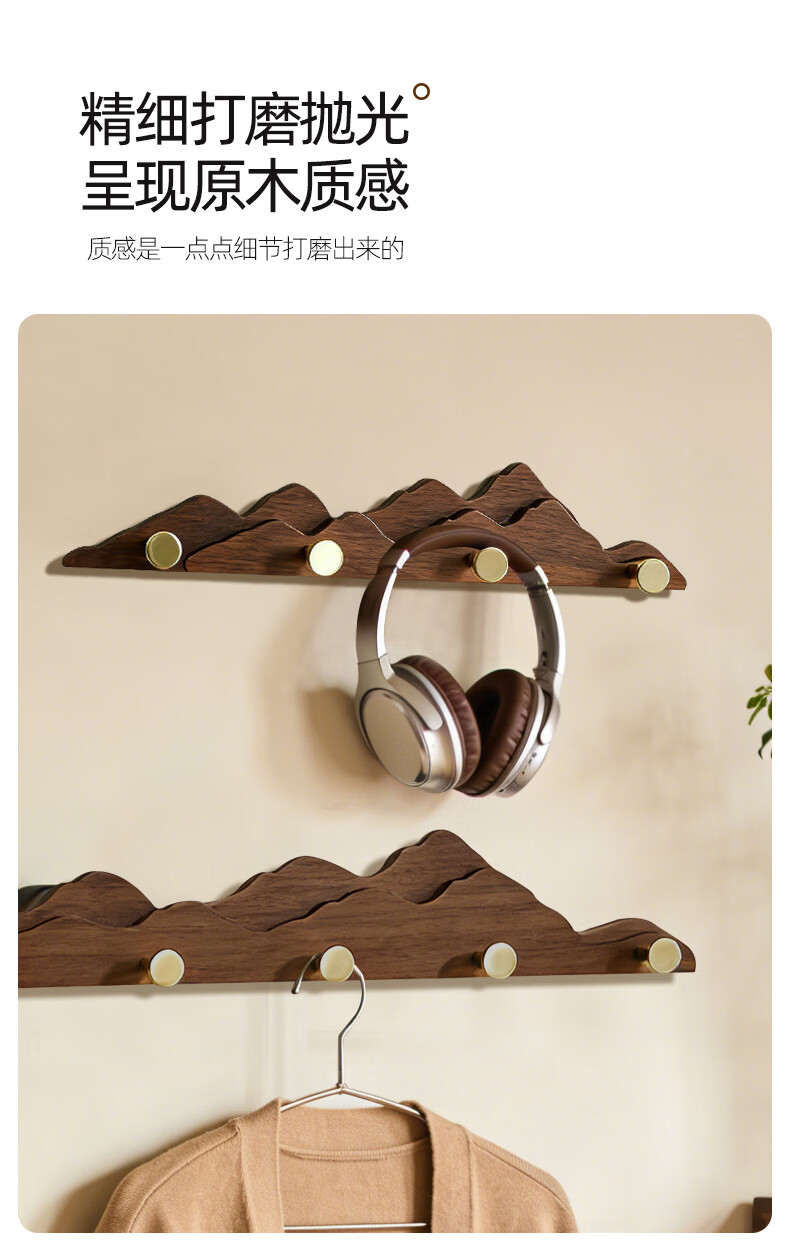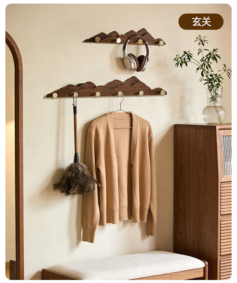 诗元挂衣架墙上壁挂入户门口玄关挂衣钩进门后衣帽架衣服挂钩免打孔 「千叠山」实木/胡桃木纹-6钩 赠送两种安装配件