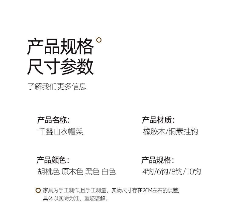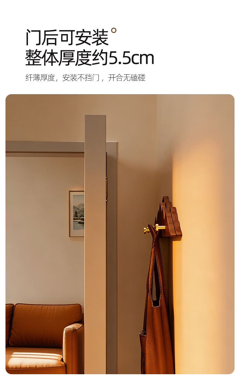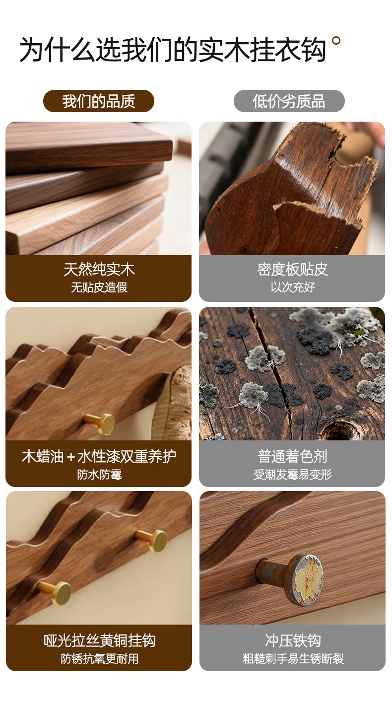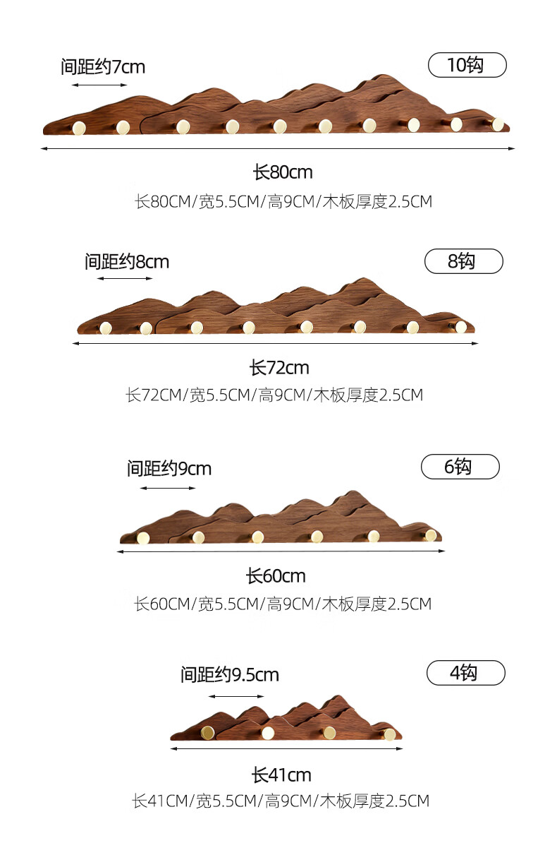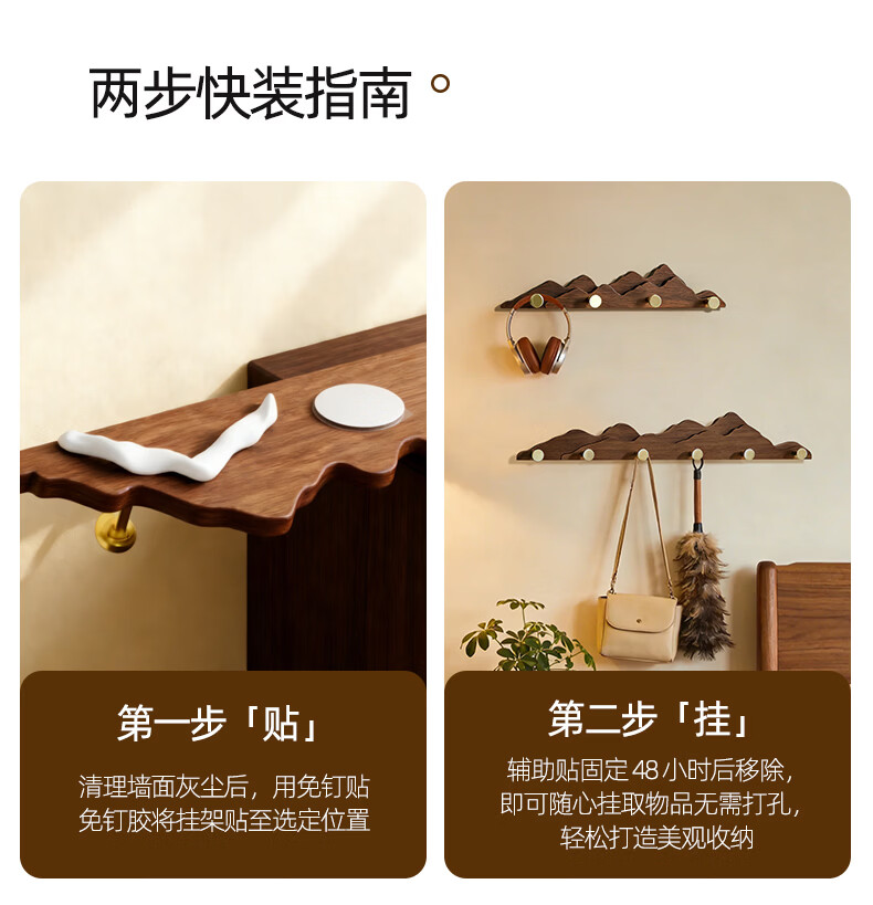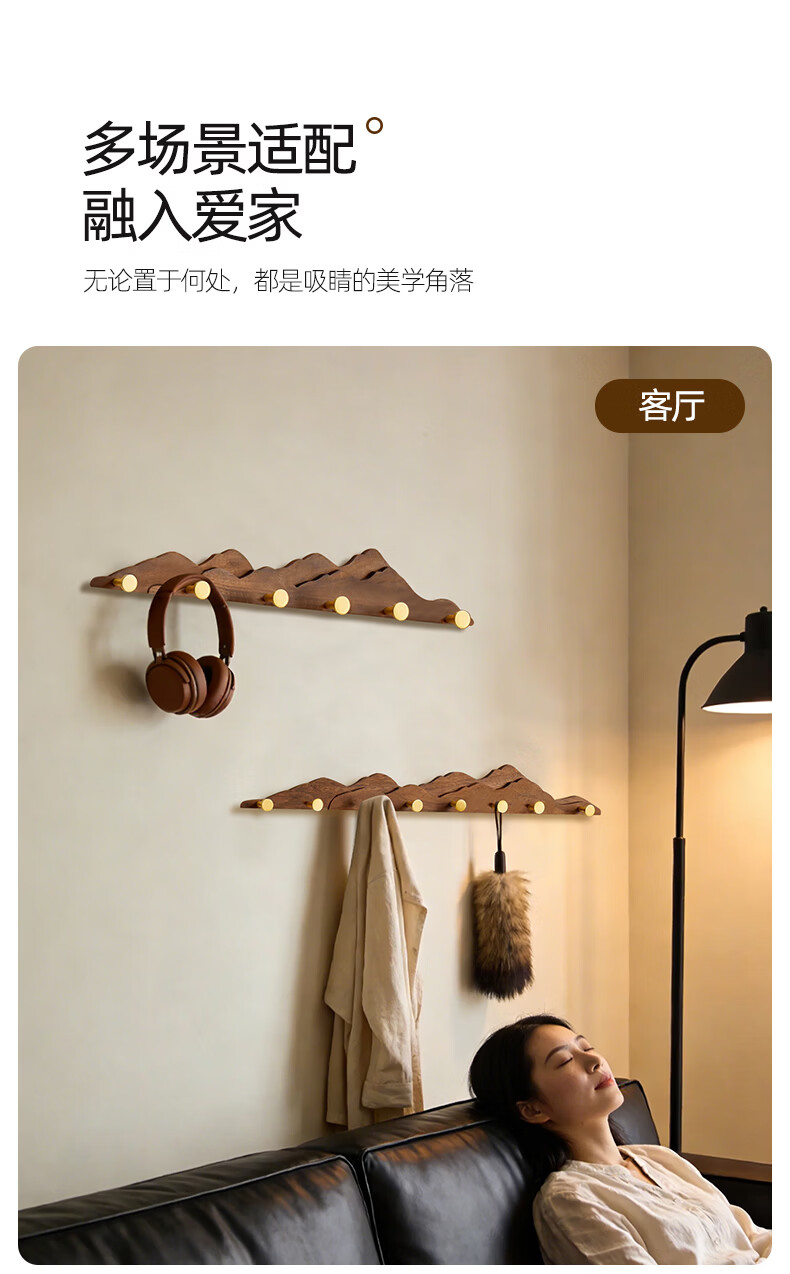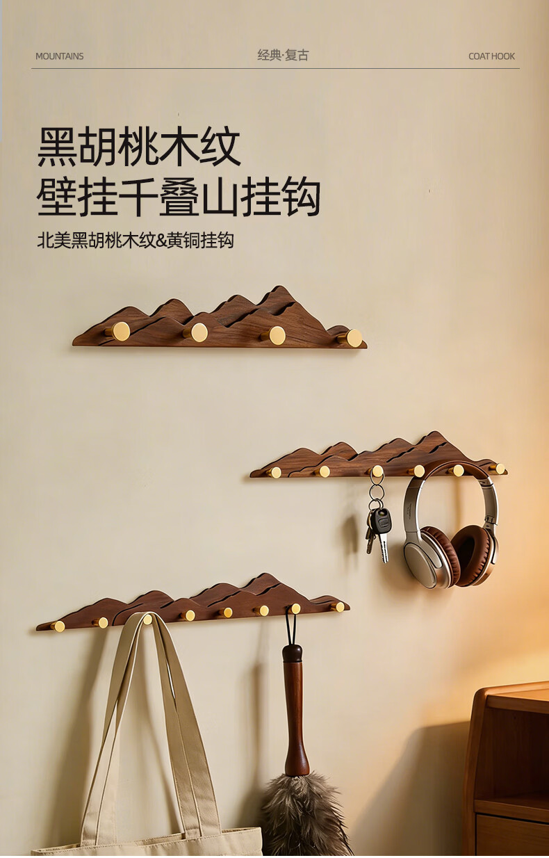 诗元挂衣架墙上壁挂入户门口玄关挂衣钩进门后衣帽架衣服挂钩免打孔 「千叠山」实木/胡桃木纹-6钩 赠送两种安装配件
