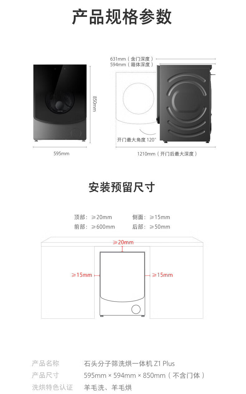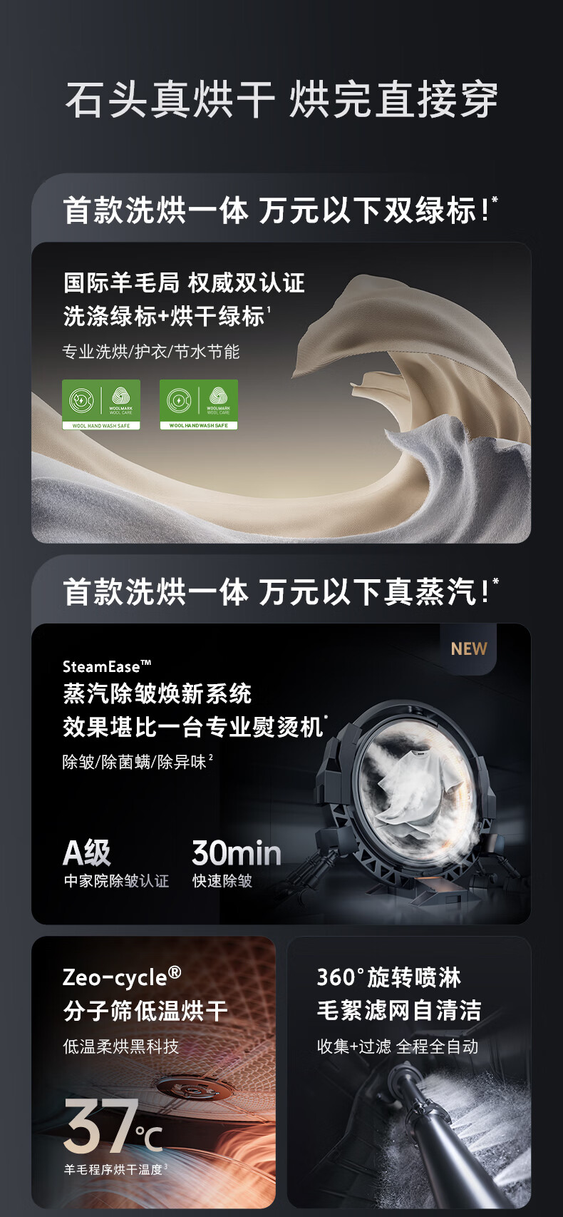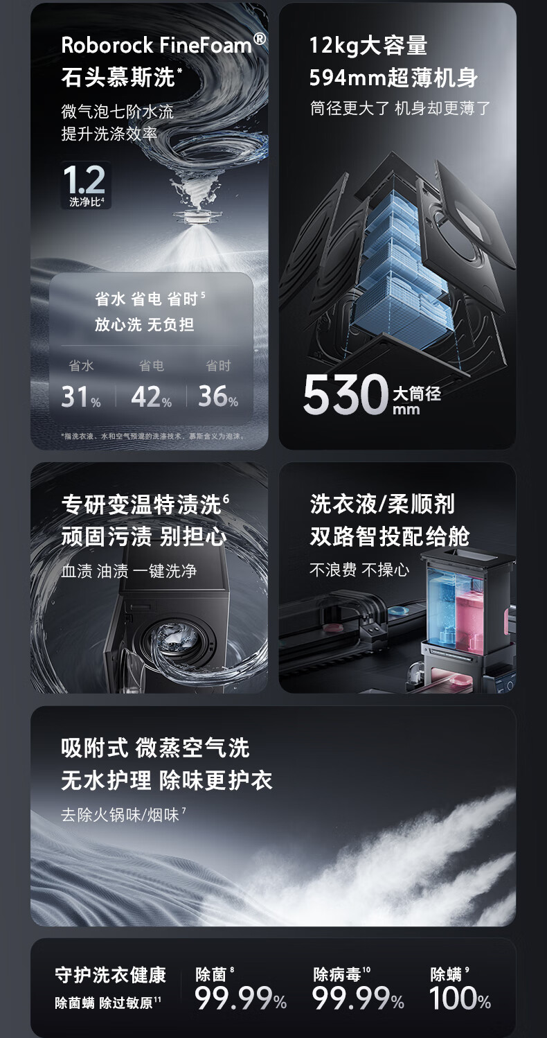 石头分子筛洗烘一体机Z1 Plus 12kg全自动滚筒带烘干洗衣机 蒸汽除皱 国家补贴 黑曜石XQGH120RR203