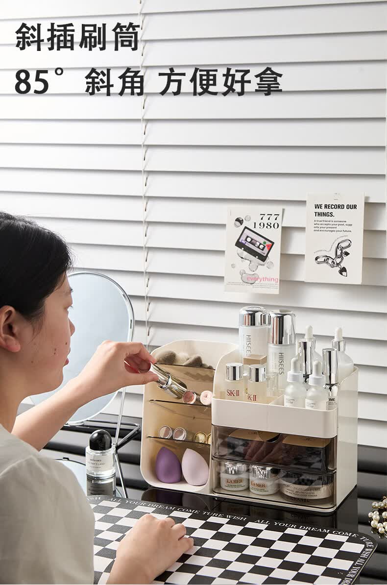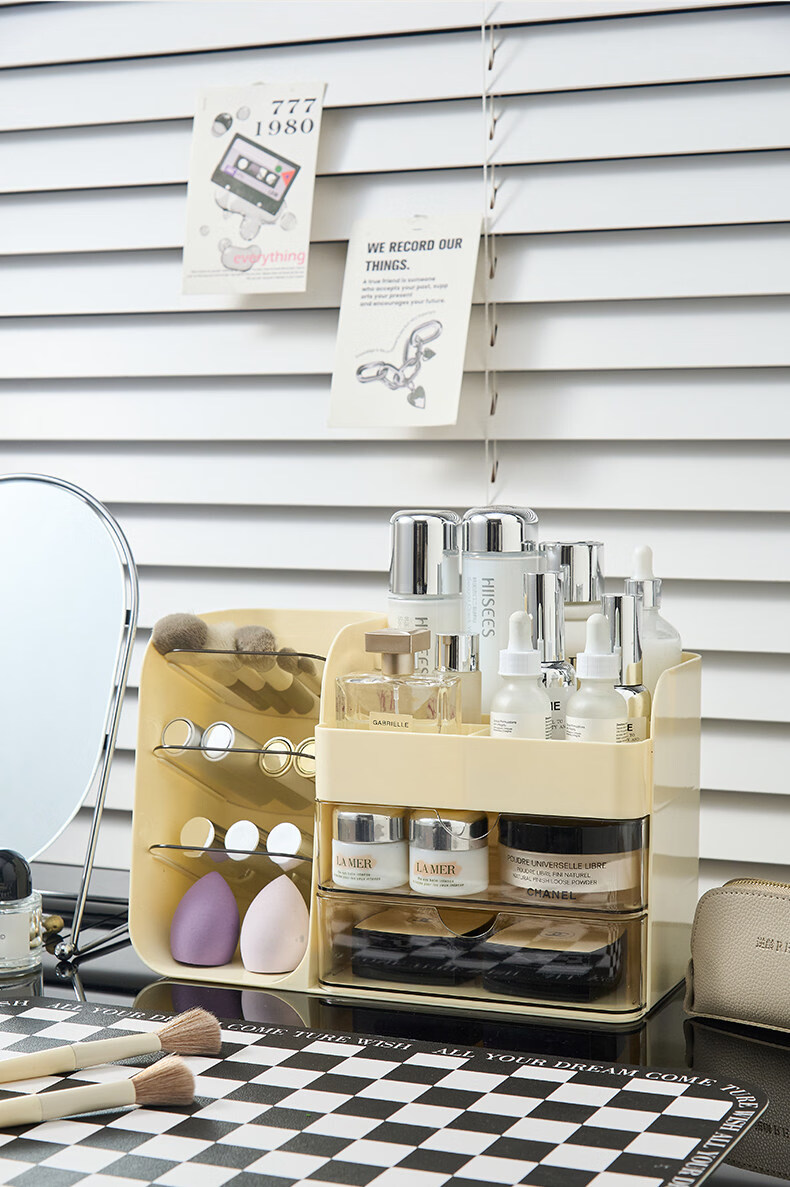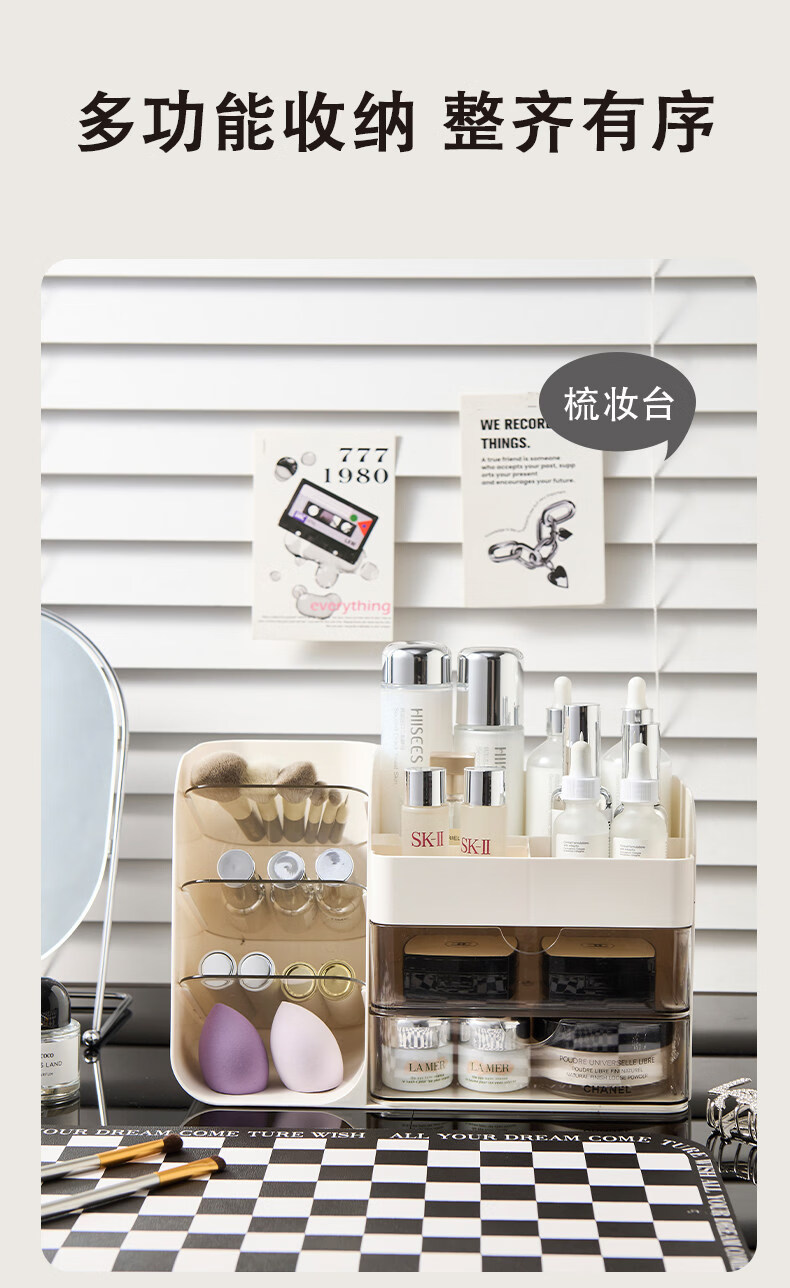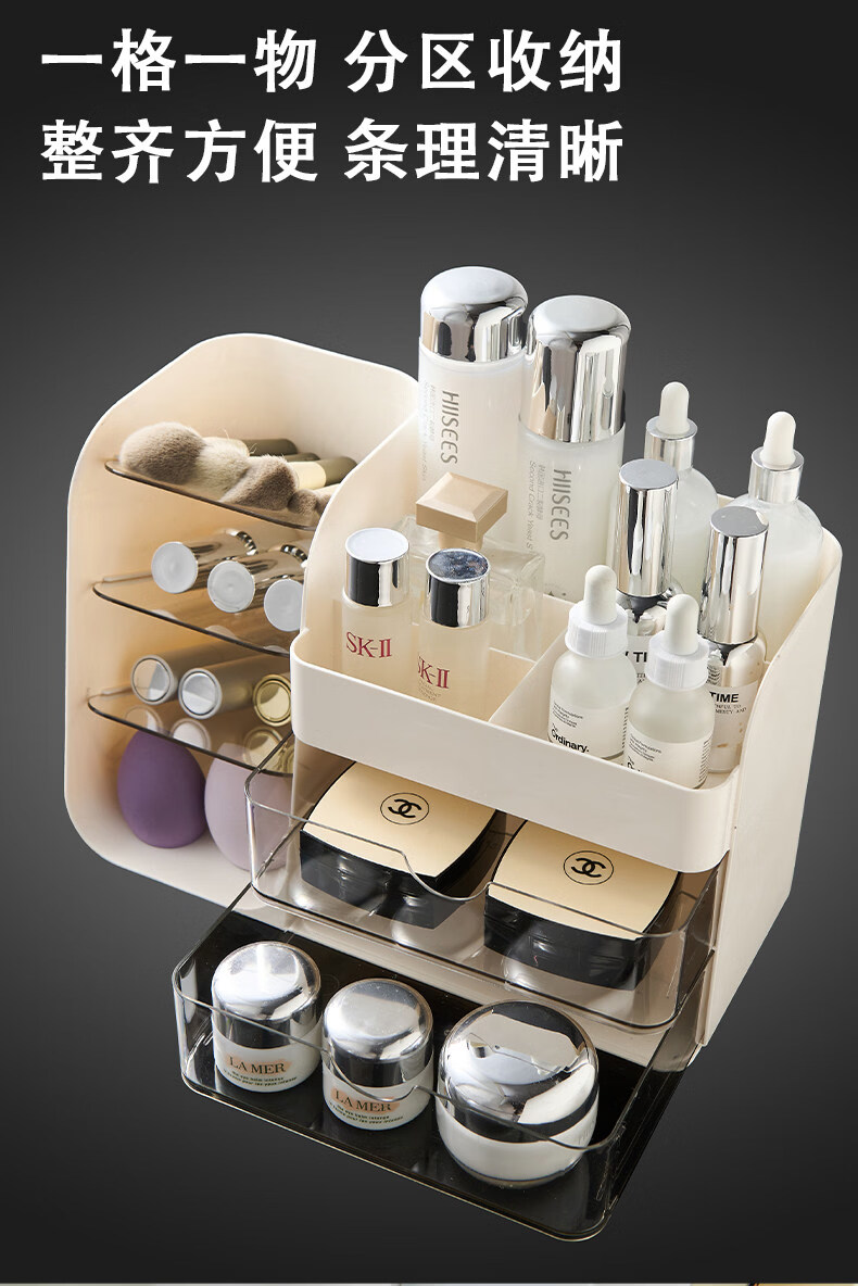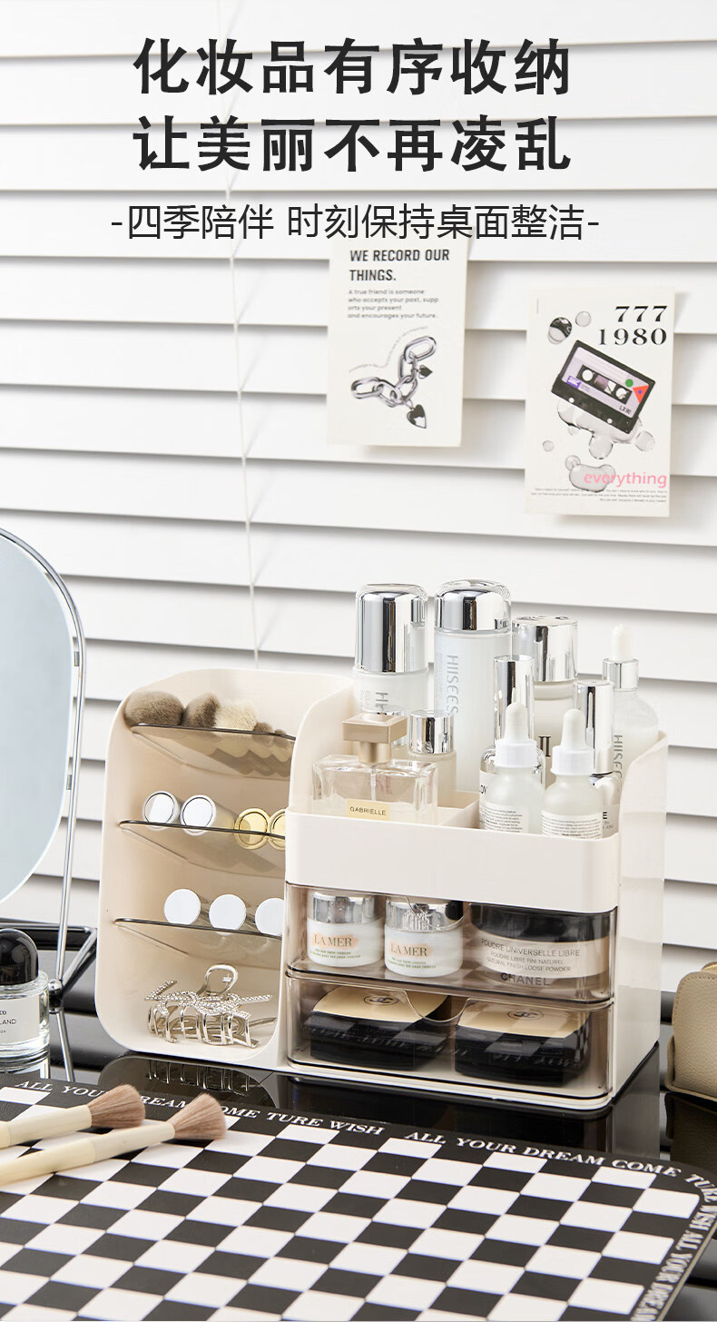 艾仕可(ASCOR)化妆品收纳盒高级感梳妆台桌面口红眉笔整理箱护肤品大容量置物架 化妆品收纳盒-奶油白【桌面组合丨分格设计】
